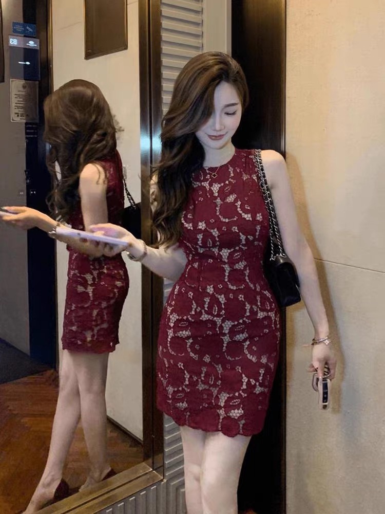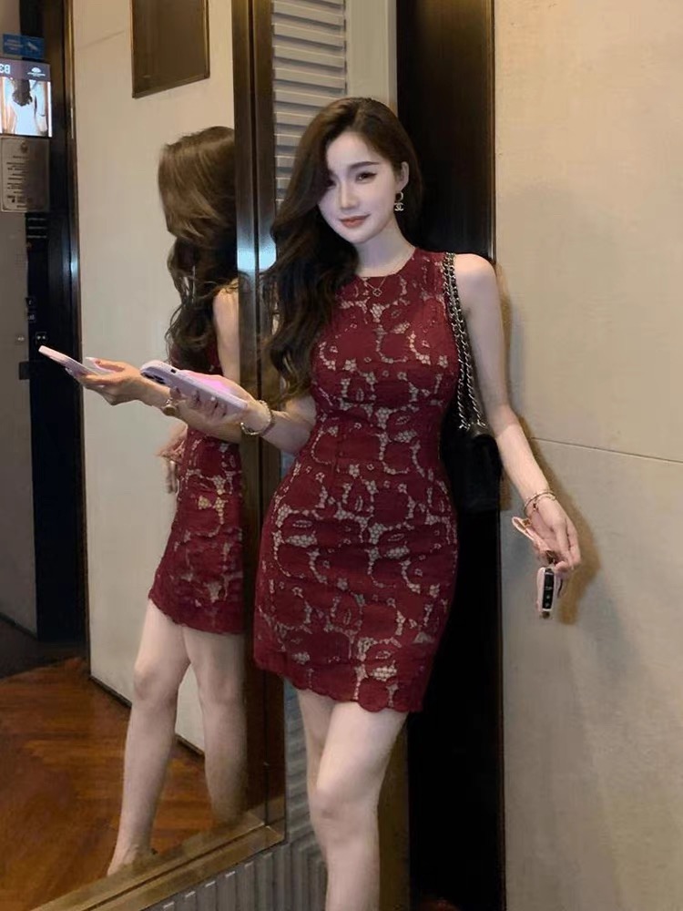 法式纯欲性感红色蕾丝连衣裙女气质收腰显白包臀短裙 服裝批發女裝批發服飾貨源