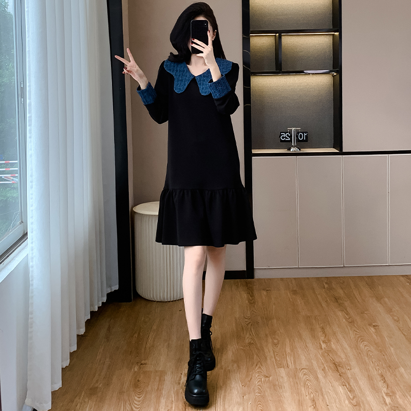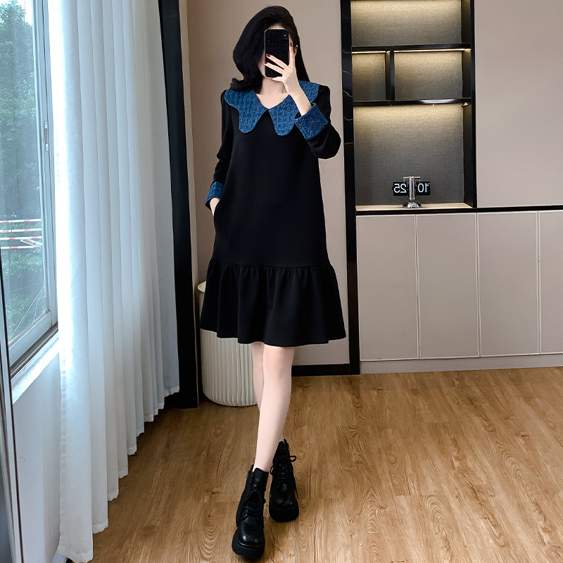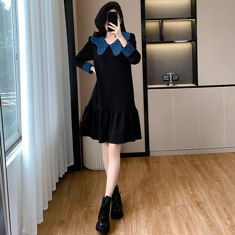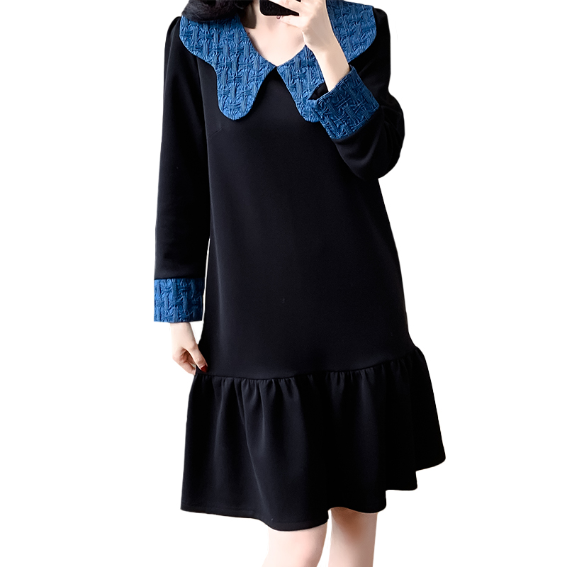 高端精致撞色拼接娃娃领长袖连衣裙秋冬气质减龄显瘦荷叶边裙百搭 服裝批發女裝批發服飾貨源