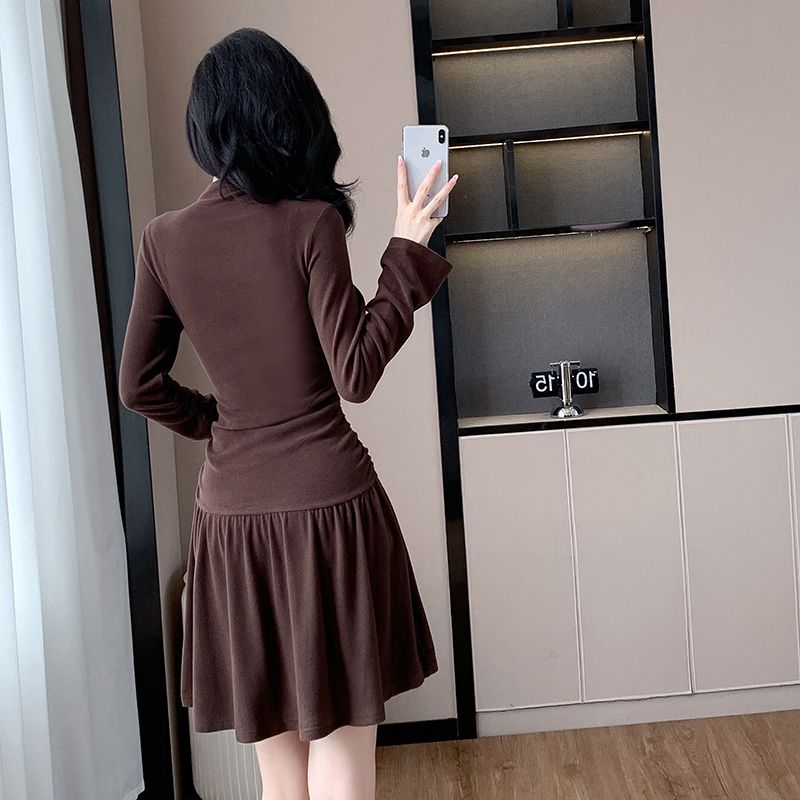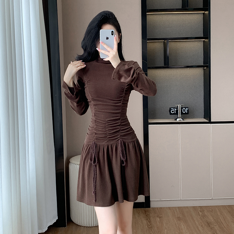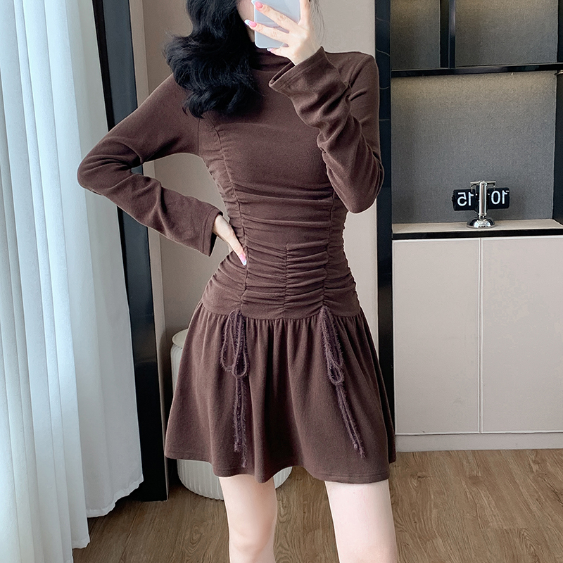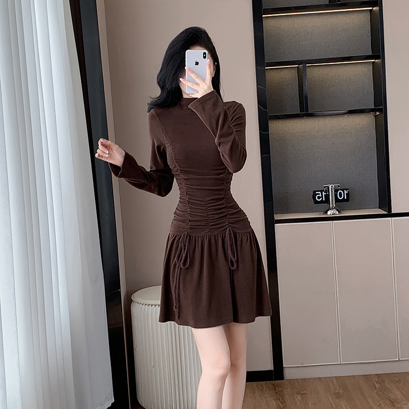 实力显瘦内搭冷烟棕修身短款抽褶针织连衣裙 服裝批發女裝批發服飾貨源