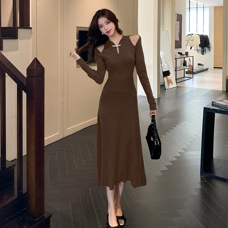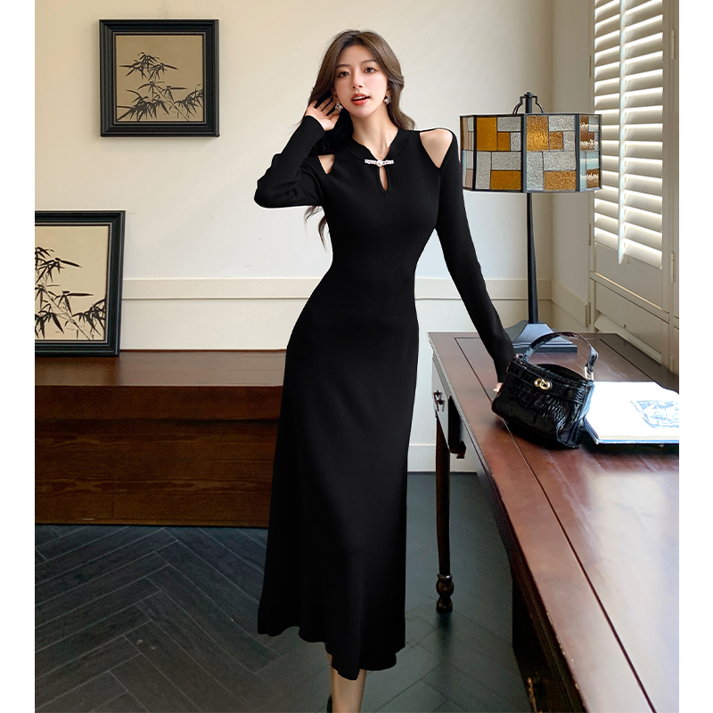 FA46615# 秋冬新款新中式改良旗袍假两件缕空针织连衣裙打底毛衣长裙女
