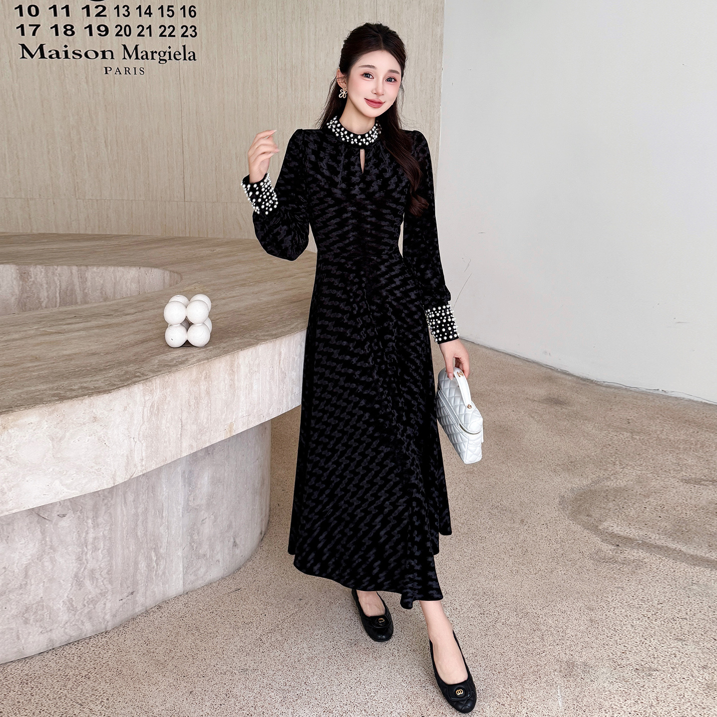 FA46633# 秋冬大码钉珠重工名媛风气质大摆赫本风黑色丝绒连衣裙