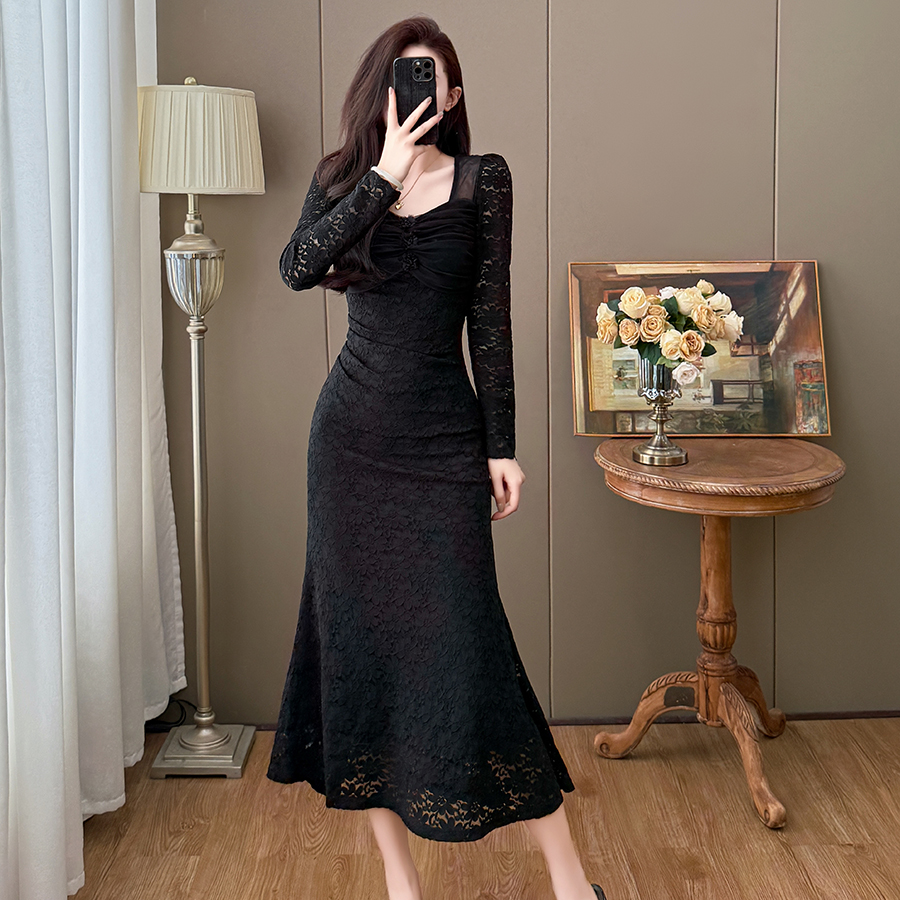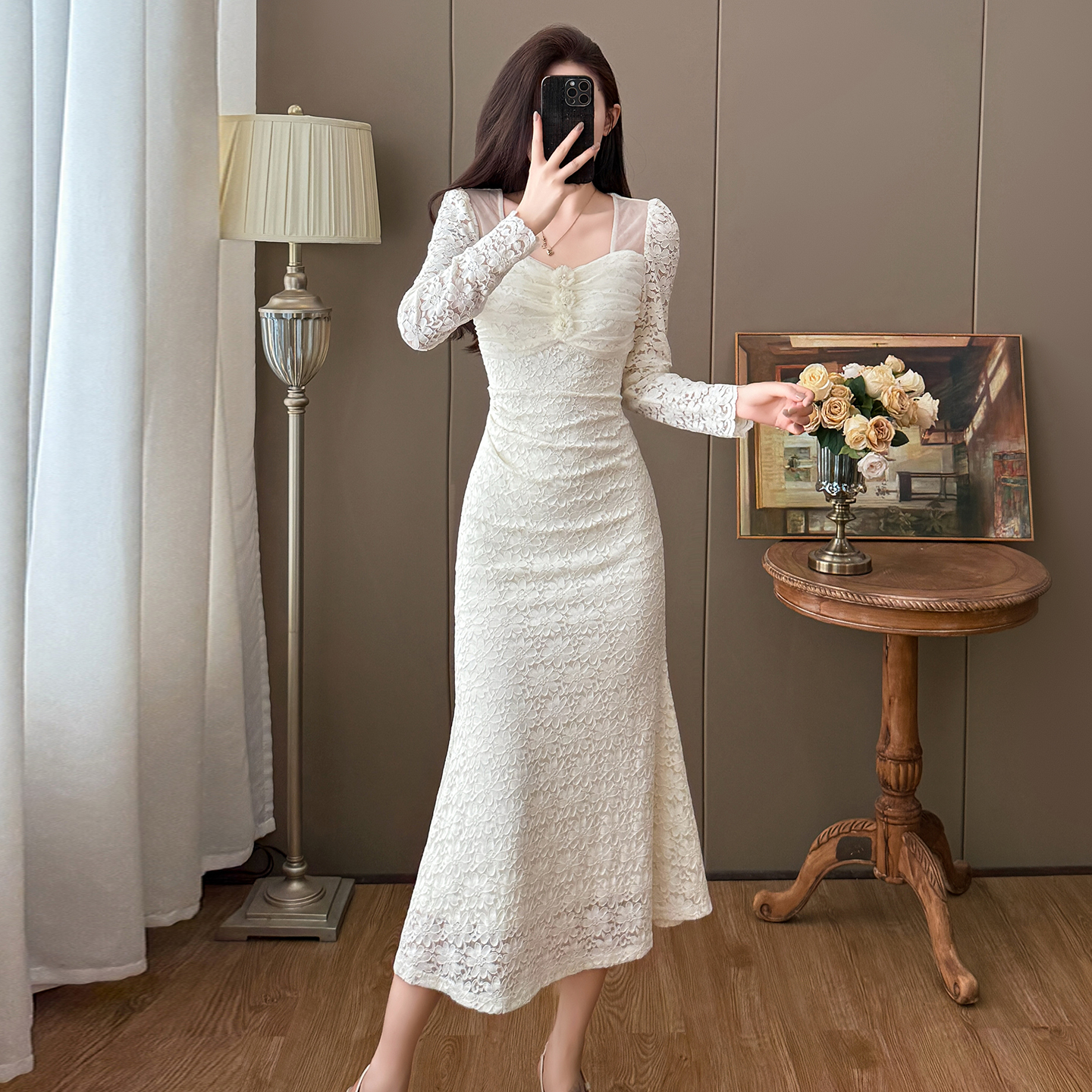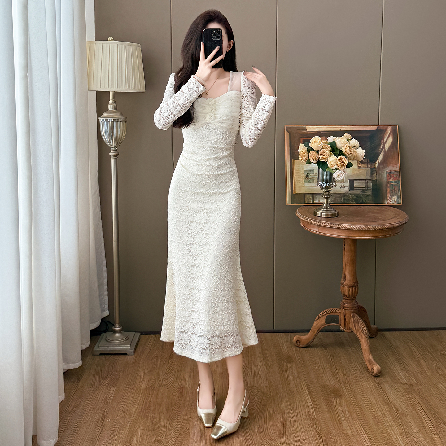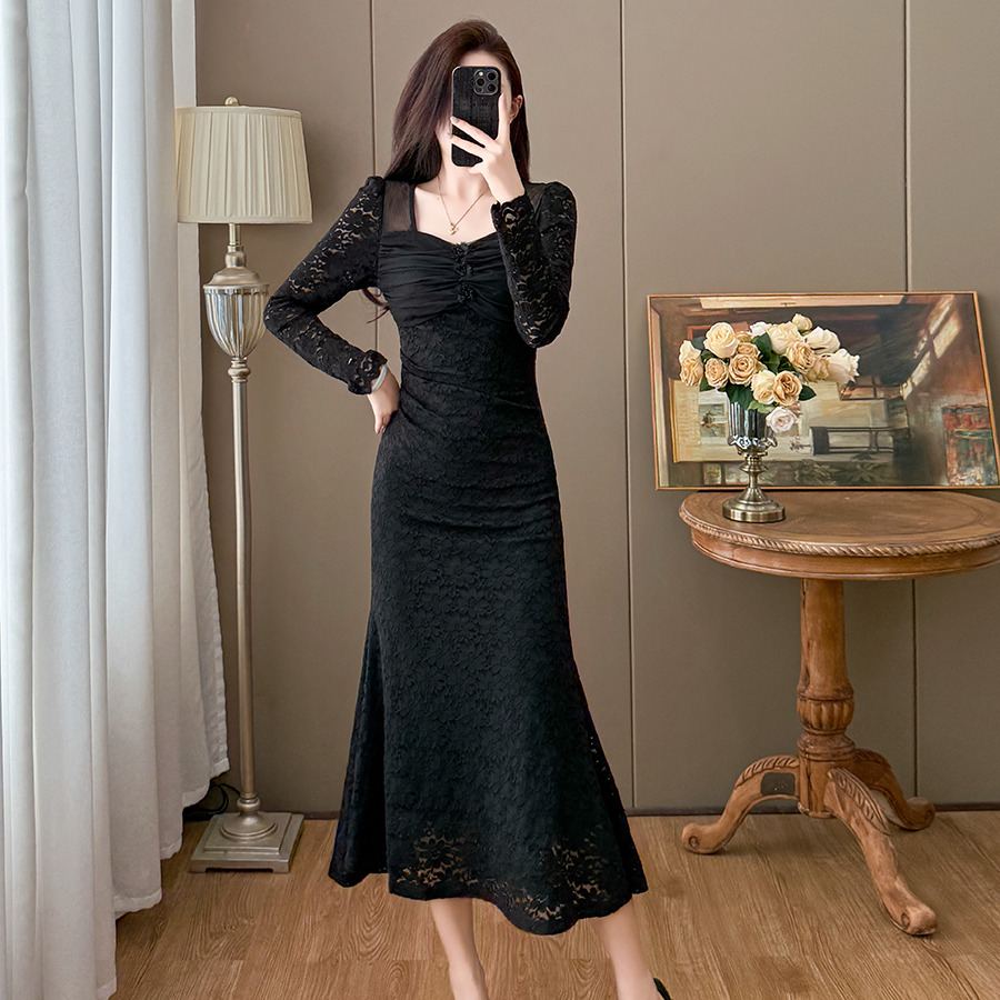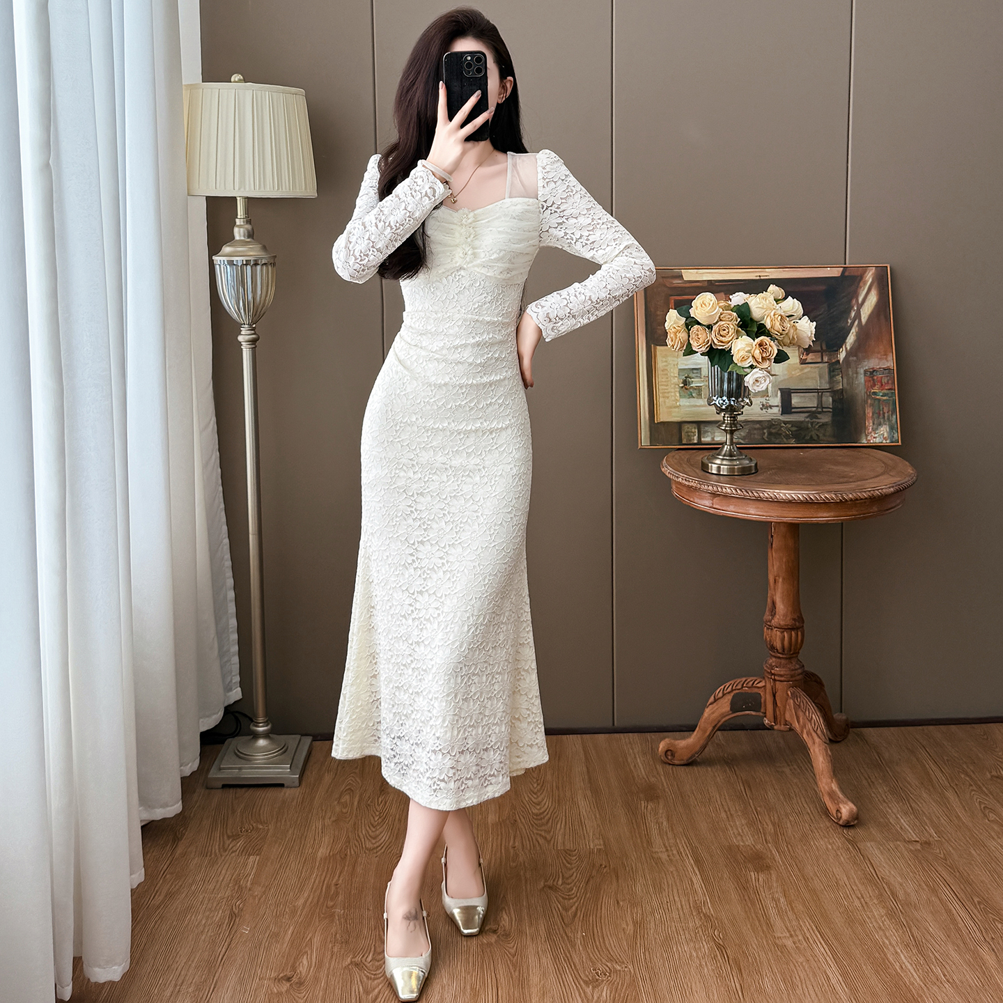 FA46639# 秋冬优雅蕾丝网纱拼接法式气质温柔风鱼尾连衣裙