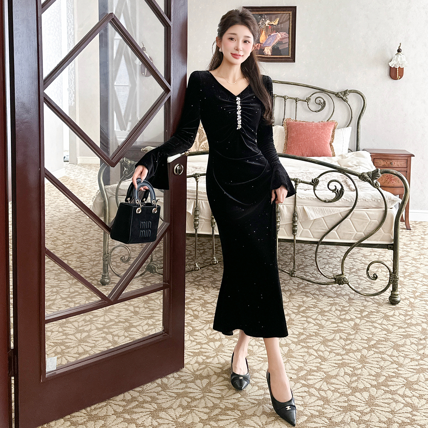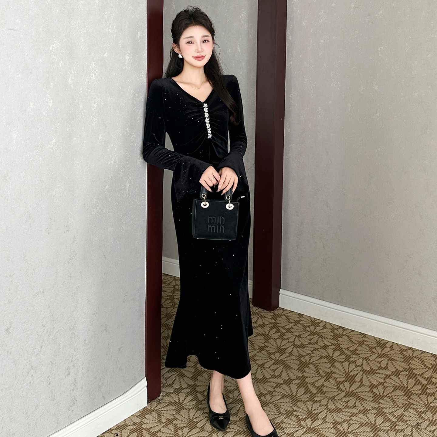 FA46641# 秋冬丝绒亮片褶皱显瘦大码优雅钉珠喇叭袖鱼尾长款连衣裙