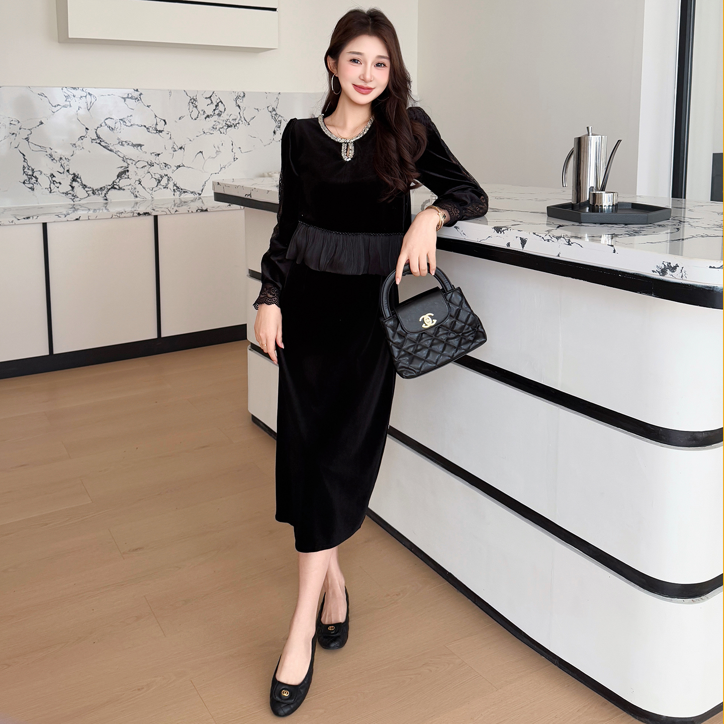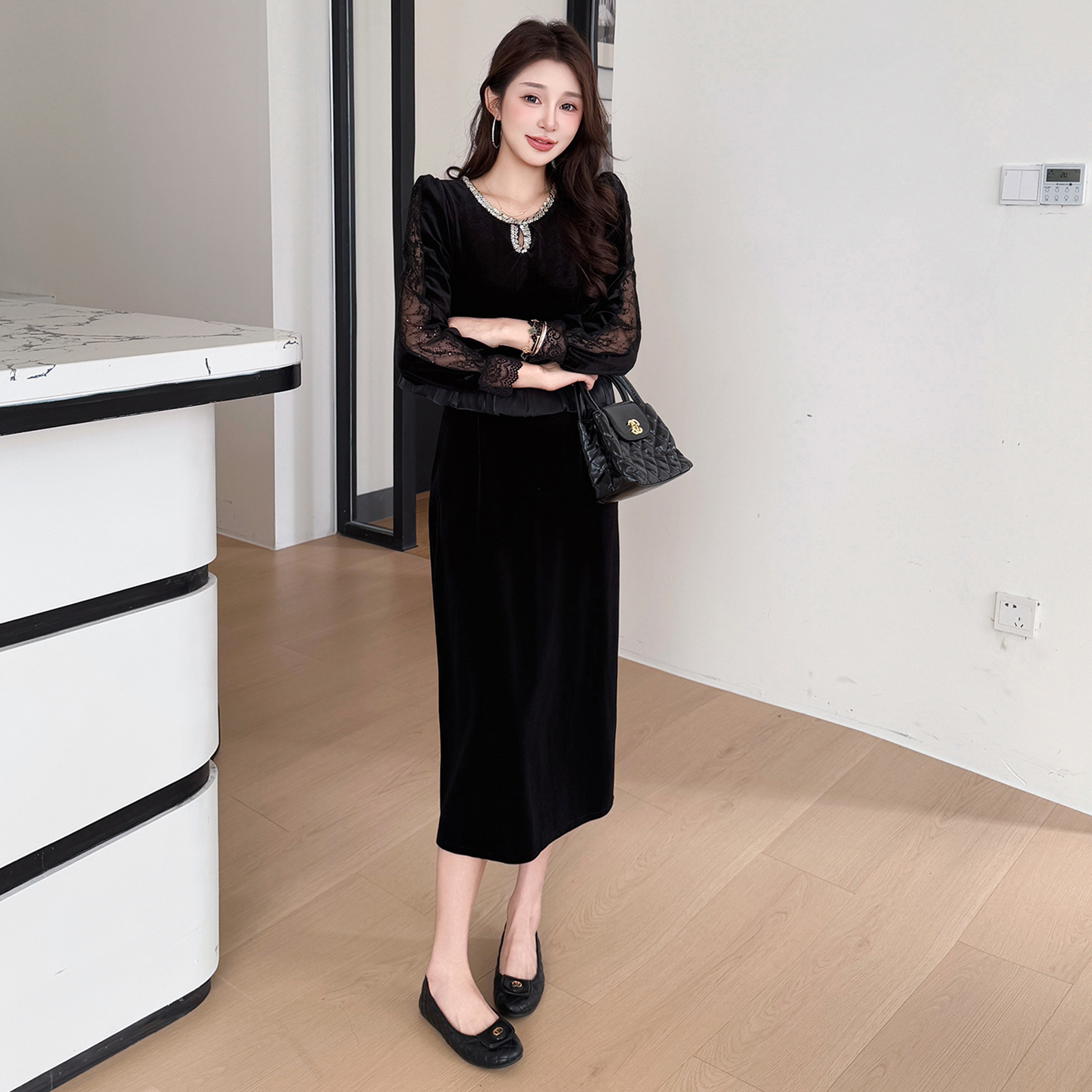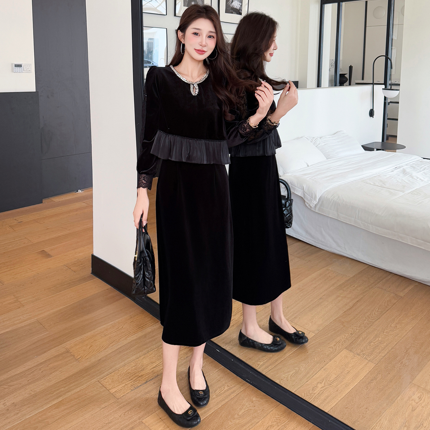 FA46642# 秋冬蕾丝拼接优雅遮肉假两件丝绒气质大码连衣裙