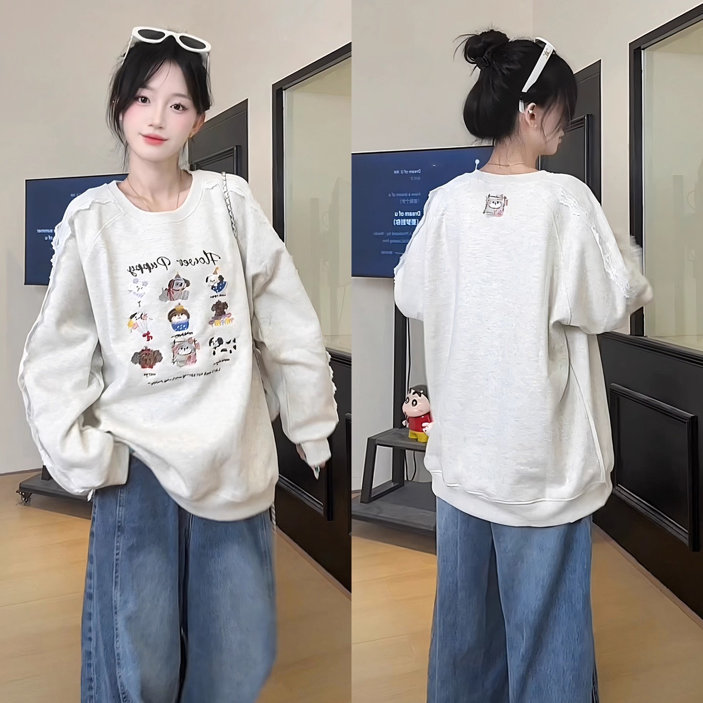 FA47948# 灰色小狗刺绣卫衣新款秋季蕾丝拼接宽松慵懒风秋冬上衣 服裝批發女裝批發服飾貨源