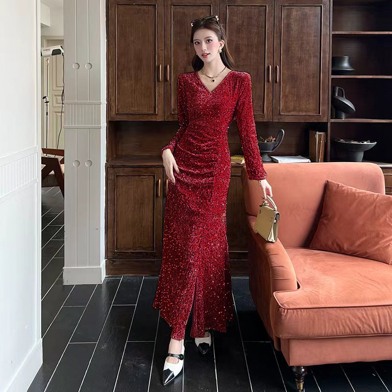 FA48004# 视频网红秋季时尚气质亮片v领长裙包臀连衣裙 服裝批發女裝批發服飾貨源