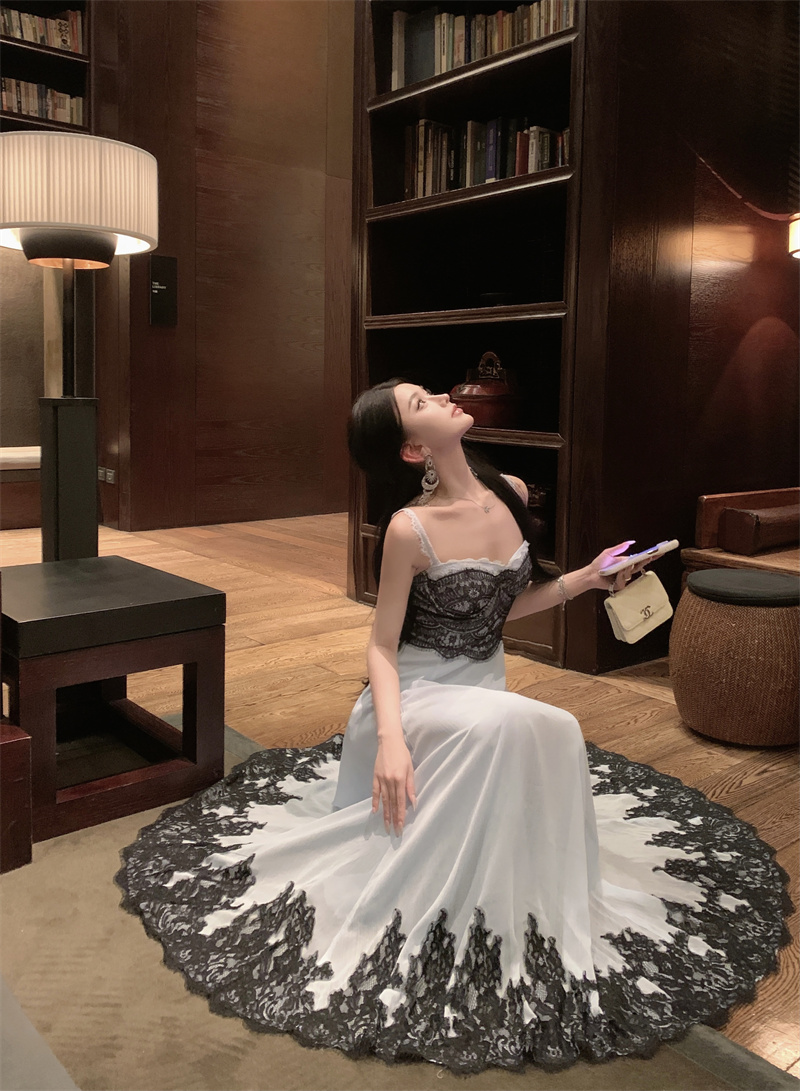 FA48224# 流晶筑梦/重工定位蕾丝清冷感梦幻蓝雪纺收腰大摆裙公主裙 服裝批發女裝批發服飾貨源