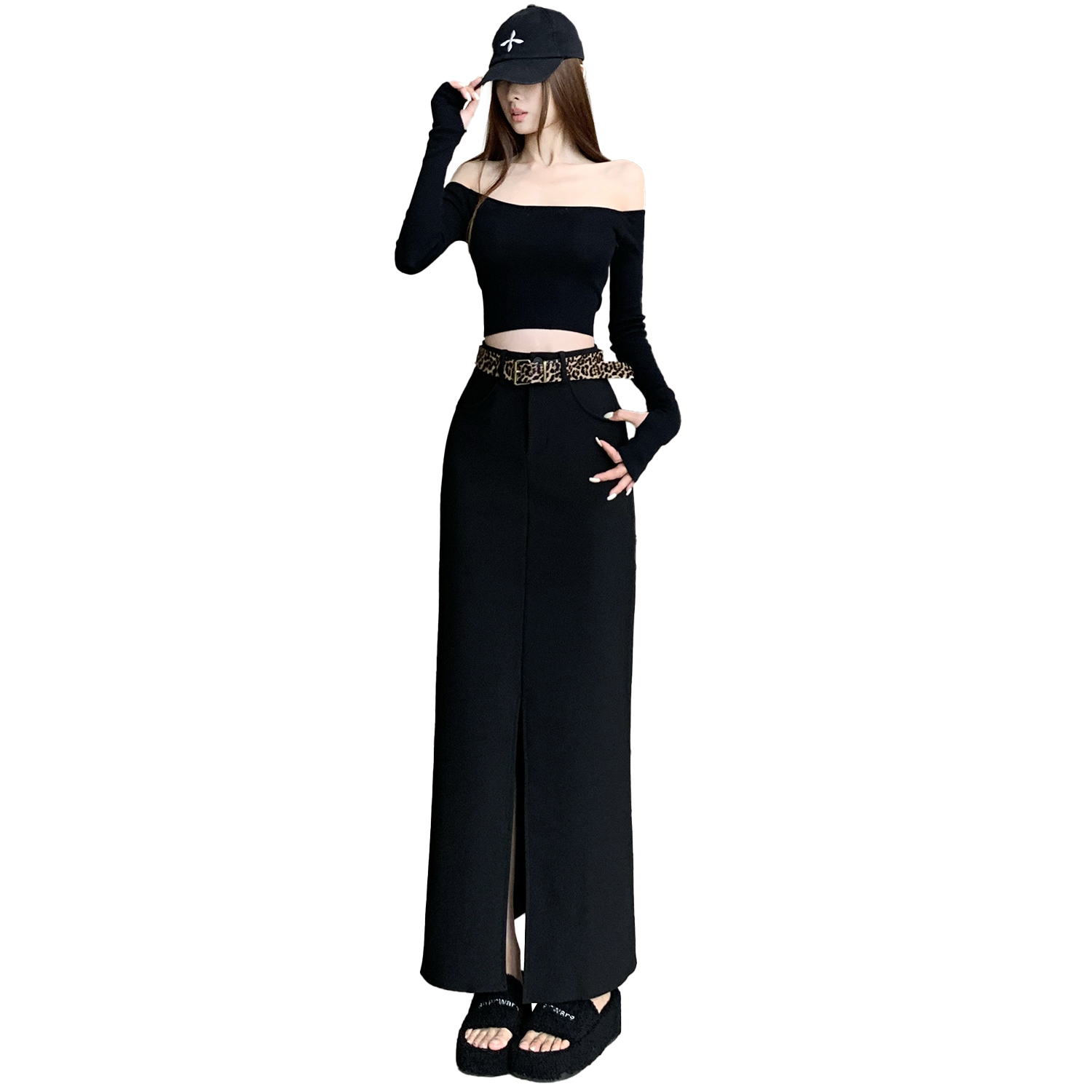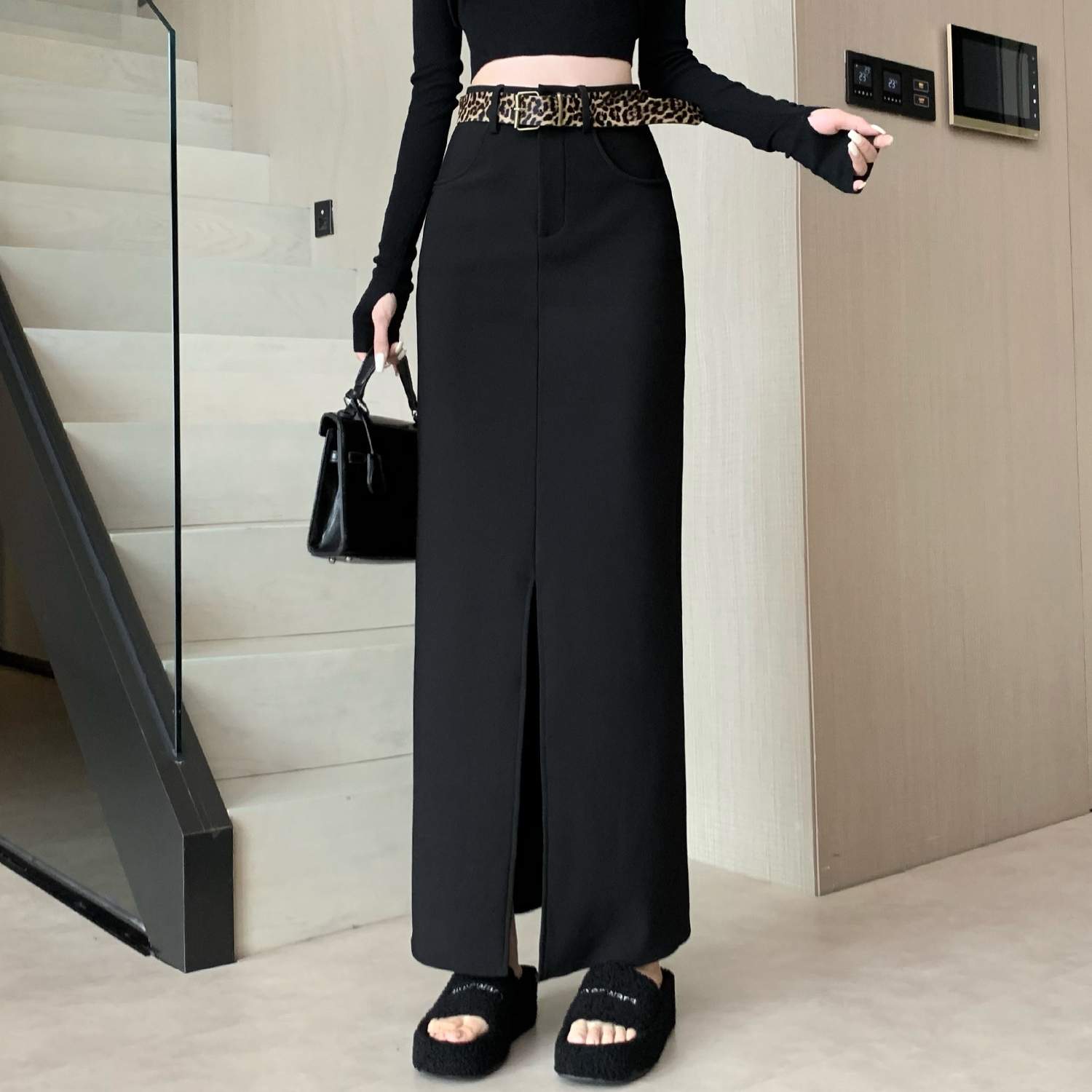 FA48537# 加绒黑色西装半身裙女秋冬设计感高腰a字裙时尚百搭开叉直筒长裙 服裝批發女裝批發服飾貨源