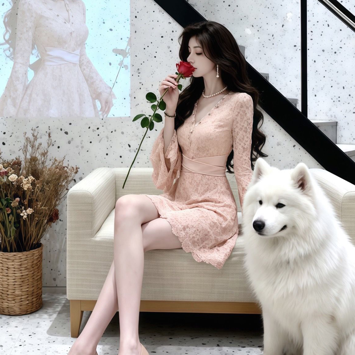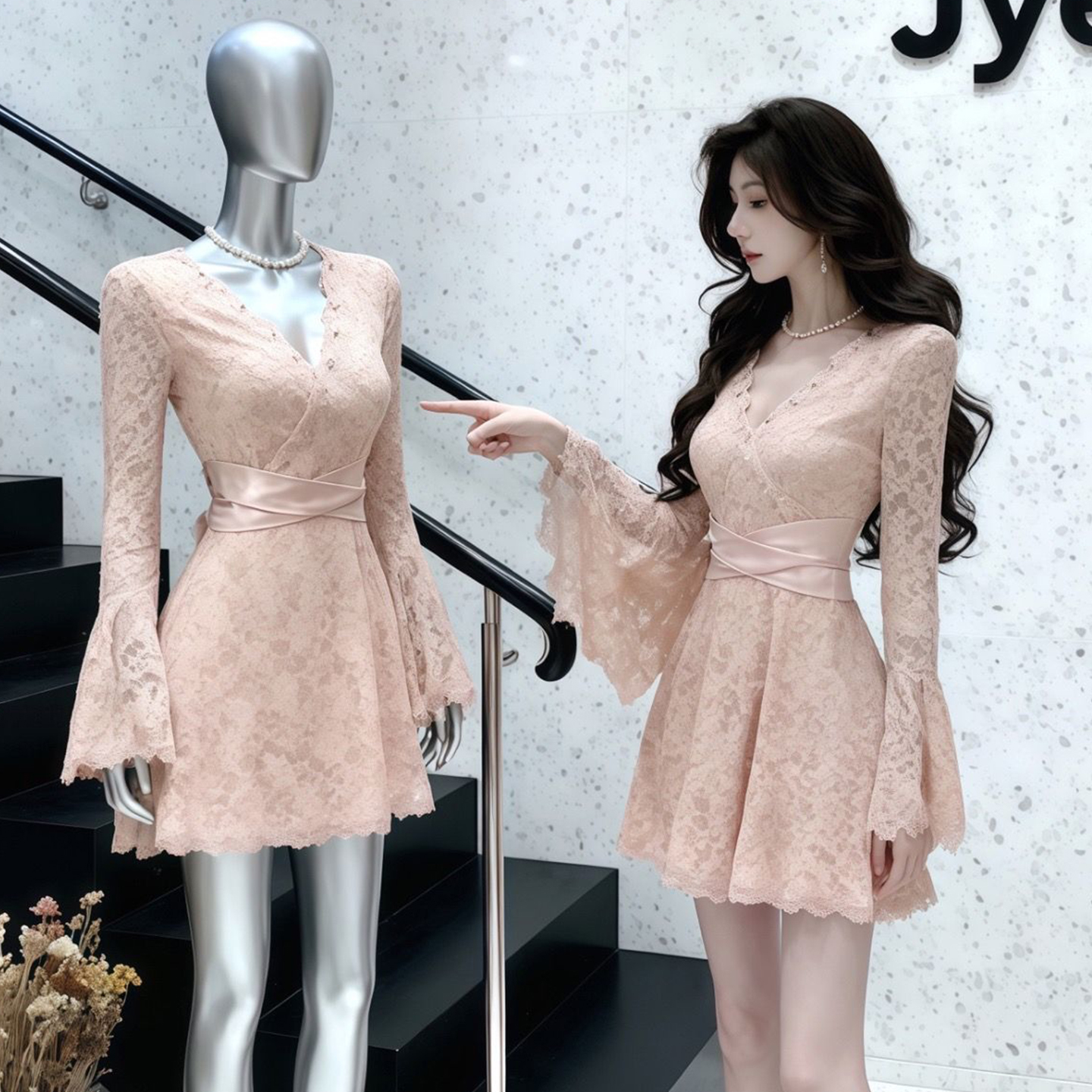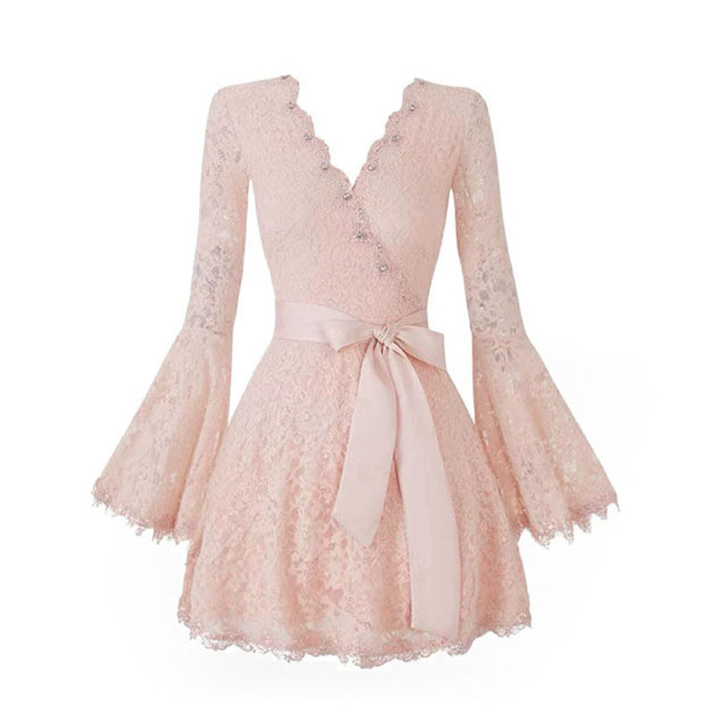 FA48542# 法式名媛风重工钉珠V领蕾丝连衣裙女长袖收腰显瘦气质绝美小裙子 服裝批發女裝批發服飾貨源