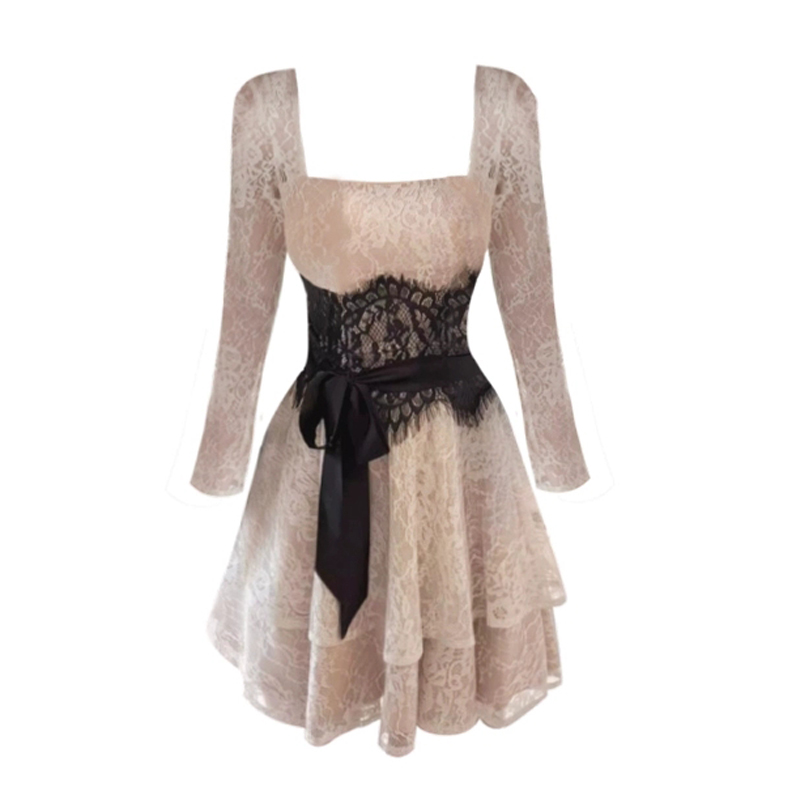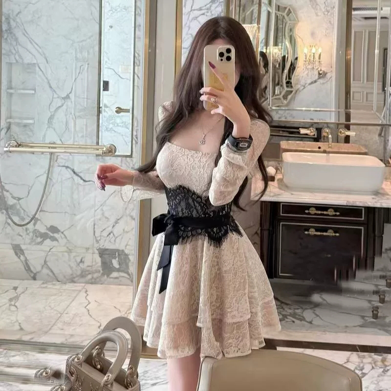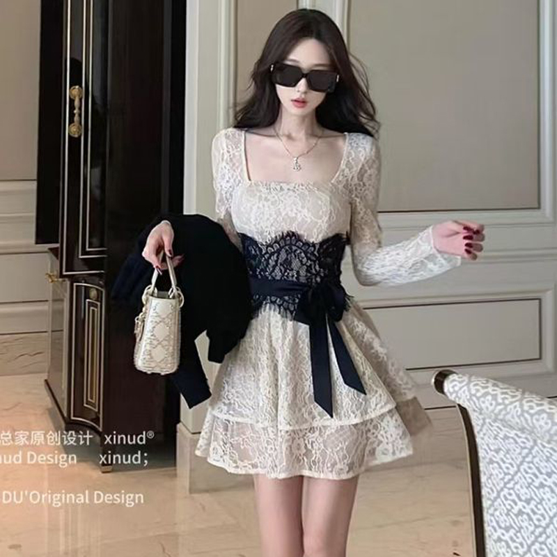 FA48546# 法式纯欲蕾丝长袖连衣裙女秋季气质名媛绑带收腰显绝美瘦A字短裙 服裝批發女裝批發服飾貨源