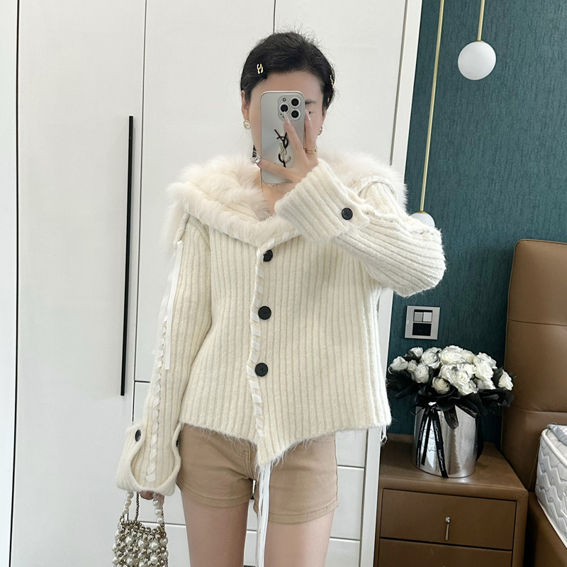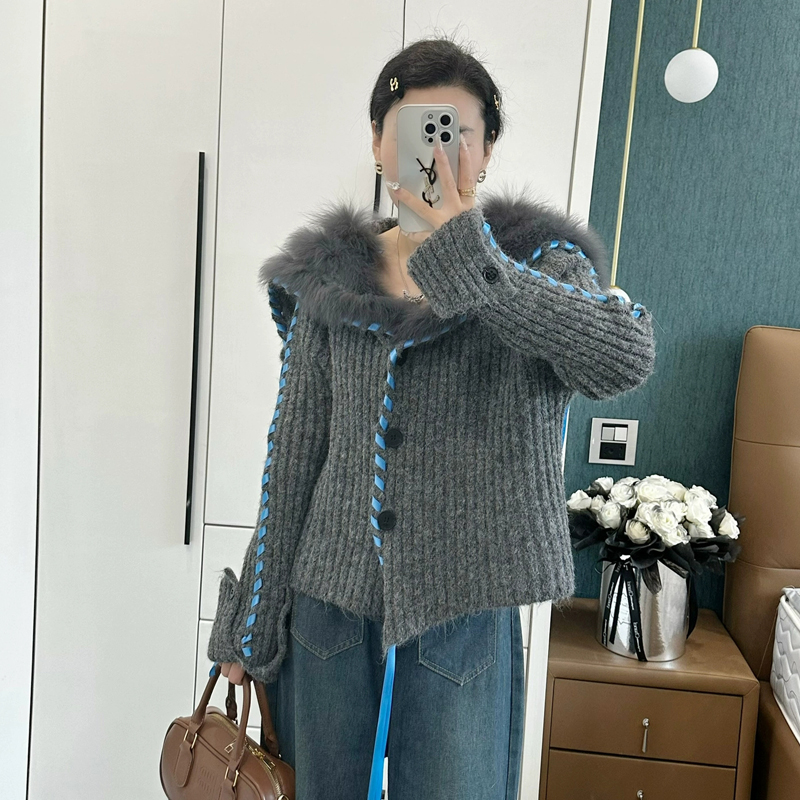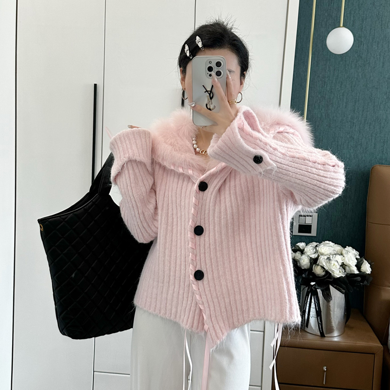 FA48550# 韩系撞色海军领飘带毛衣短外套女秋季软糯宽松设计感针织开衫上衣 服裝批發女裝批發服飾貨源