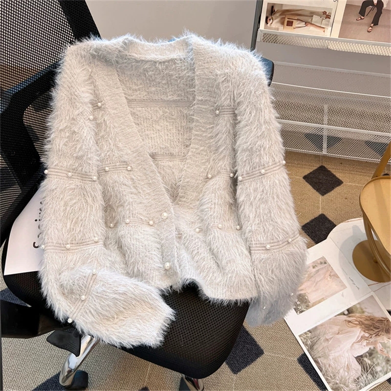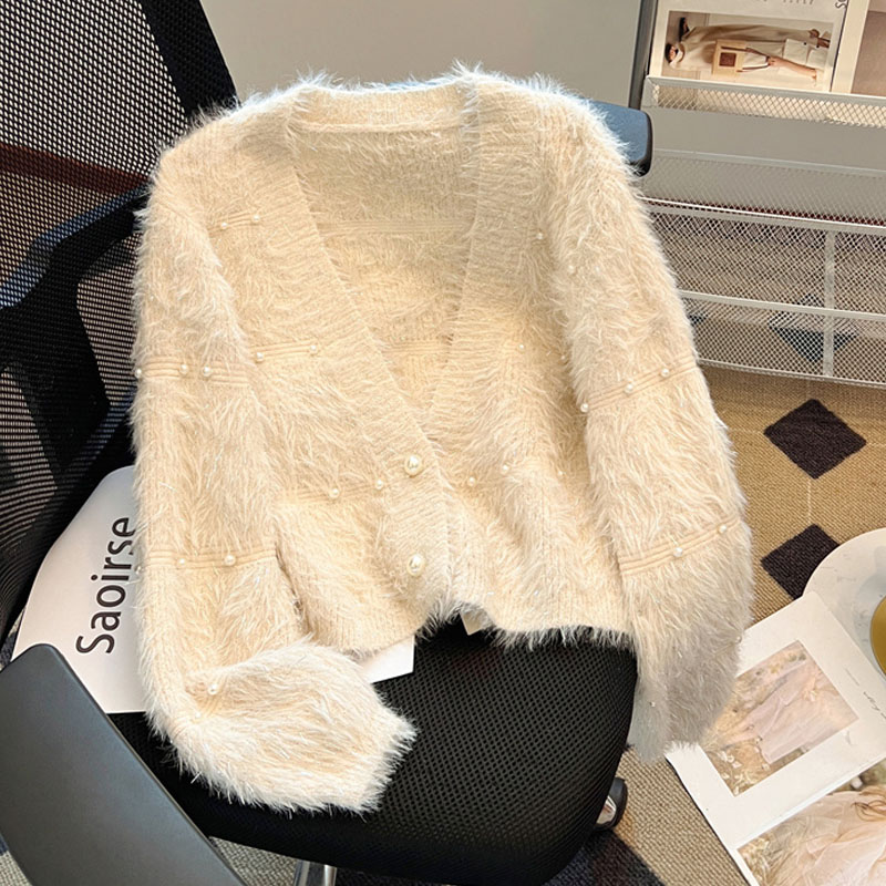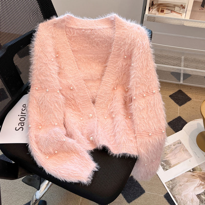 FA48551# 软糯温柔风氛围感毛衣女秋季仿水貂毛皮草短款高级感v领开衫外套 服裝批發女裝批發服飾貨源