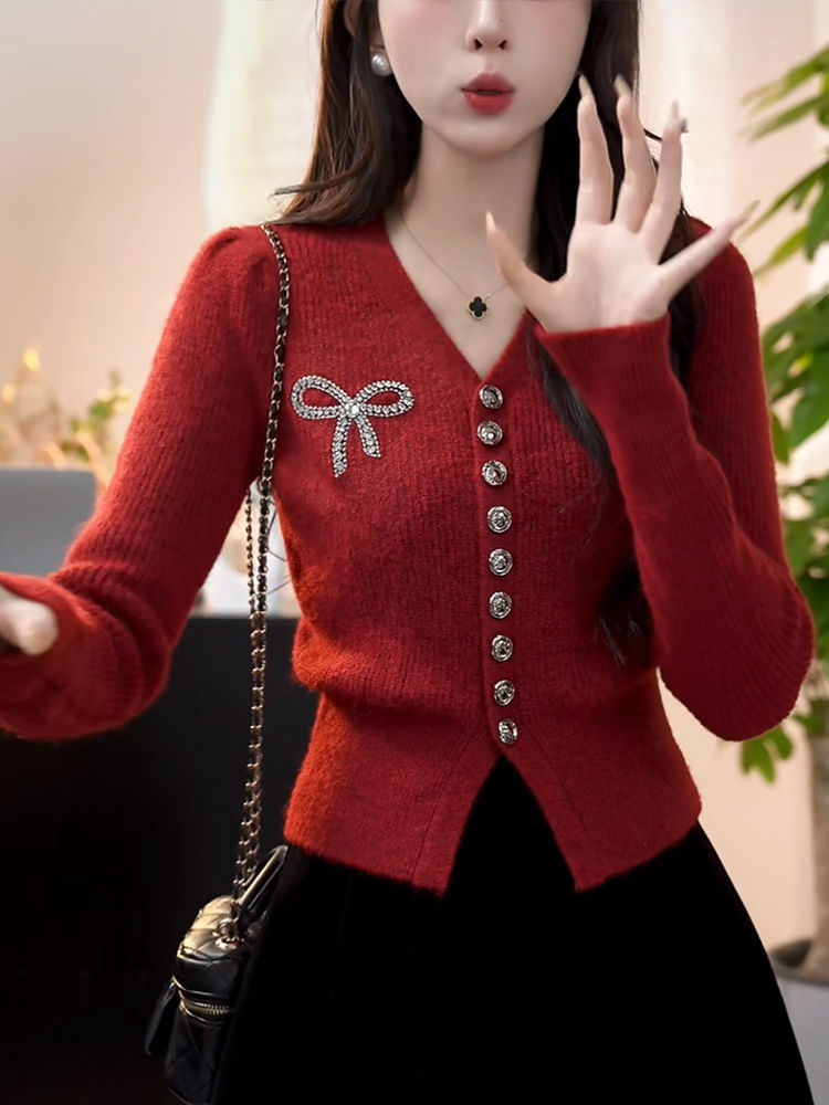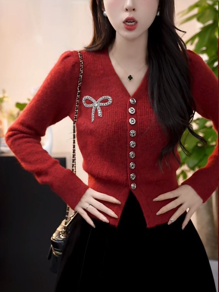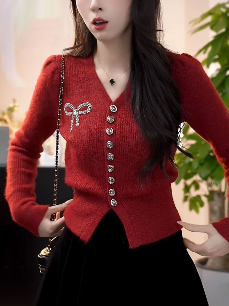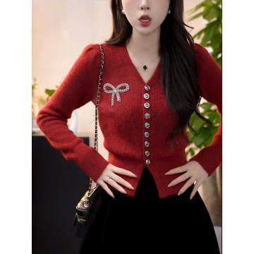FA48571# 小香风蝴蝶结针织开衫毛衣女喜庆红色圣诞气质显瘦短款V领上衣潮 服裝批發女裝批發服飾貨源