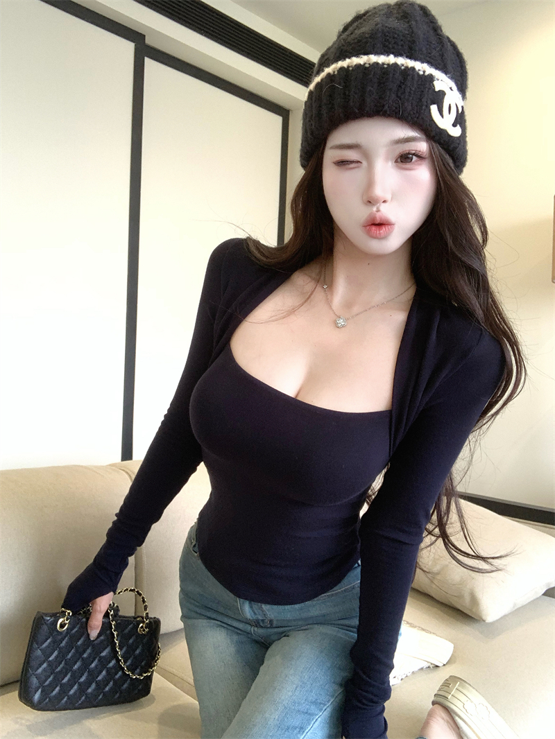 FA48592# 方领假两件长袖修身打底上衣 服裝批發女裝批發服飾貨源