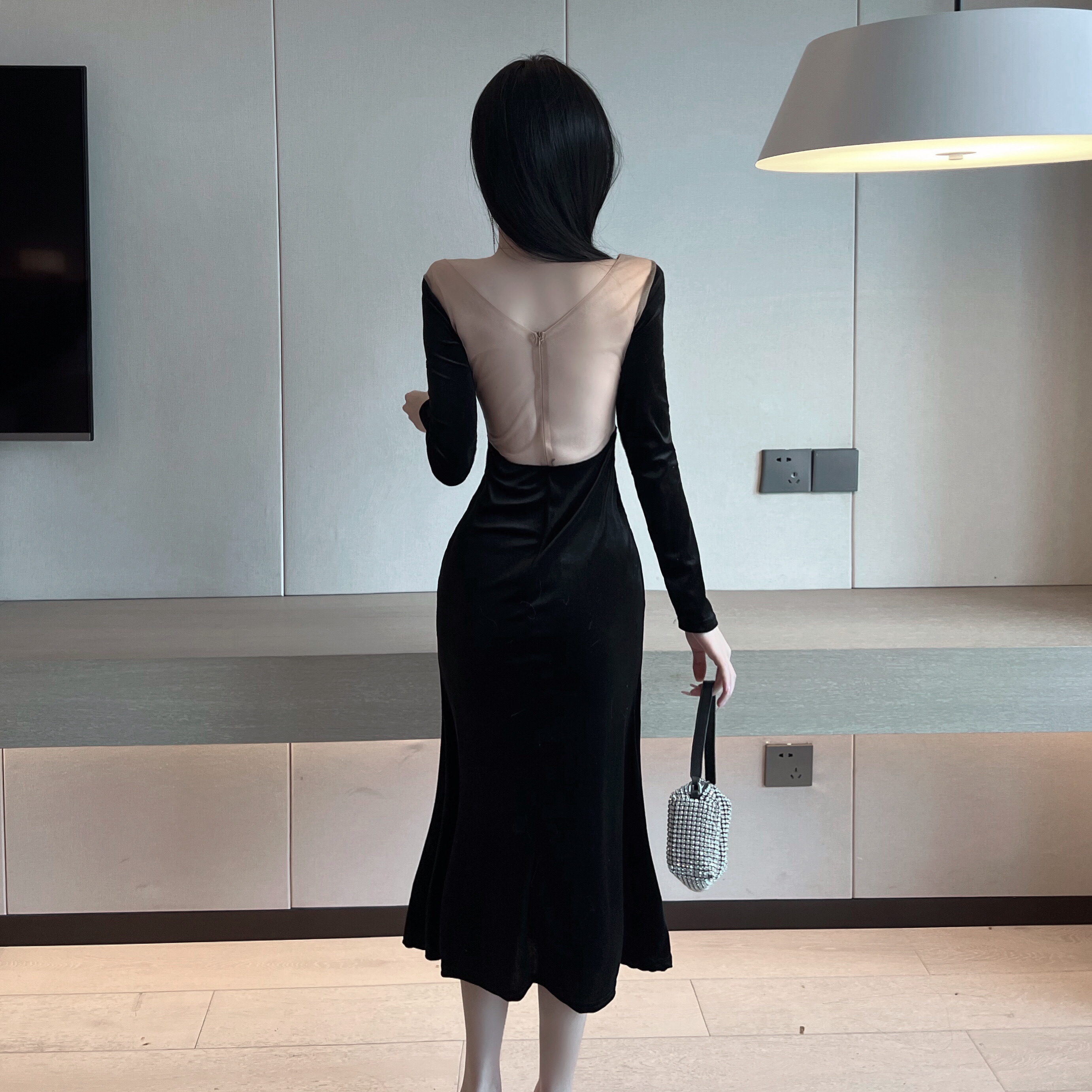 新款性感v领设计感丝绒长袖气质显瘦连衣裙