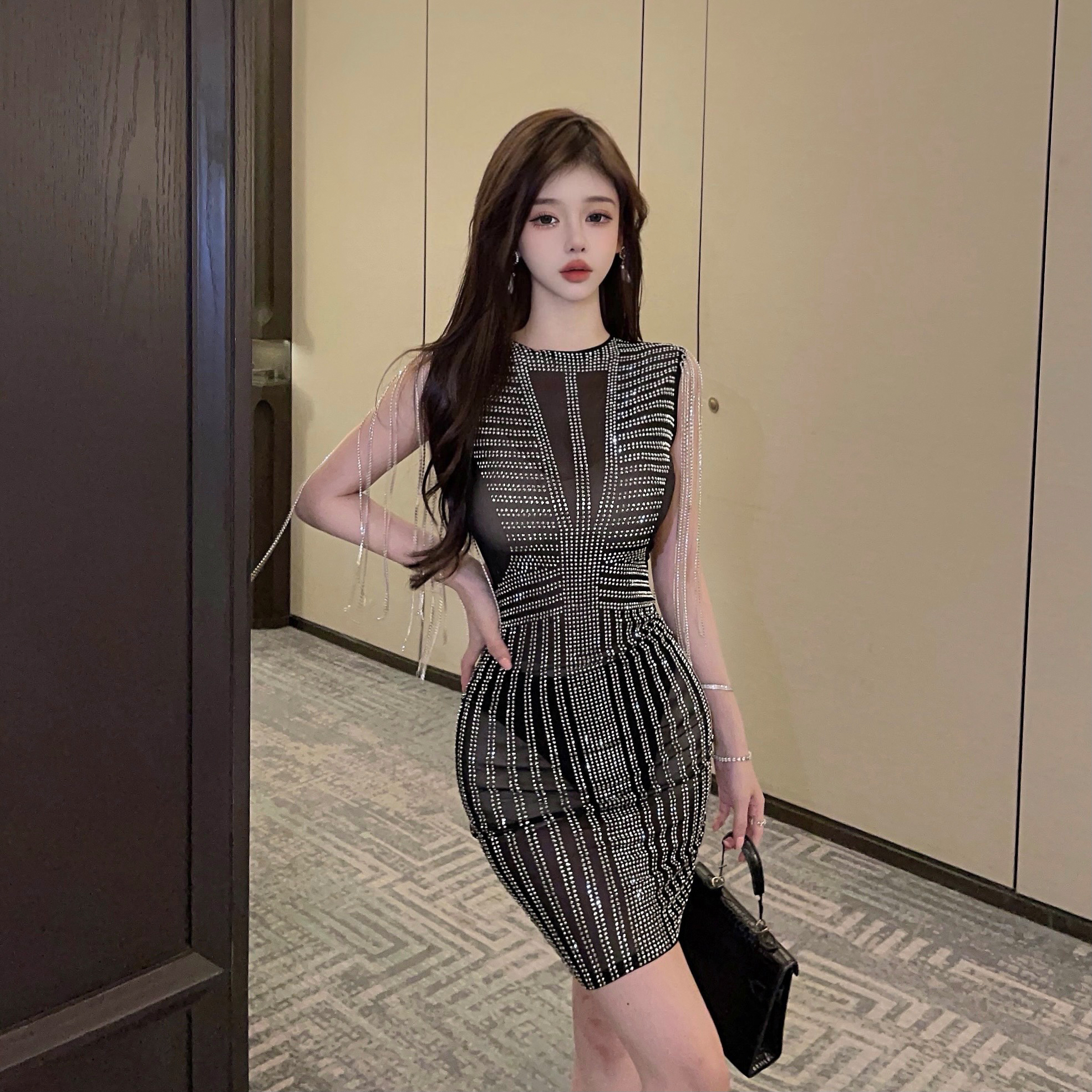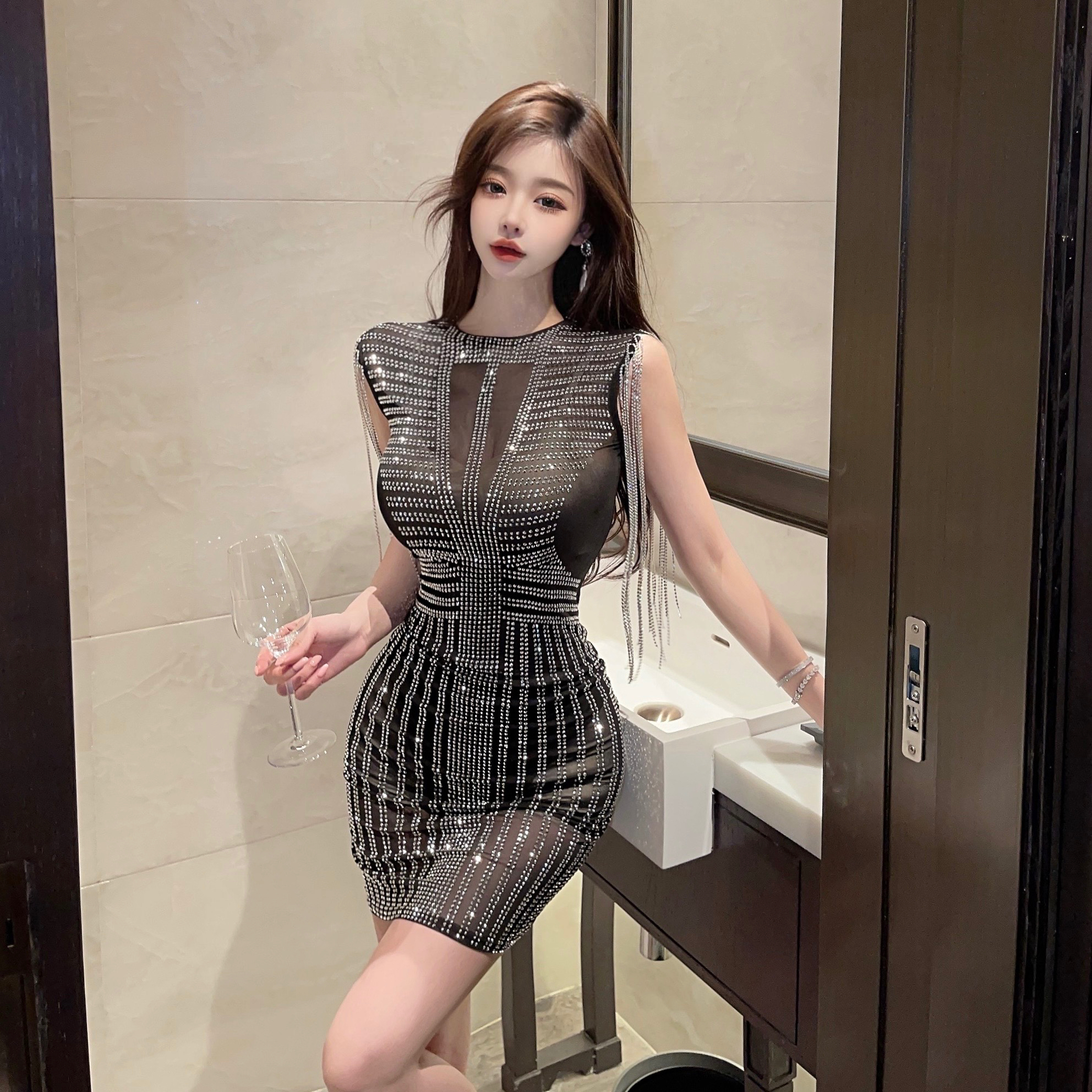 新款欧美性感网纱烫钻无袖流苏包臀派对连衣裙