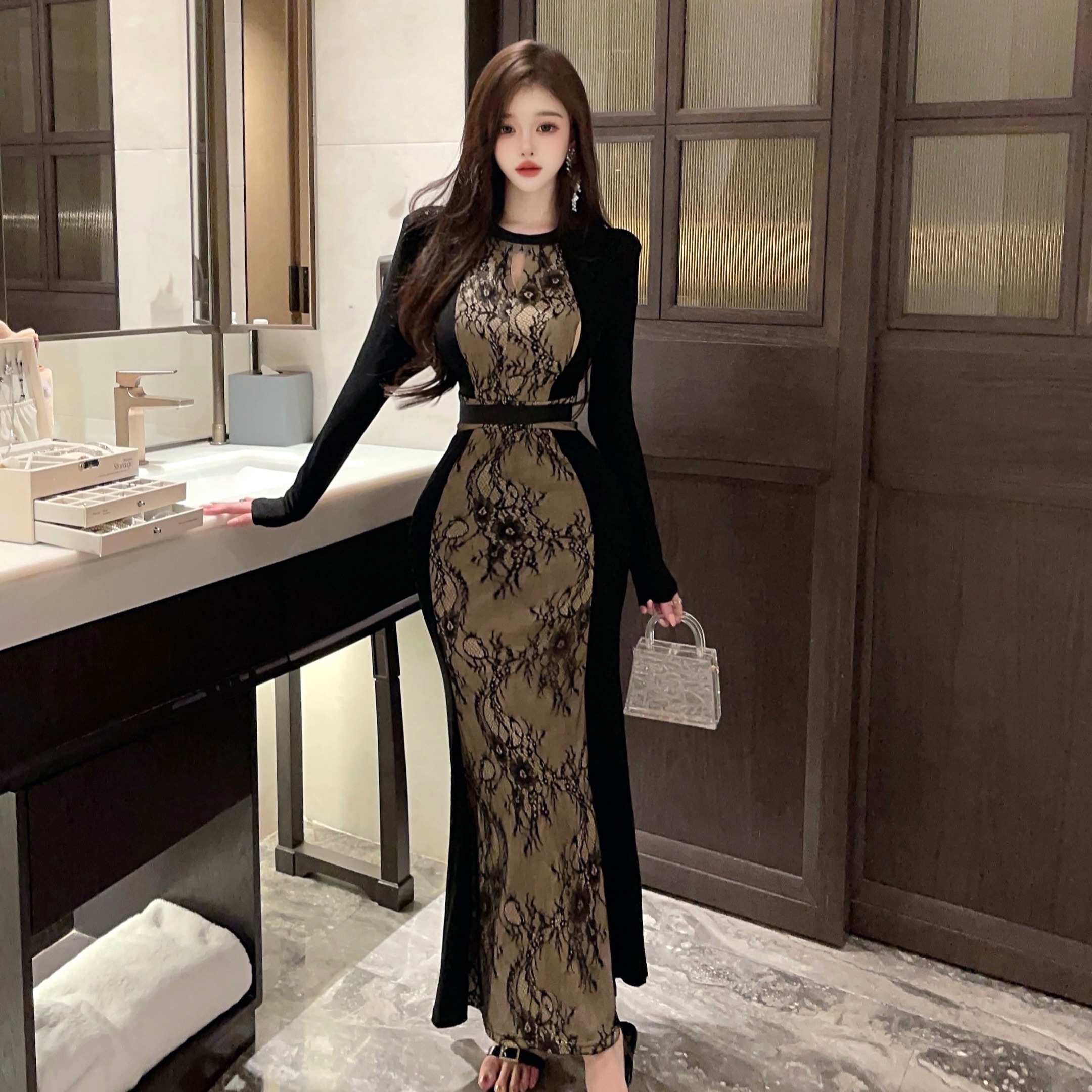 新款法式复古印花撞色拼接长袖性感镂空收腰长裙