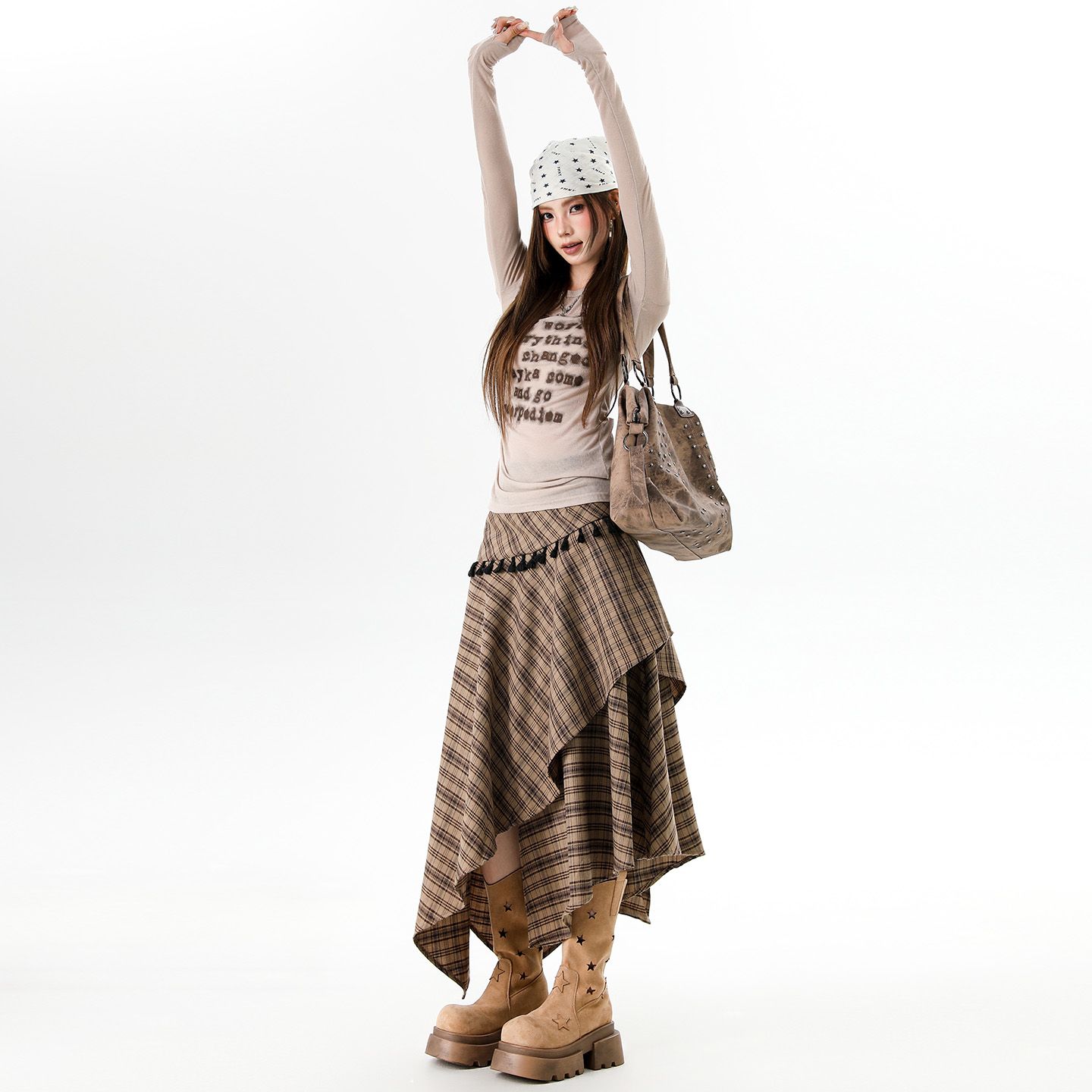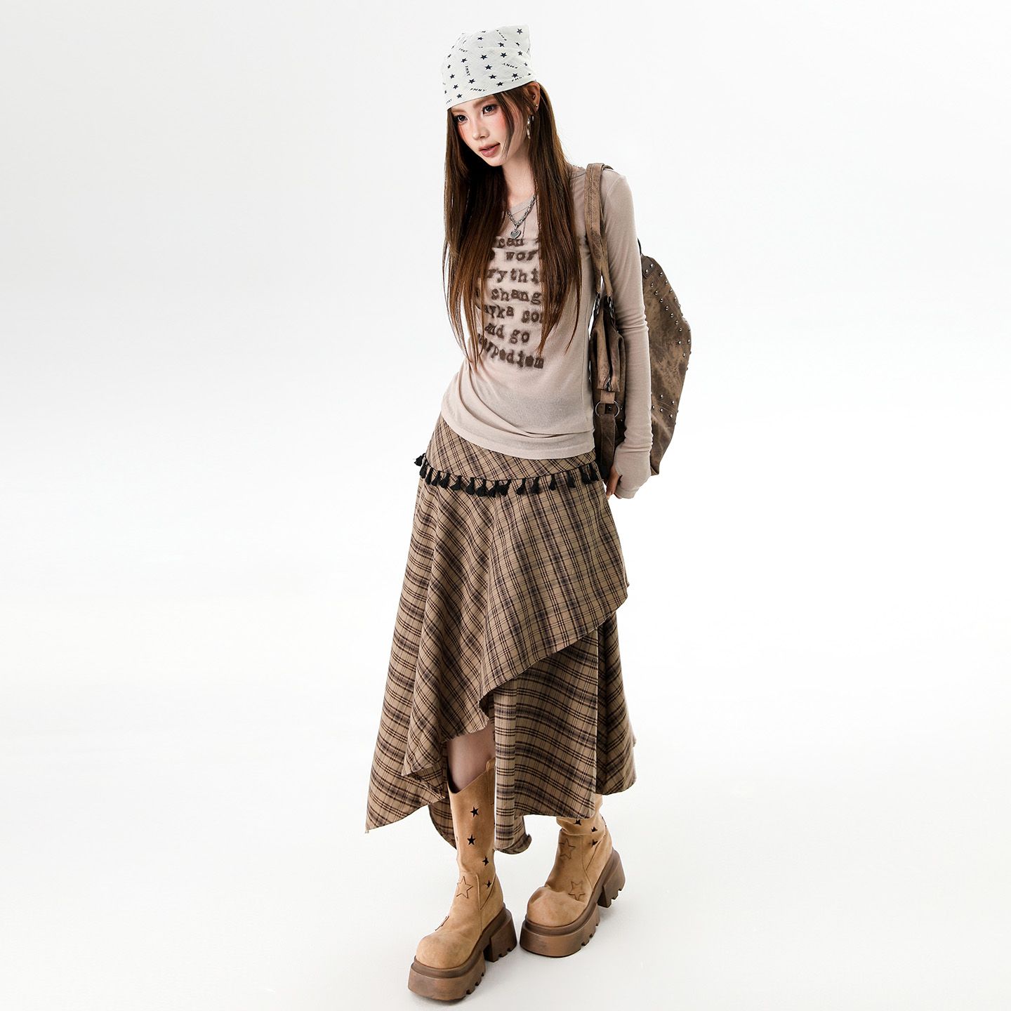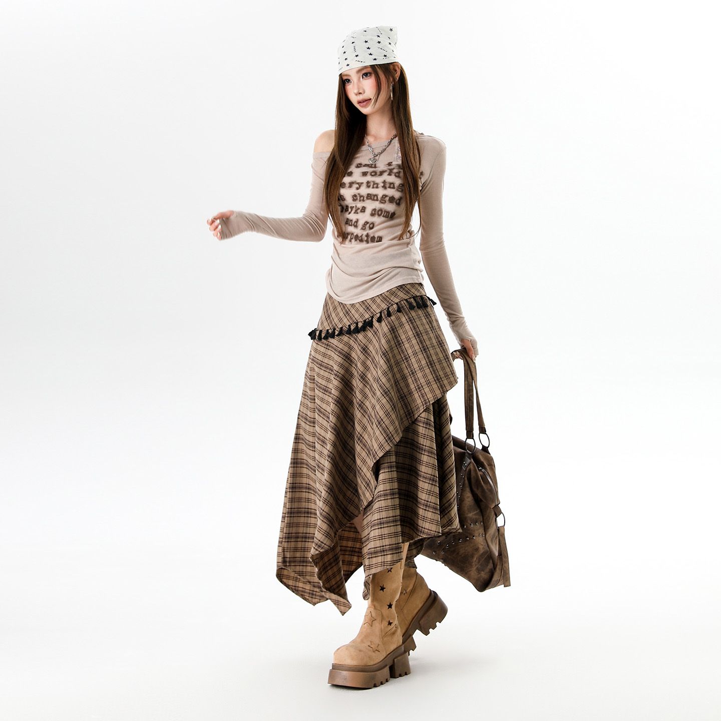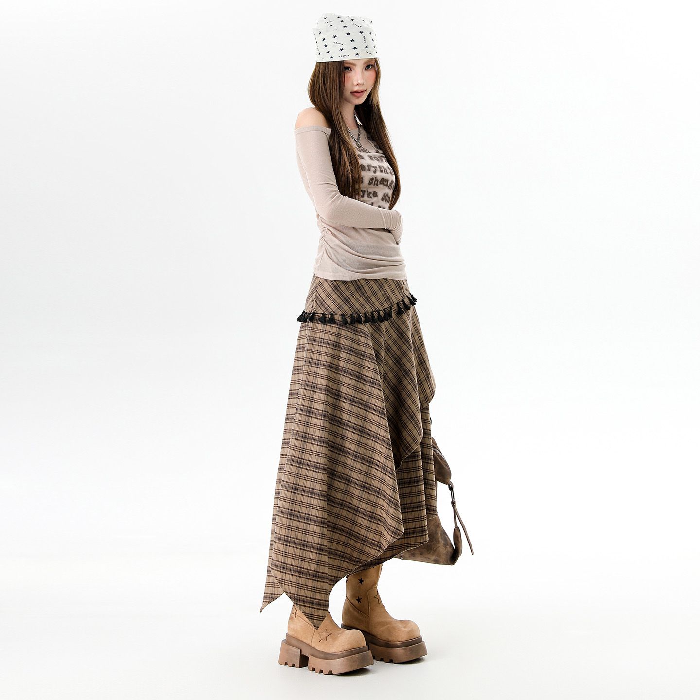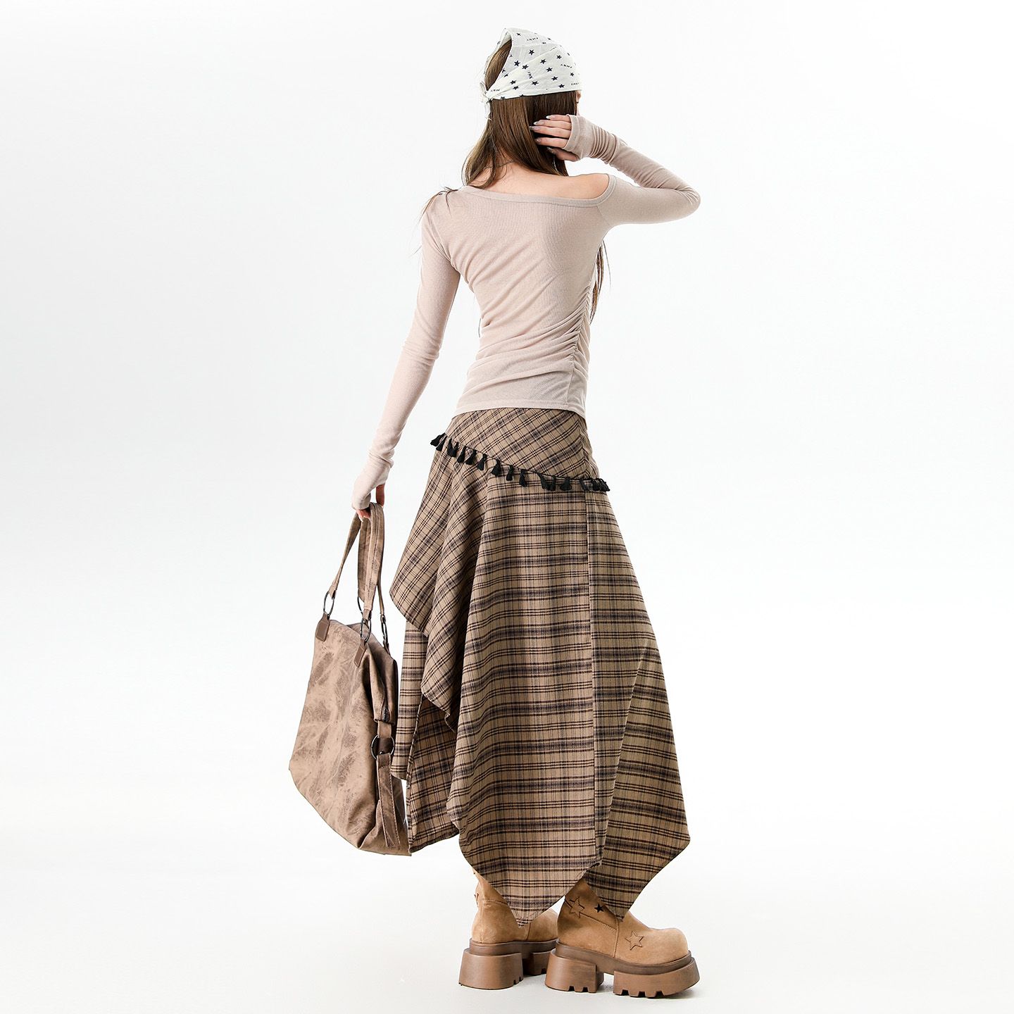 FA49460# 不规则复古格纹流苏半身裙女秋冬新款高腰显瘦a字中长裙 服裝批發女裝批發服飾貨源
