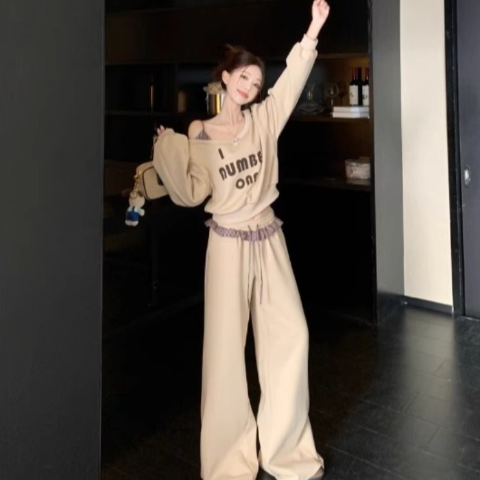 FA49514# 复古长袖斜肩印花卫衣高腰拼接条纹阔腿休闲裤女秋季套装 服裝批發女裝批發服飾貨源