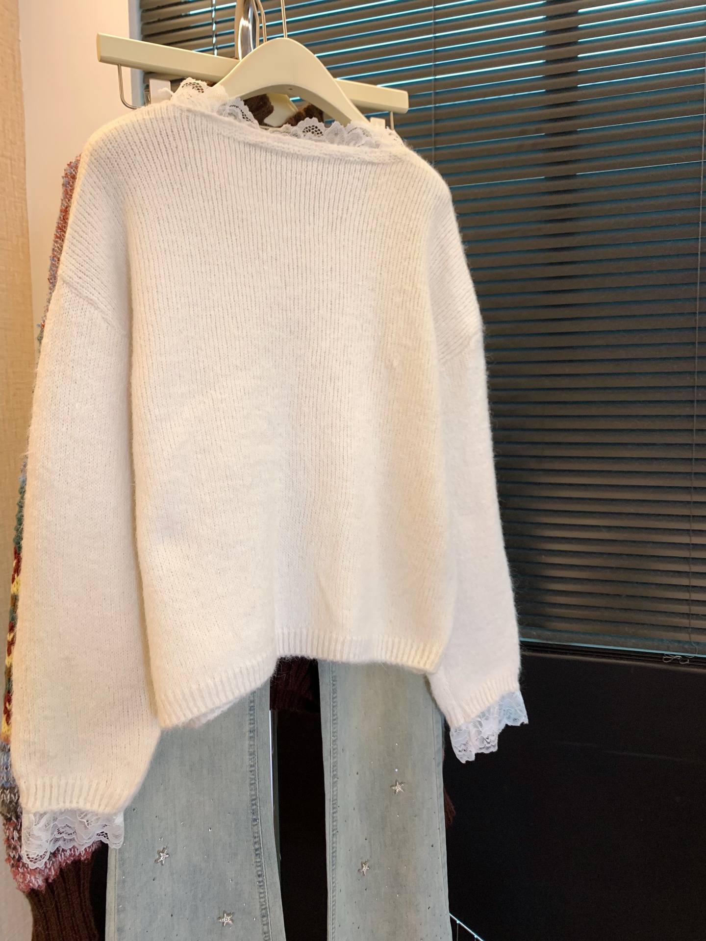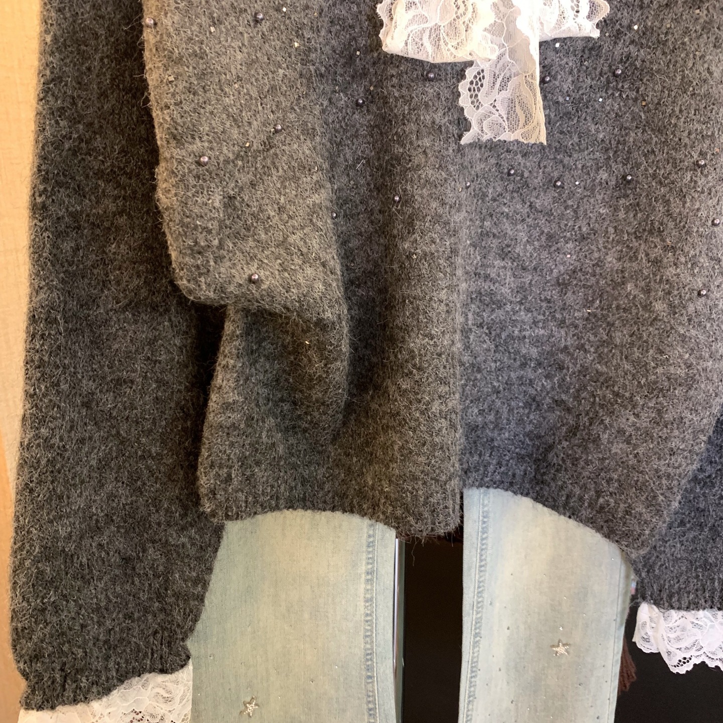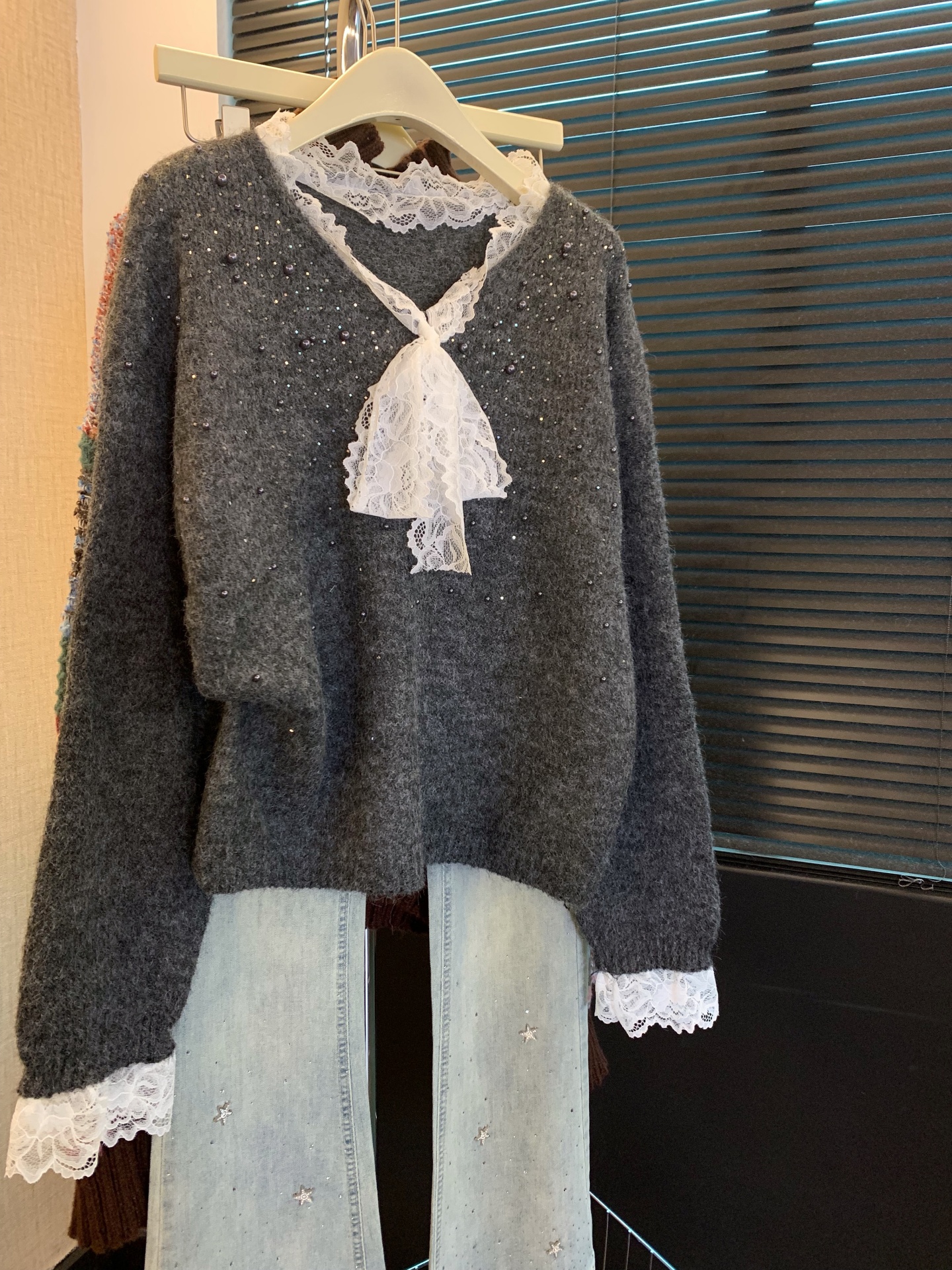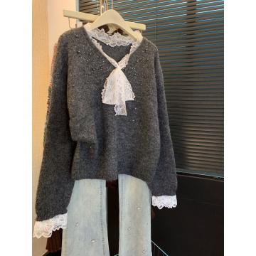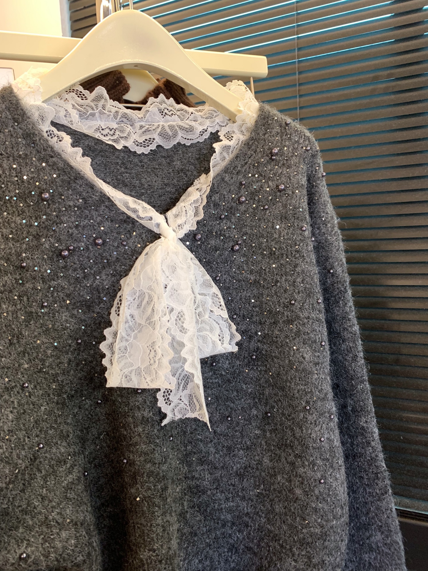 FA49779# 韩系风蕾丝边系带蝴蝶结重工毛衣女秋冬设计感时尚针织衫 服裝批發女裝批發服飾貨源