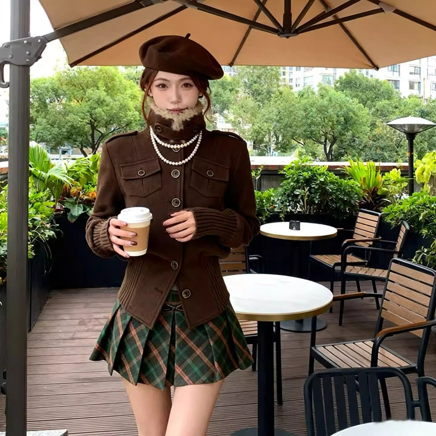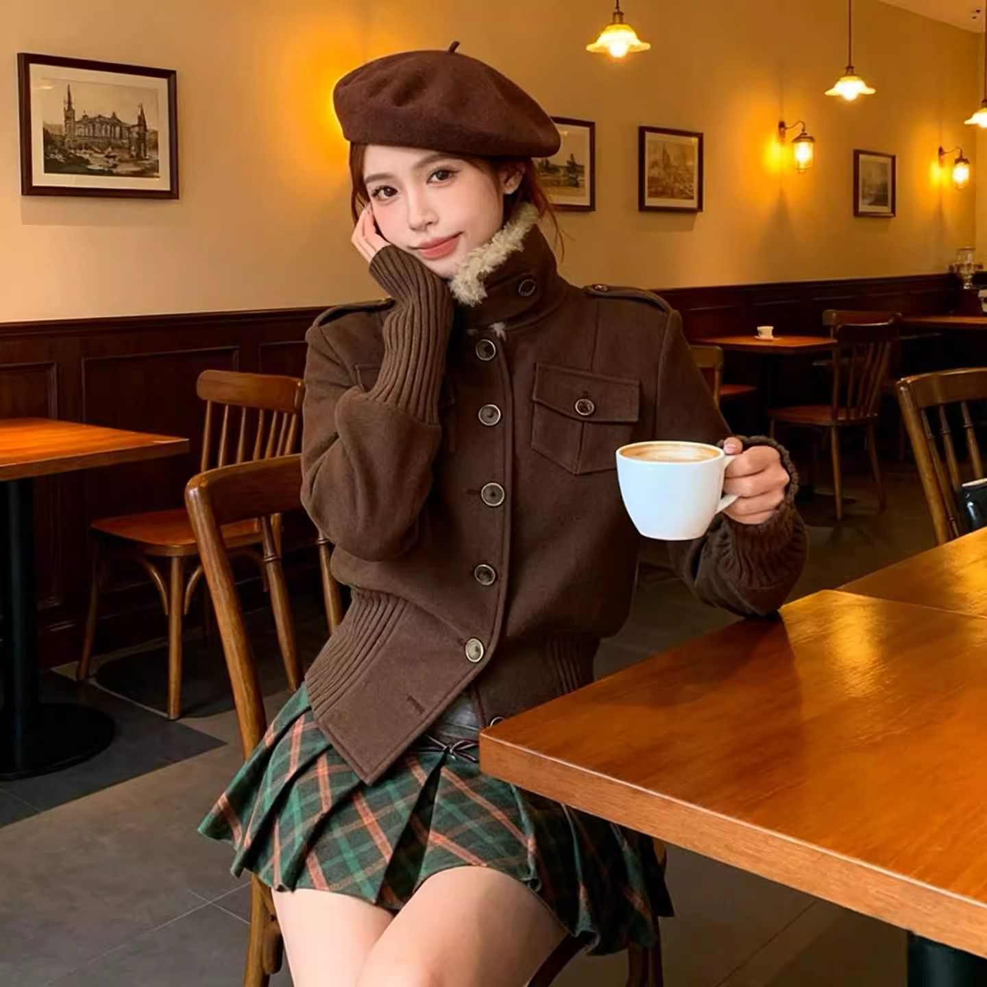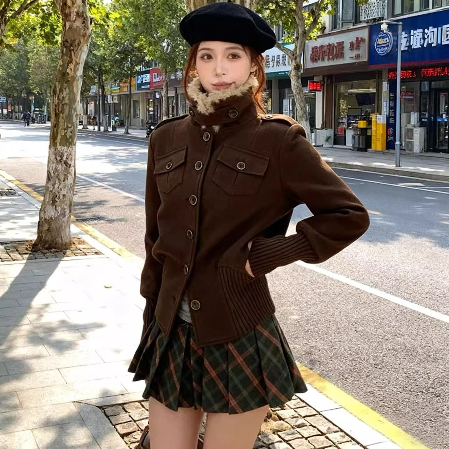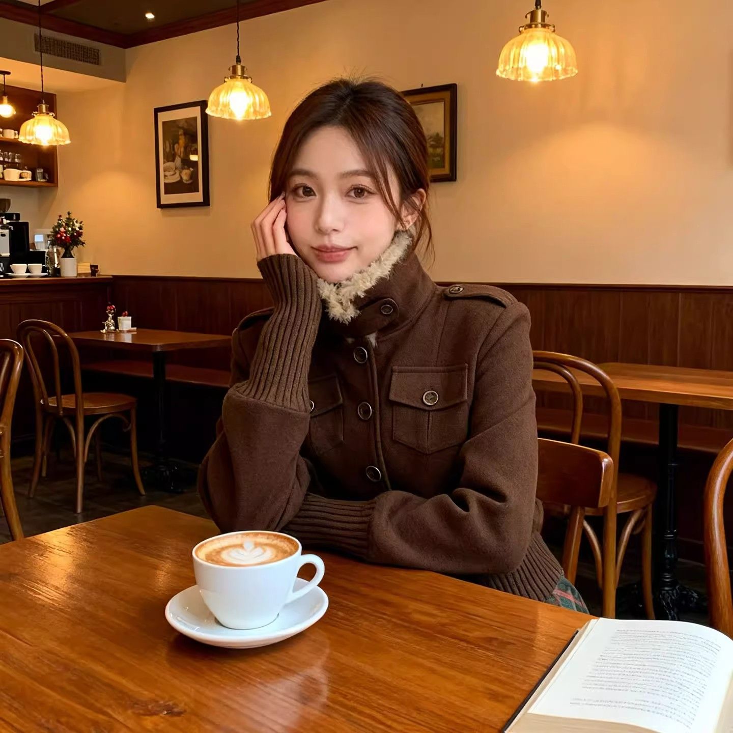 FA49809# 高级感复古气质咖色毛领短外套女老钱风保暖掐腰夹克加棉毛呢外套 服裝批發女裝批發服飾貨源