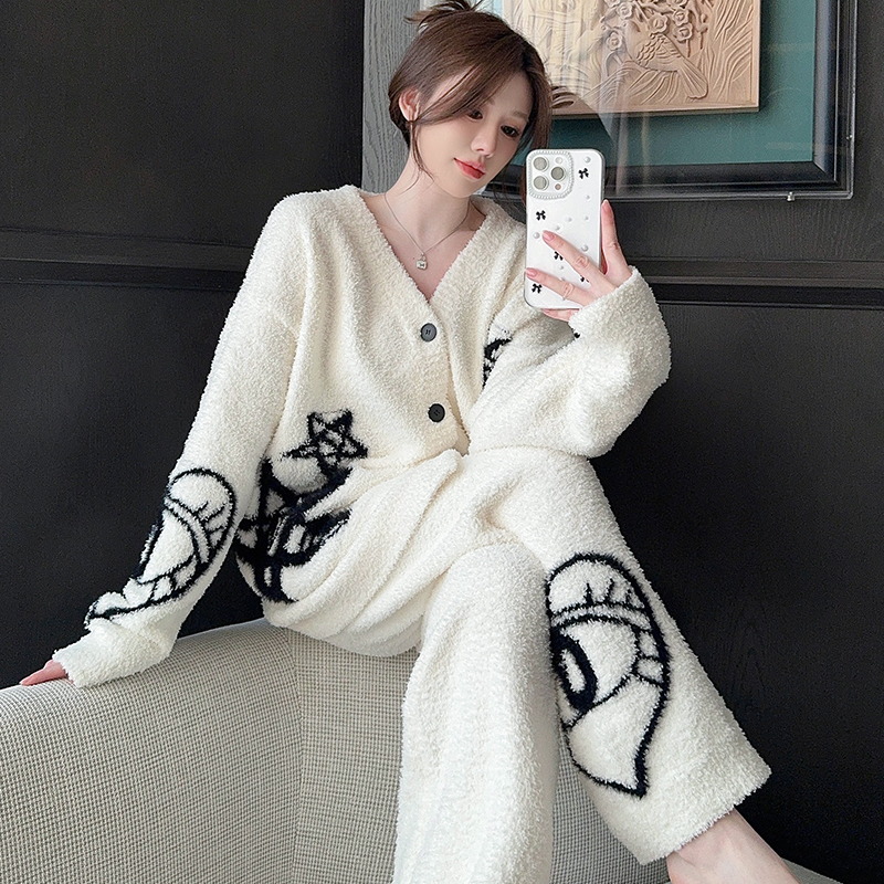 实货睡衣女半边绒秋冬新款韩版宽松开衫休闲女士睡衣家居服套装 服裝批發女裝批發服飾貨源