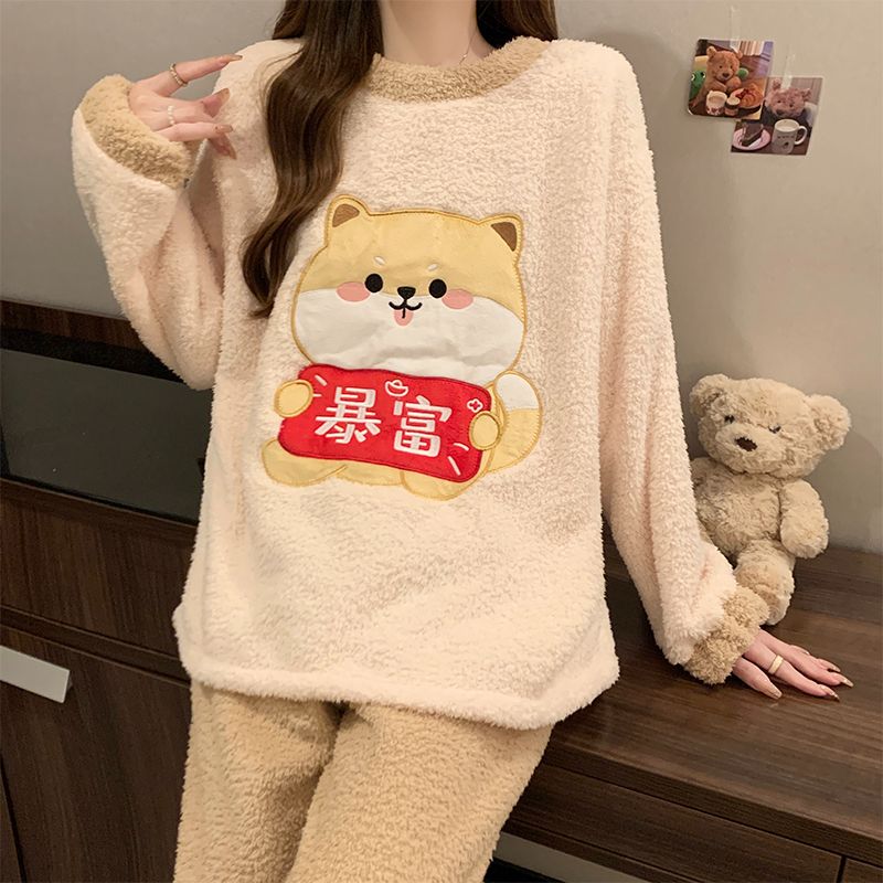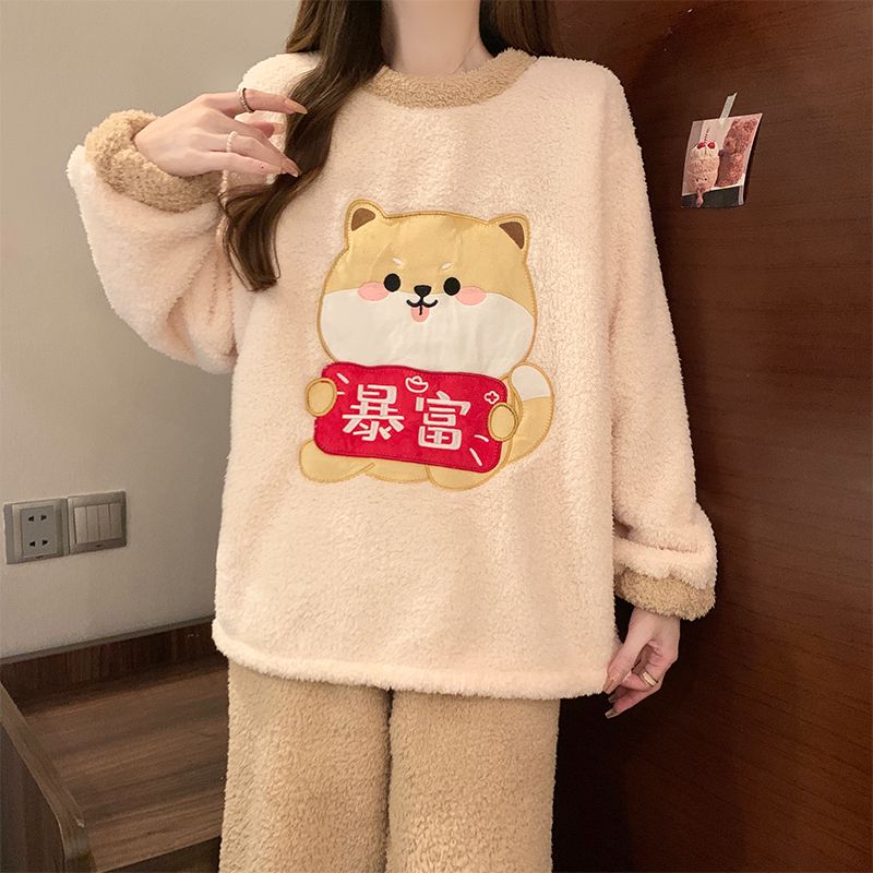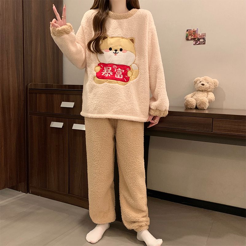 FA49918# 冬季新款睡衣女加厚半边绒卡通圆领休闲家居服套装 服裝批發女裝批發服飾貨源