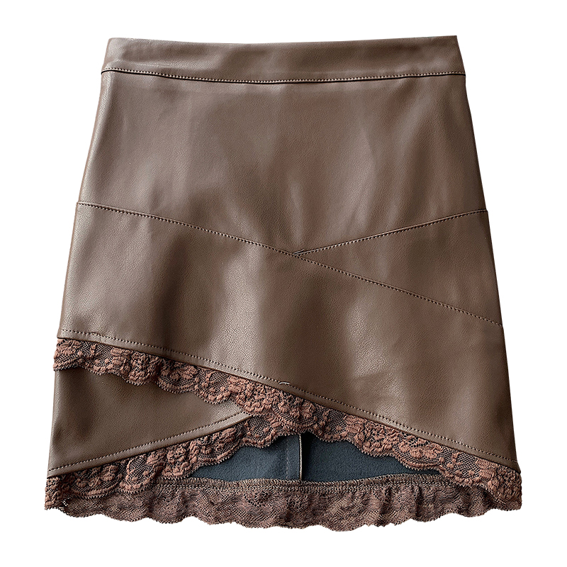 FA50159# 蕾丝拼接PU皮半身裙秋冬新款高腰百搭显瘦包臀裙A字裙 服裝批發女裝批發服飾貨源