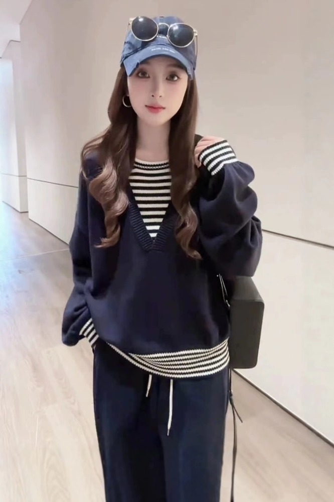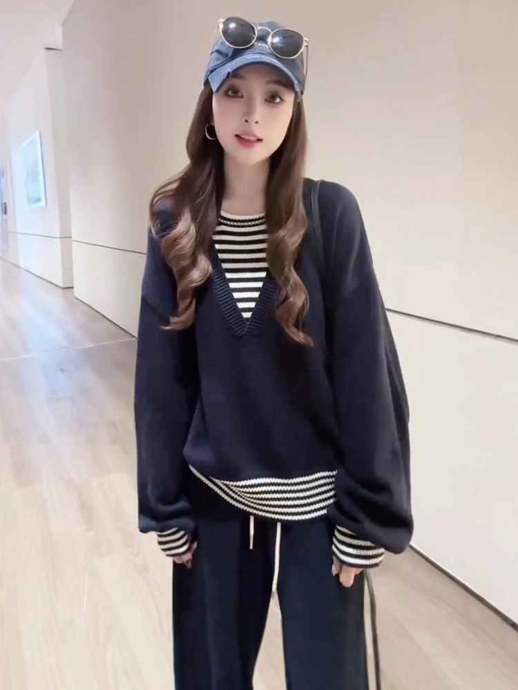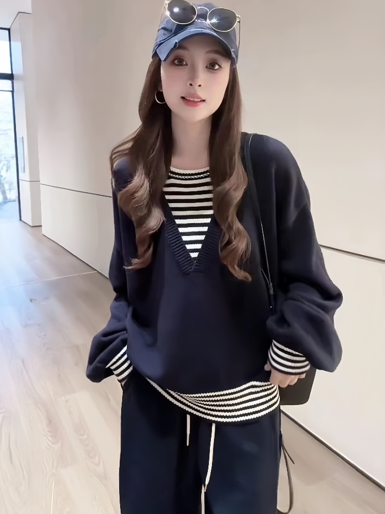 FA50169# 韩系慵懒风假两件拼接条纹撞色针织衫女秋冬新款气质宽松毛衣 服裝批發女裝批發服飾貨源