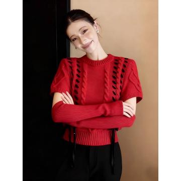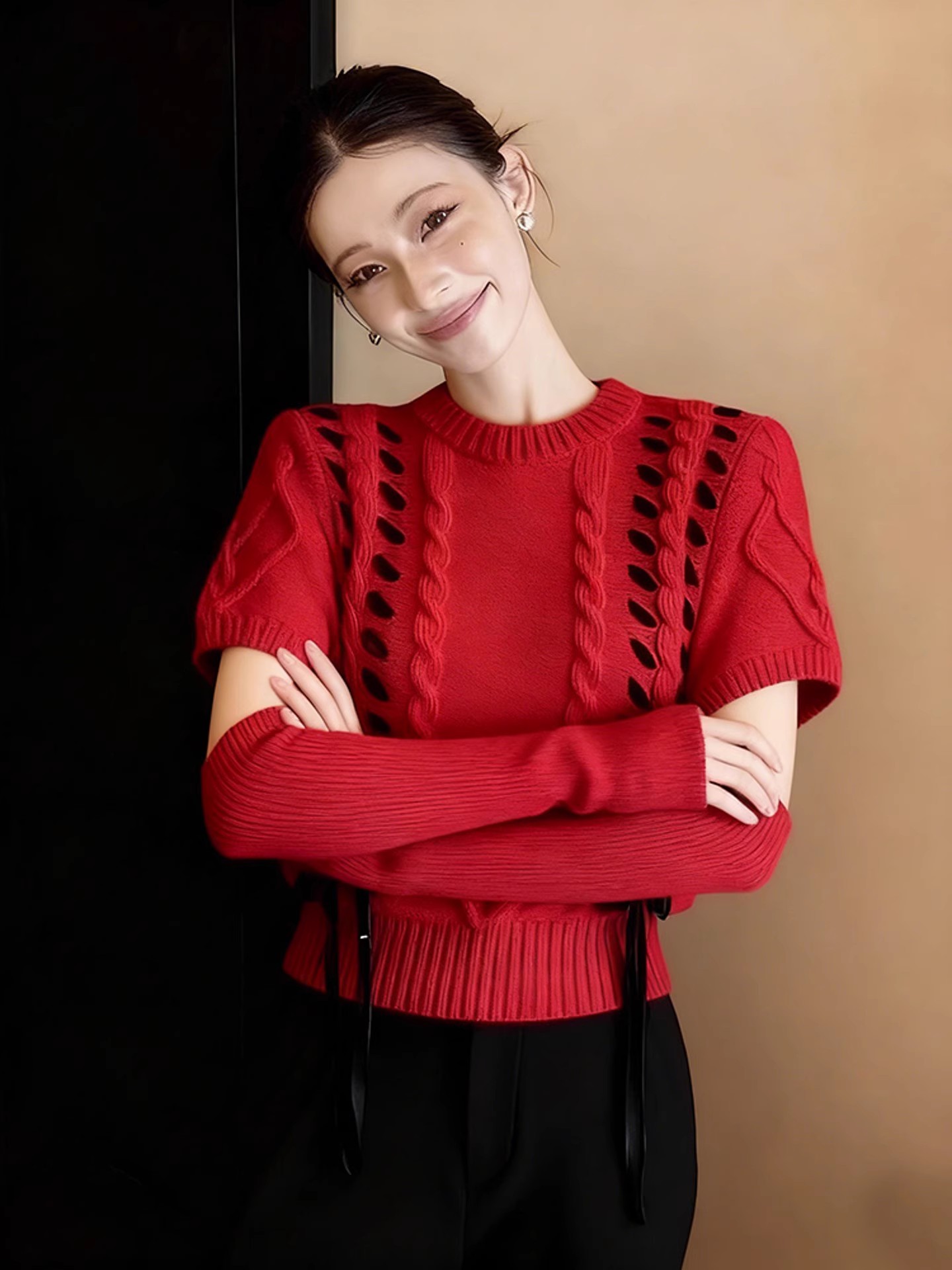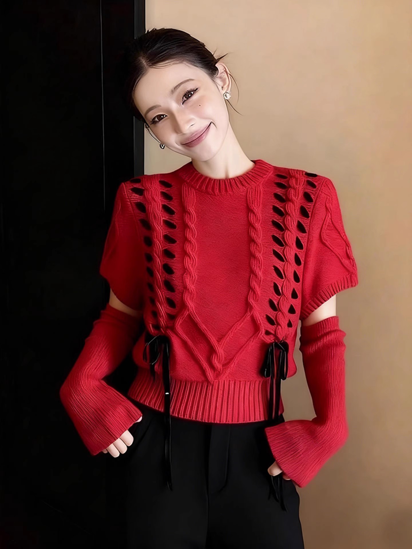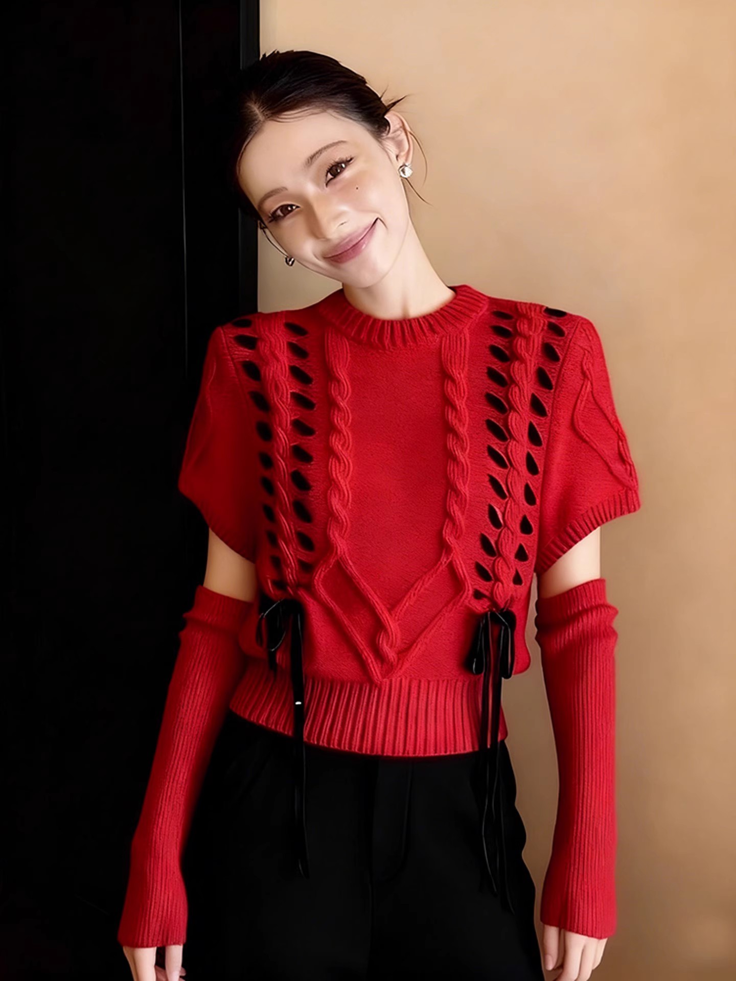 FA51378# 冬季圣诞氛围感穿搭巨好看上衣慵懒松弛感圆领红色袖套针织毛衣女 服裝批發女裝批發服飾貨源
