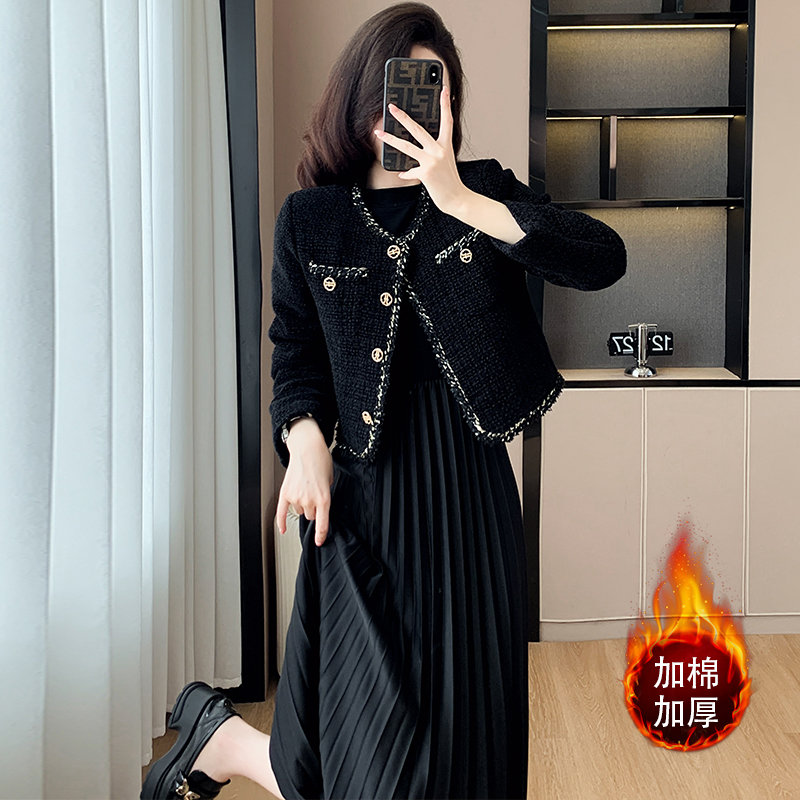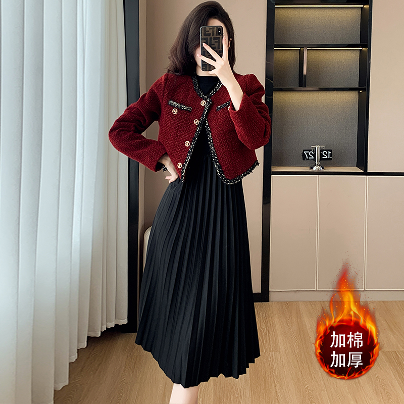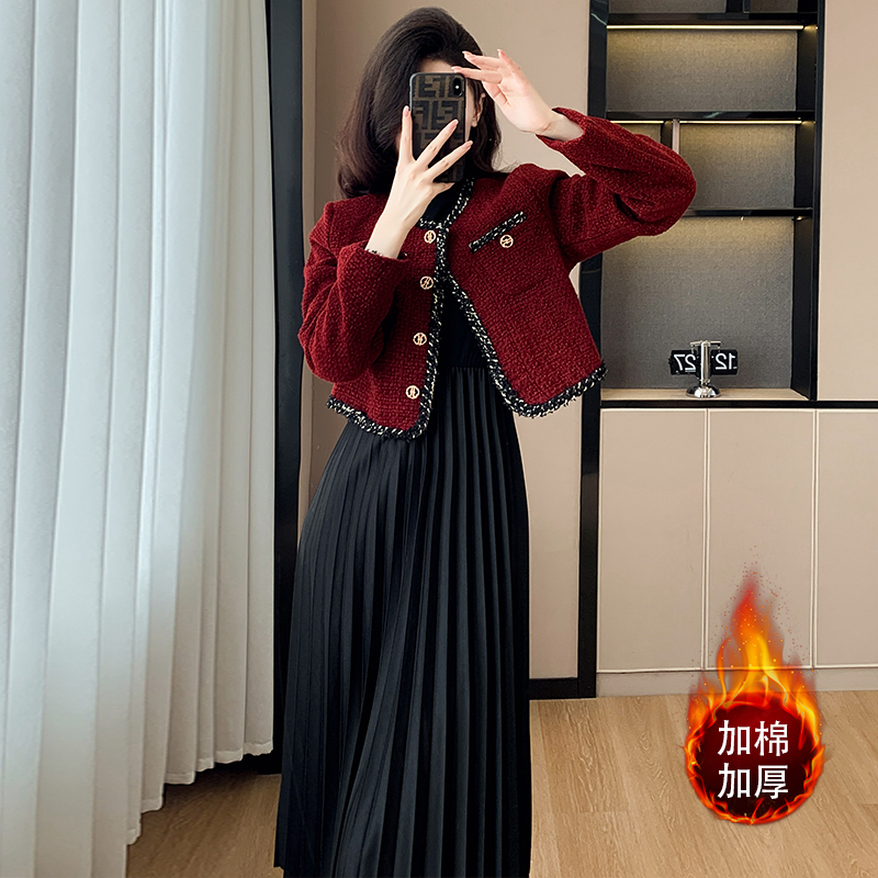 FA51386# 套装加棉法式小香风高级感红色连衣裙两件套女加厚短外套黑色秋冬 服裝批發女裝批發服飾貨源