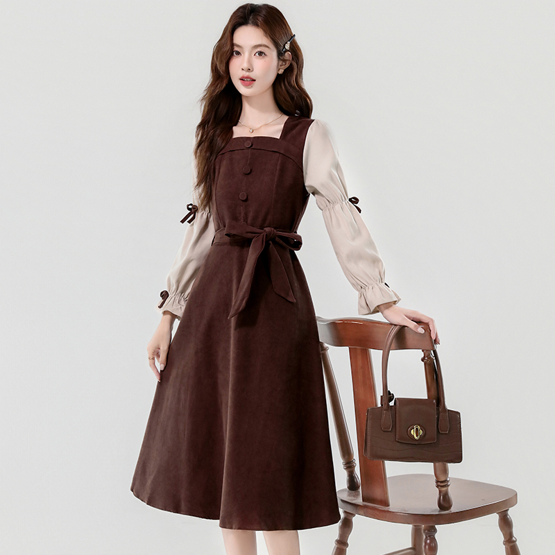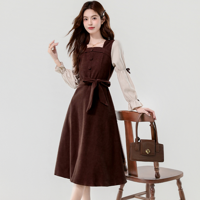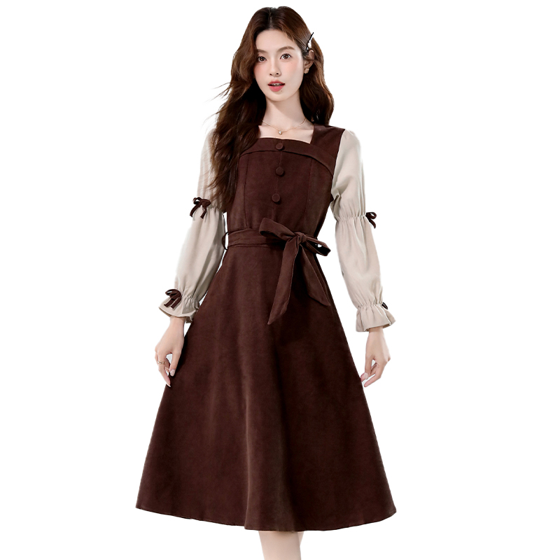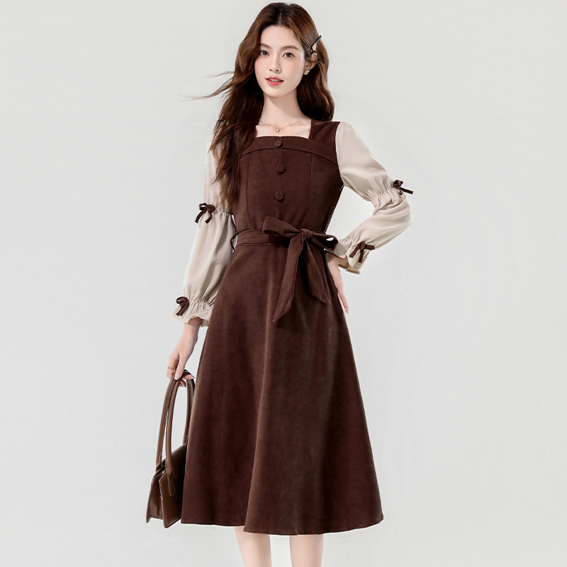 FA51391# 秋季方领长袖连衣裙收腰复古泡泡袖蝴蝶结灯芯绒美拉德色系女 服裝批發女裝批發服飾貨源