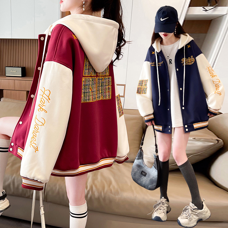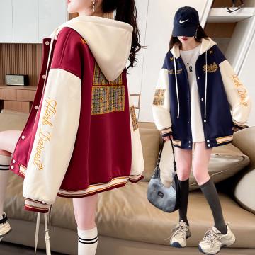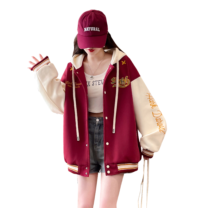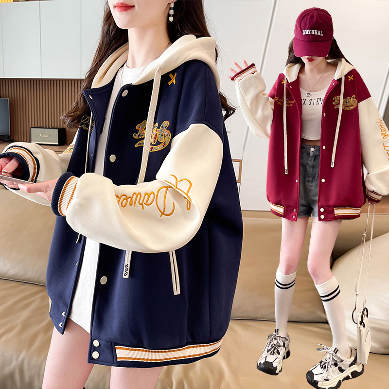 FA51586# 美式撞色春秋款重工刺绣新款高街连帽宽松棒球服夹克上衣 服裝批發女裝批發服飾貨源