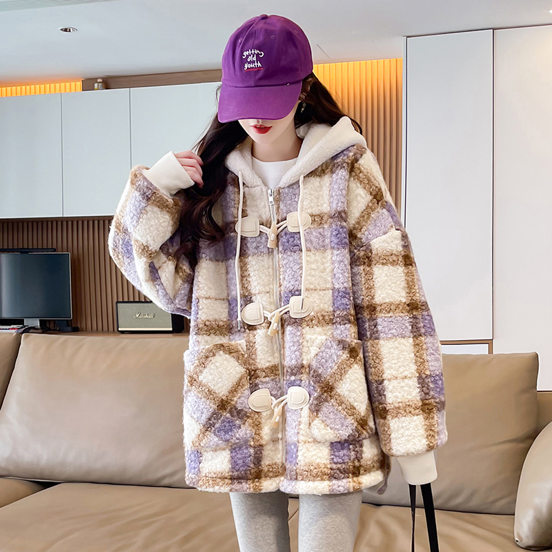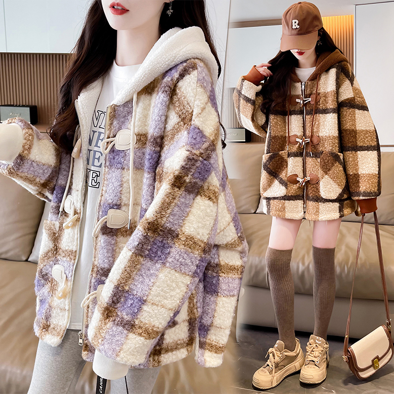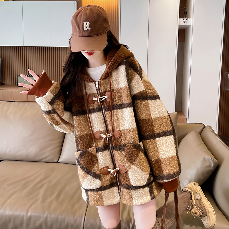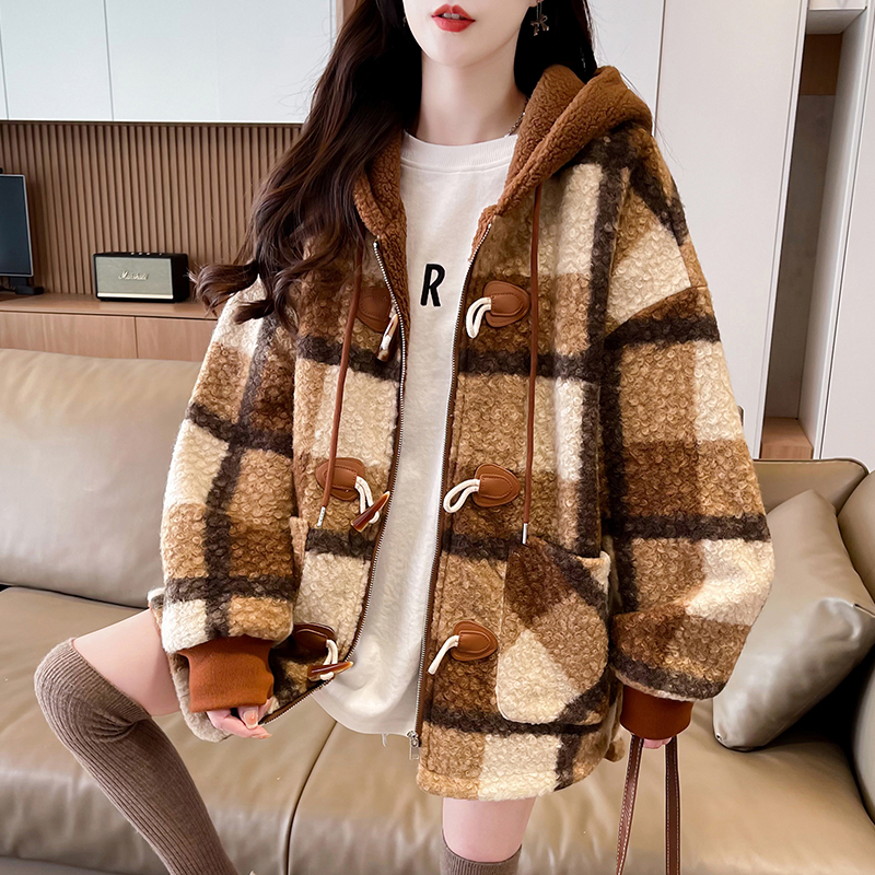 FA51589# 冬季新款加绒加厚羊圈呢羊羔毛韩版休闲宽松牛角扣国潮外套 服裝批發女裝批發服飾貨源