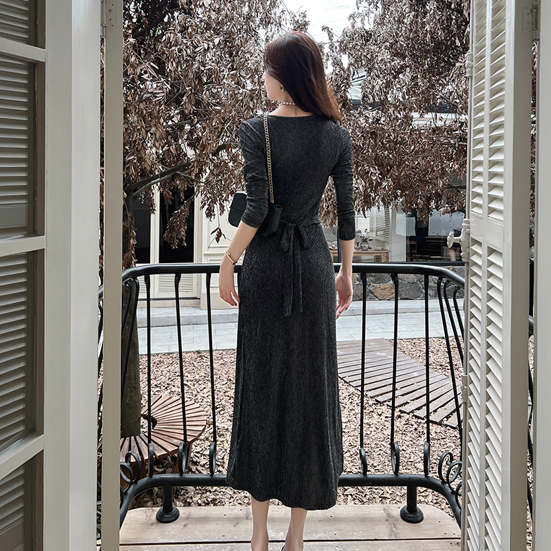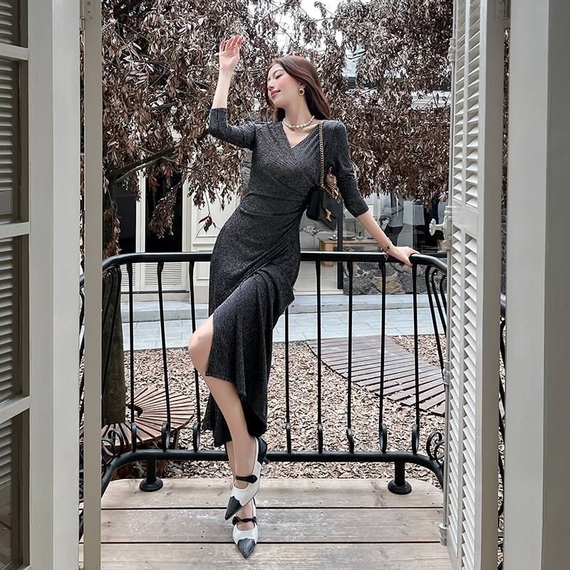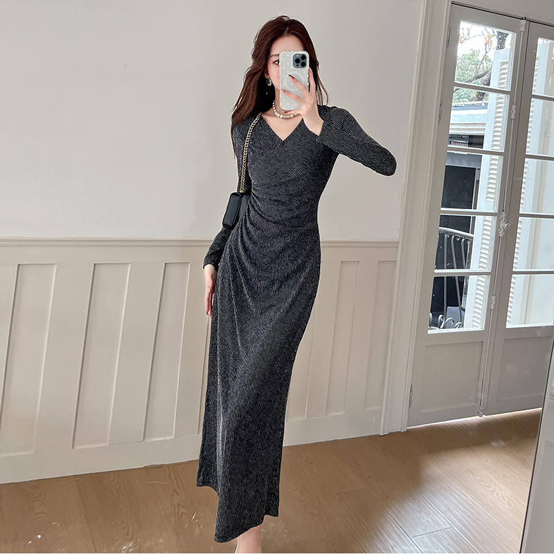 FA51592# 气质高档性感V领包臀长裙秋冬新款高级感长袖亮丝修身连衣裙
