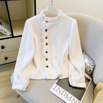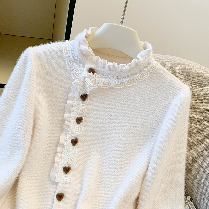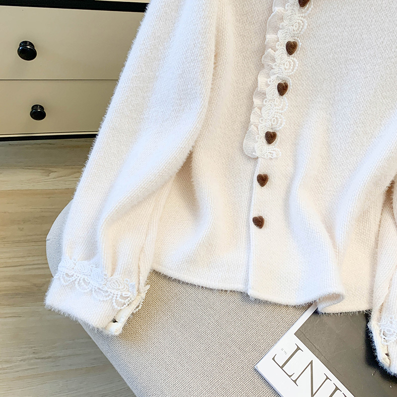 秋冬新款甜美复古木耳花边爱心纽扣毛绒针织上衣小众宽松绒衫