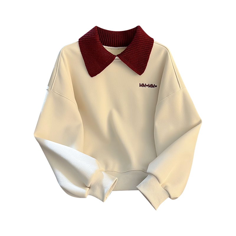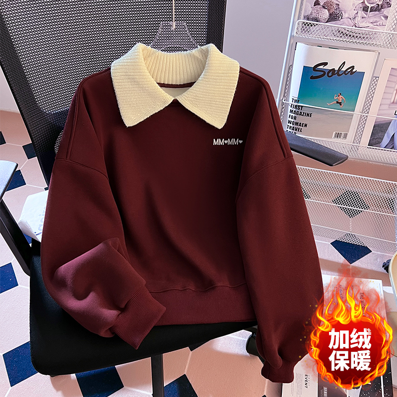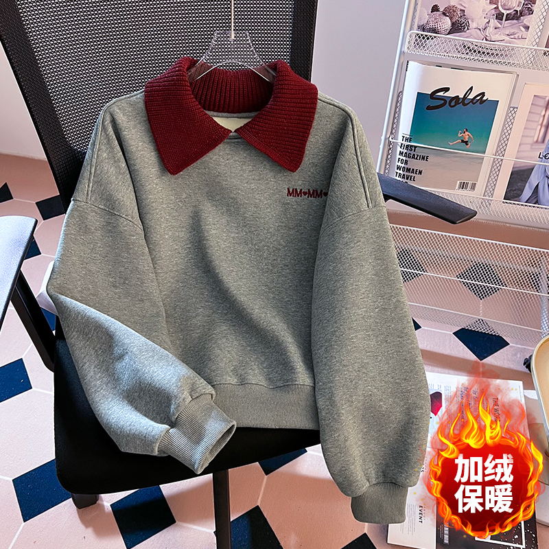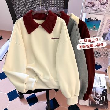 FA55145# 秋冬新款韩版慵懒宽松显瘦毛织拼色polo领加绒加厚卫衣女 服裝批發女裝批發服飾貨源