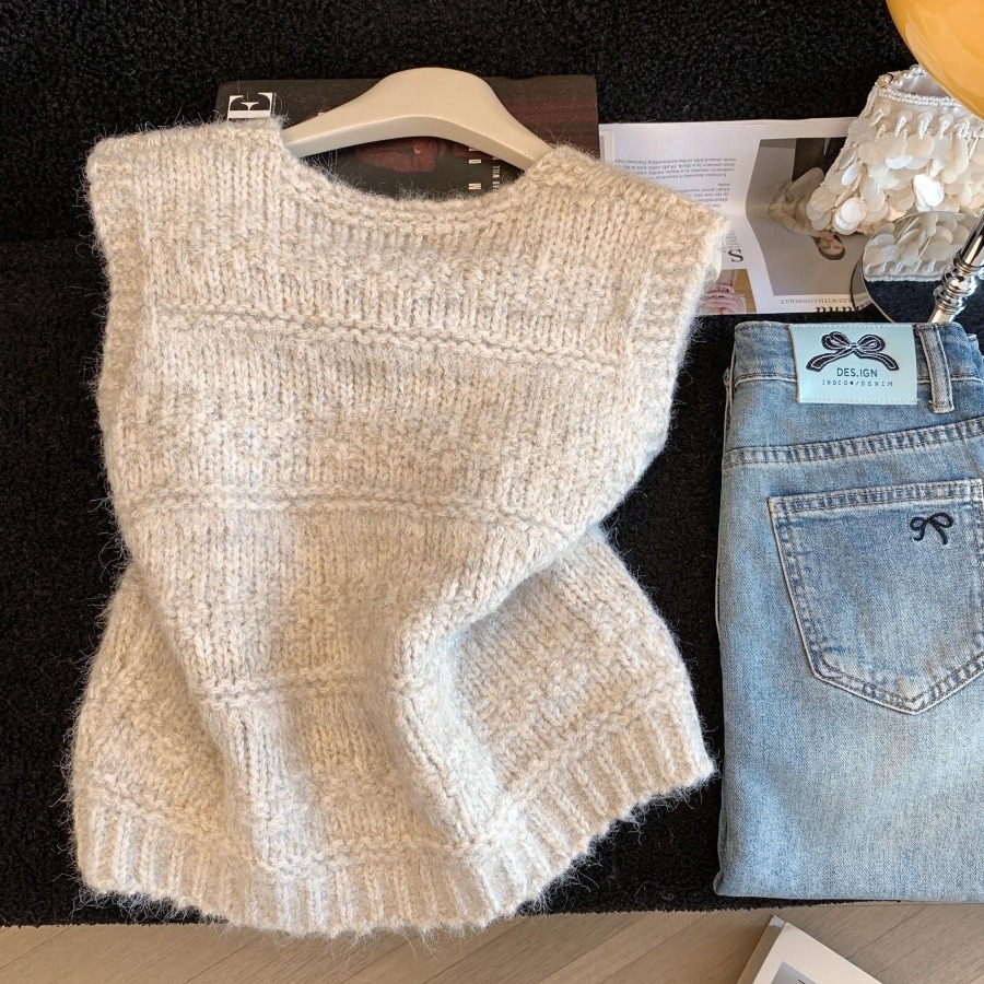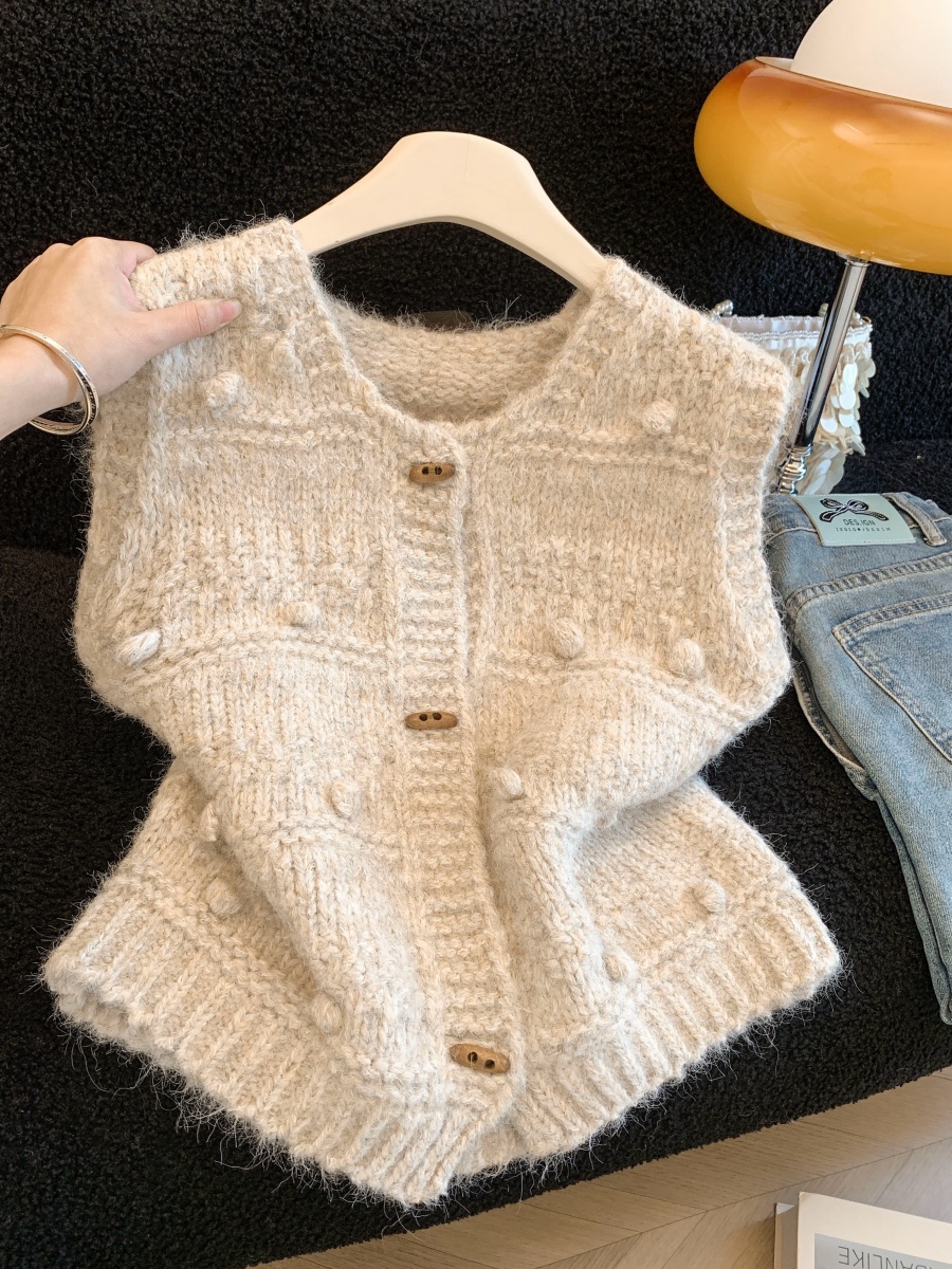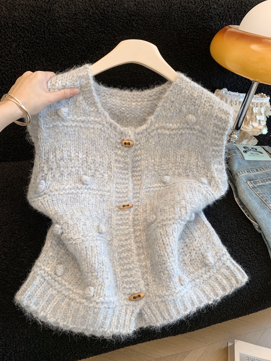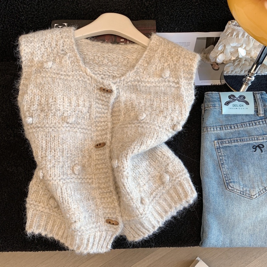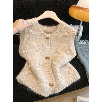 FA55265# 韩版立体毛球针织马甲女冬季款复古牛角扣马夹背心叠穿无袖小上衣 服裝批發女裝批發服飾貨源