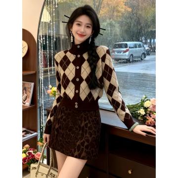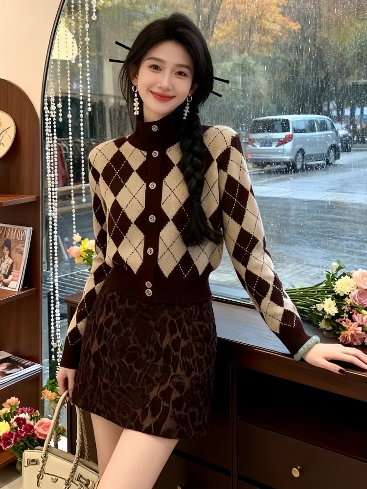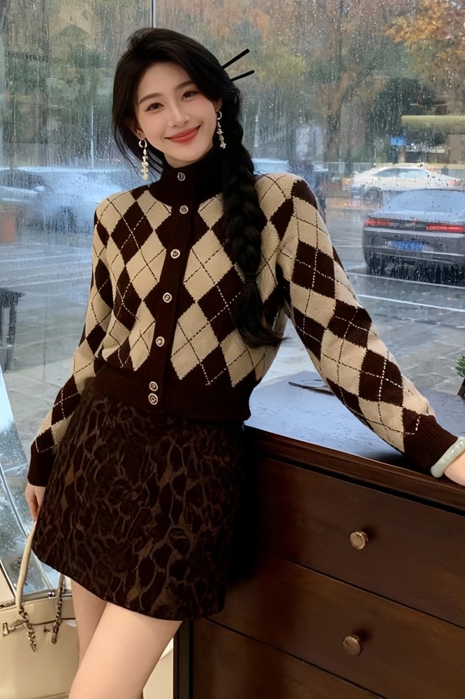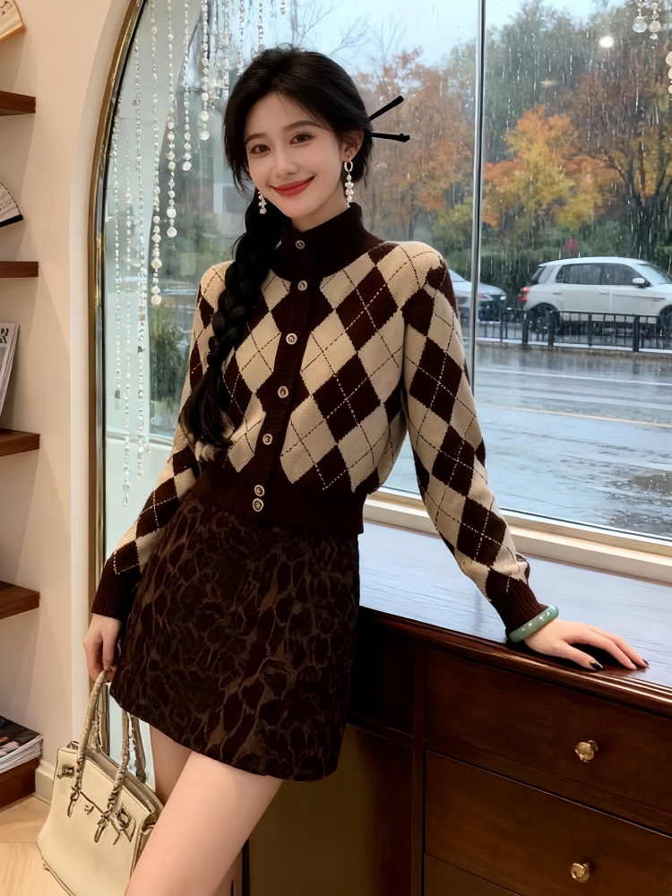 FA55306# 冬季新款韩版女装修身百搭菱格针织开衫上衣外套复古减龄毛衣 服裝批發女裝批發服飾貨源