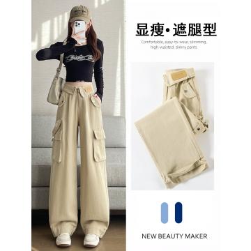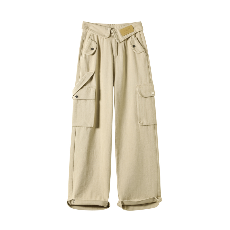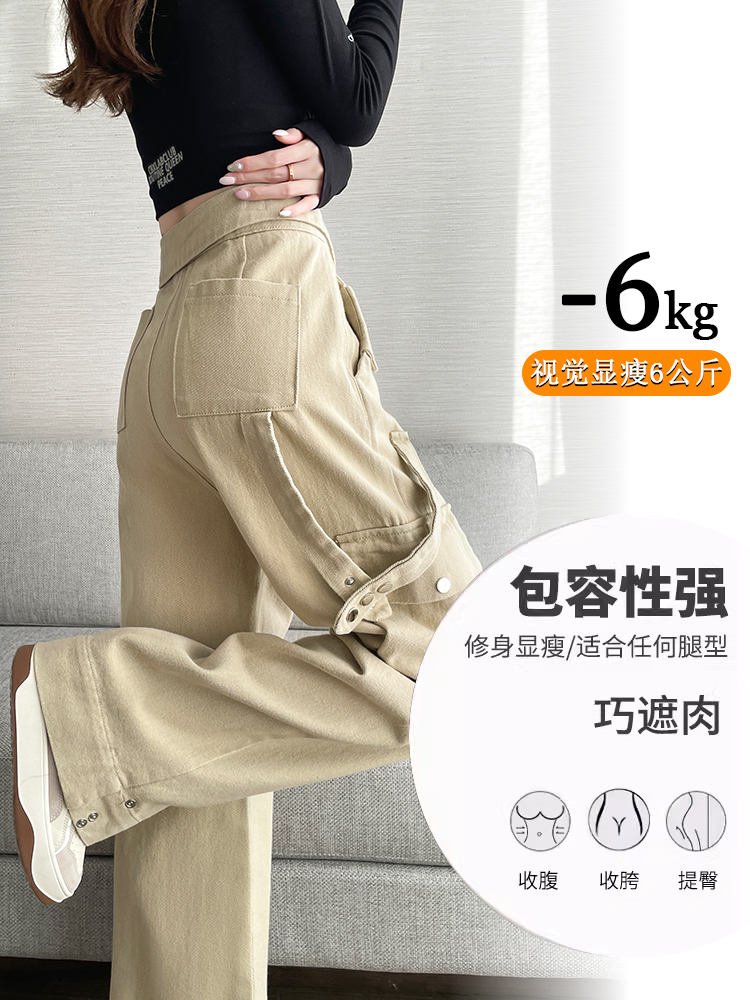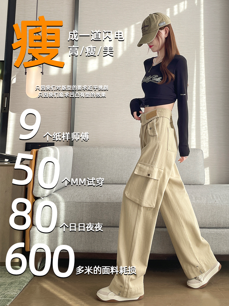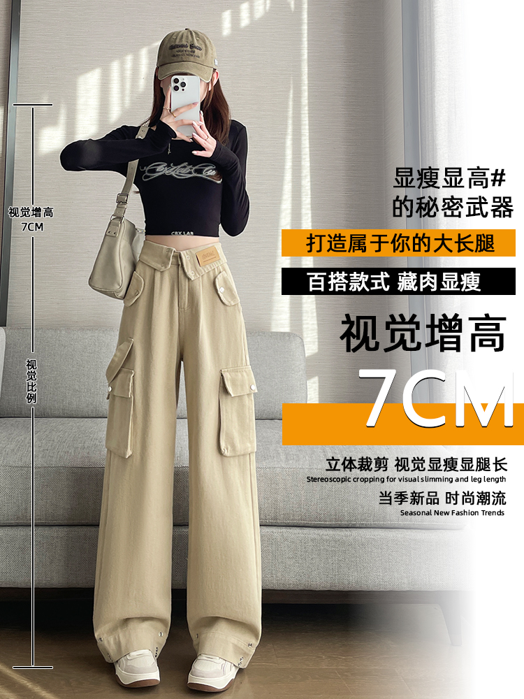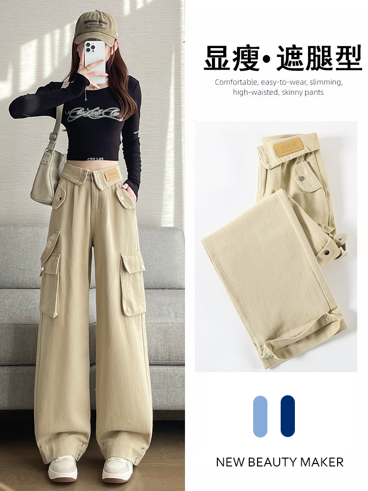 FA55820# 卡其色工装阔腿牛仔裤女春季新款高腰设计感直筒拖地裤子 服裝批發女裝批發服飾貨源