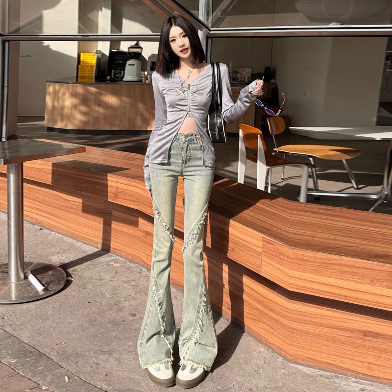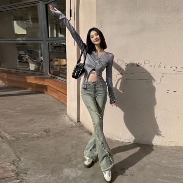 FA55828# 复古水洗高腰层次感设计毛边辣妹显高拖地喇叭裤 服裝批發女裝批發服飾貨源