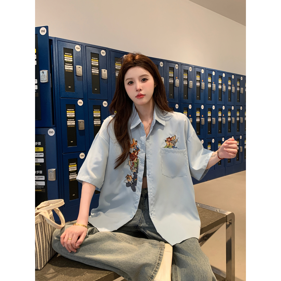 FA56468# 日系复古卡通刺绣衬衫女短袖宽松情侣百搭休闲上衣服春夏 服裝批發女裝批發服飾貨源