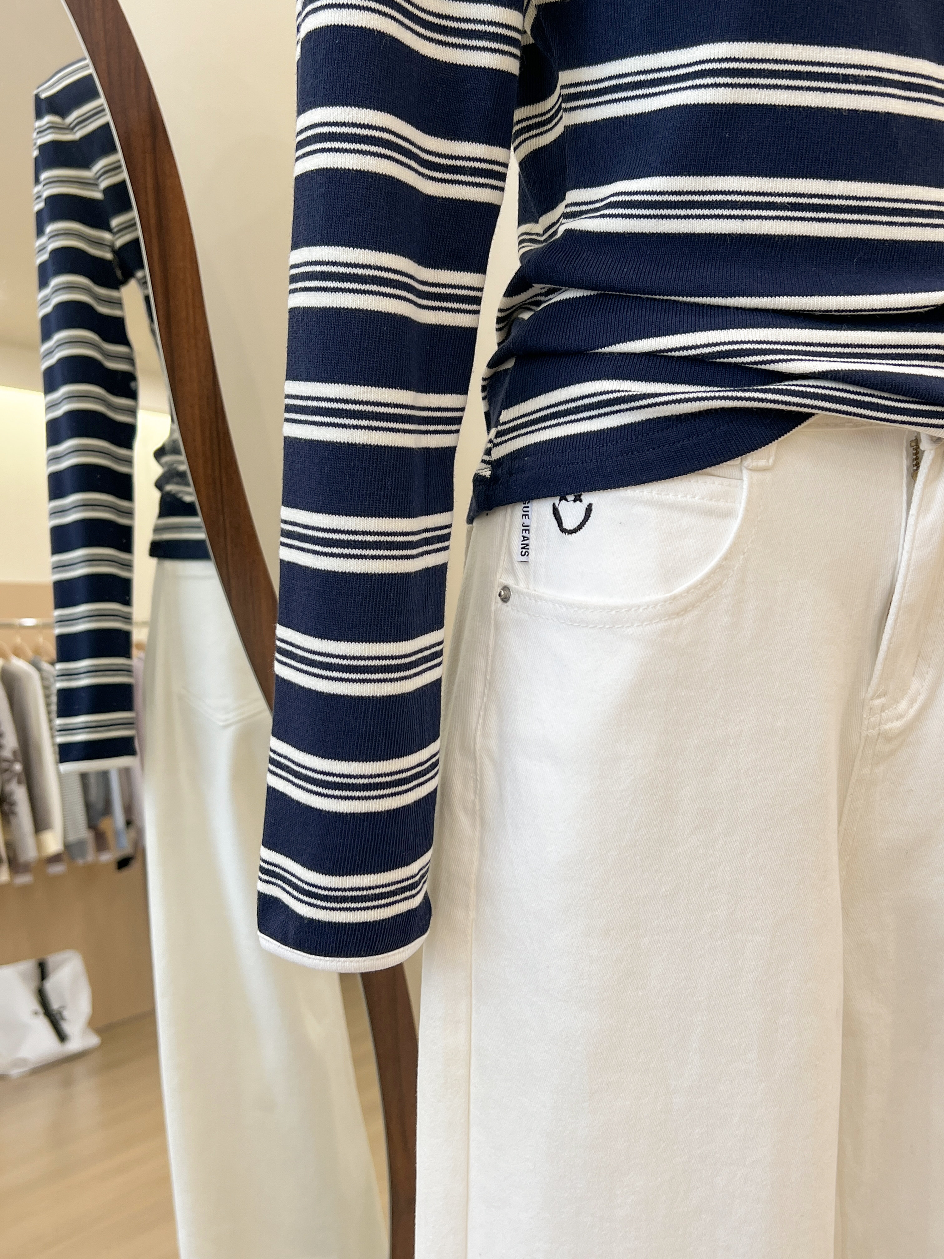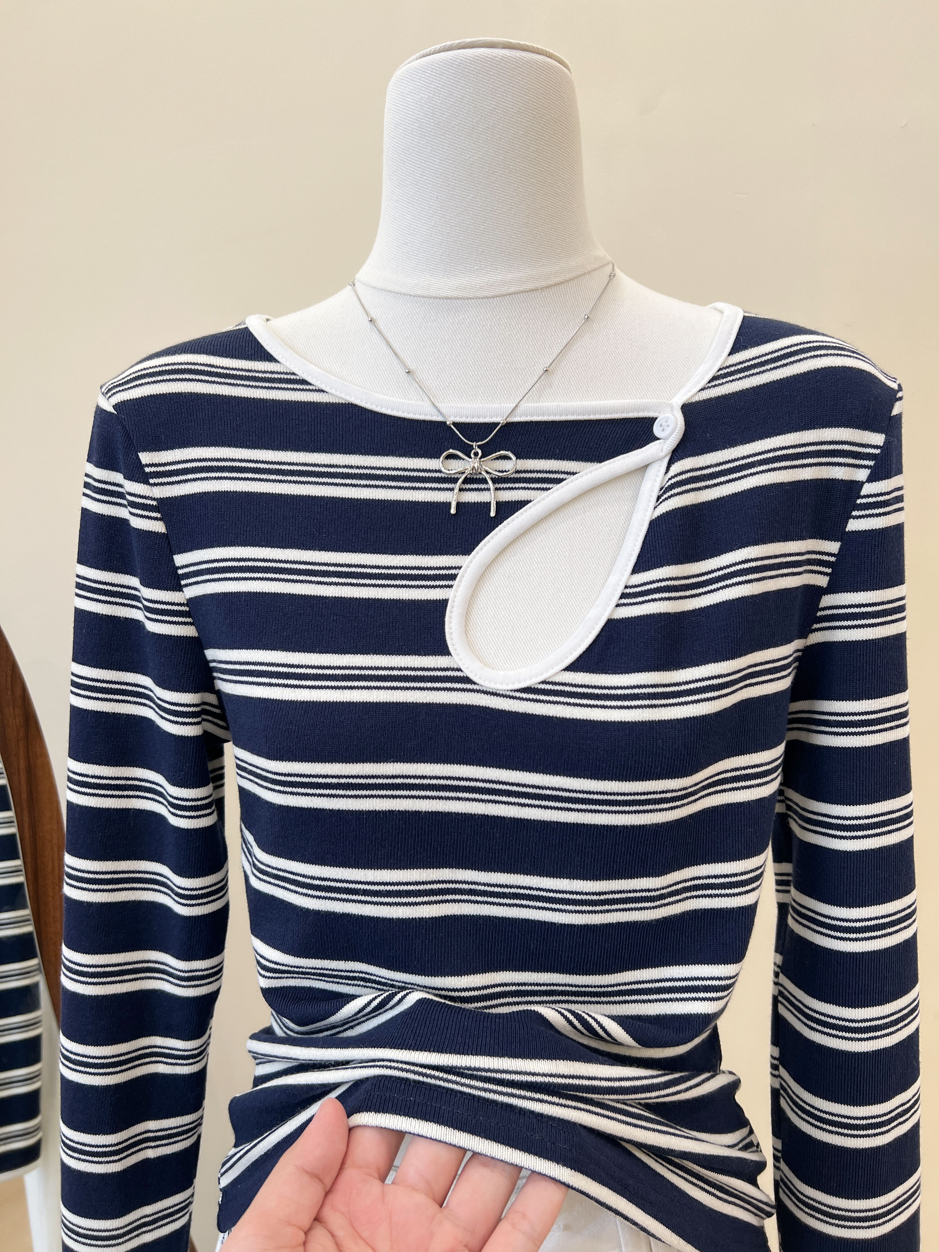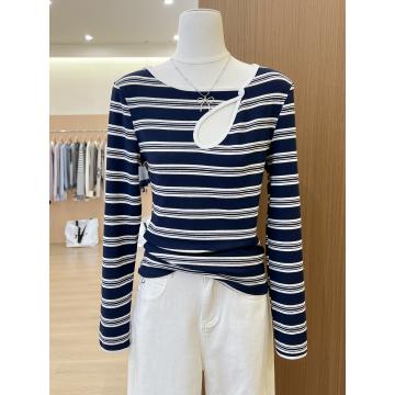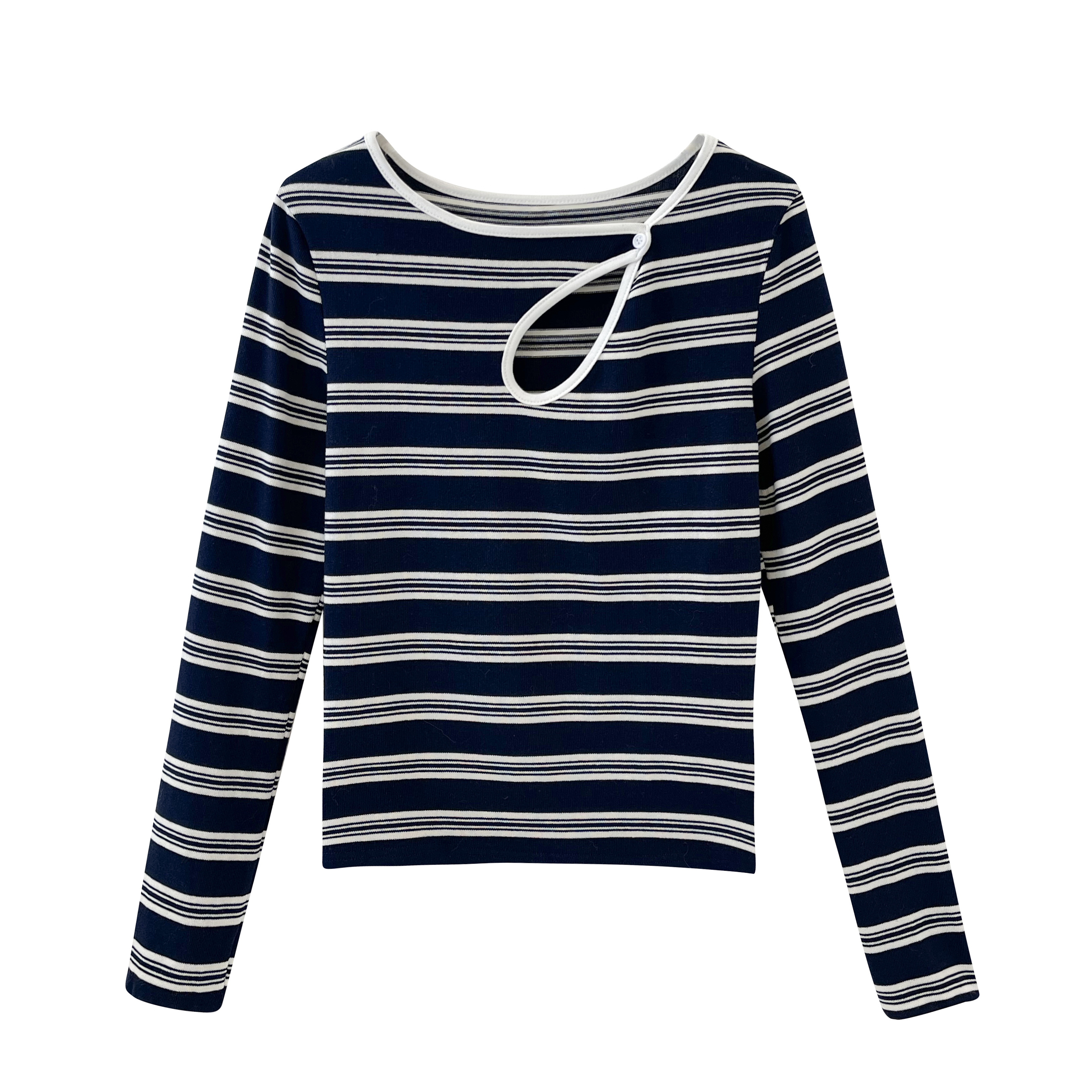 FA56581# 藏蓝色条纹镂空长袖T恤女秋冬打底衫短款紧身上衣 服裝批發女裝批發服飾貨源