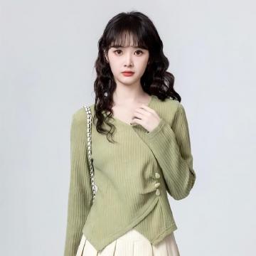 FA56587# 韩系绿色不规则V领长袖T恤女春秋设计感独特上衣 服裝批發女裝批發服飾貨源