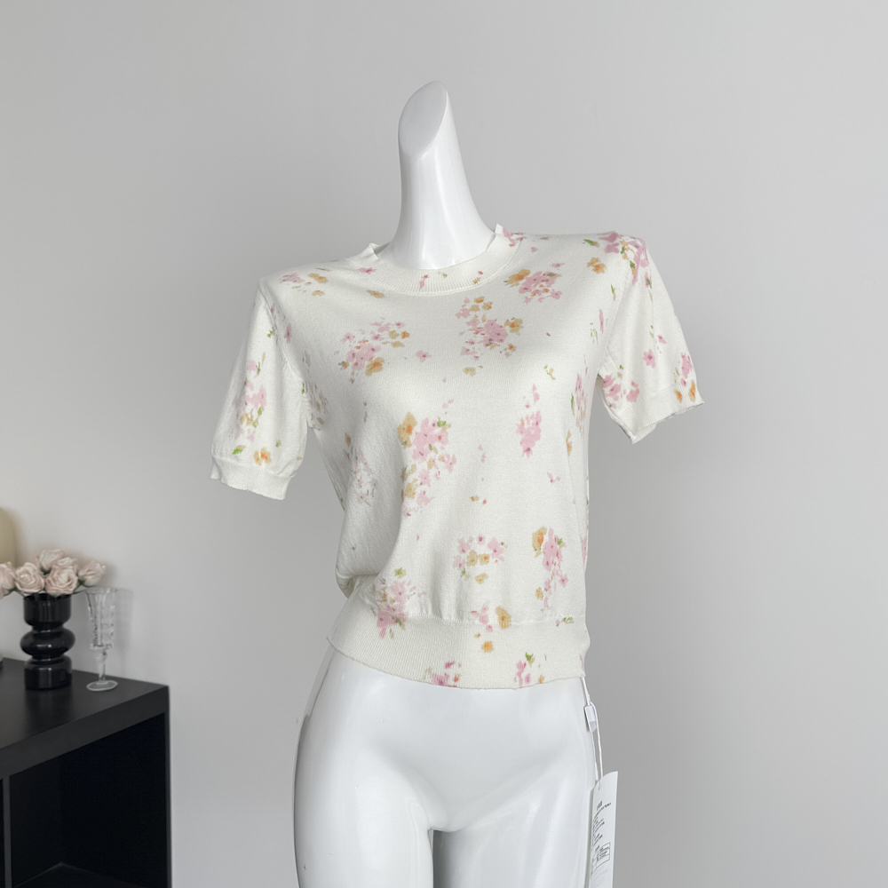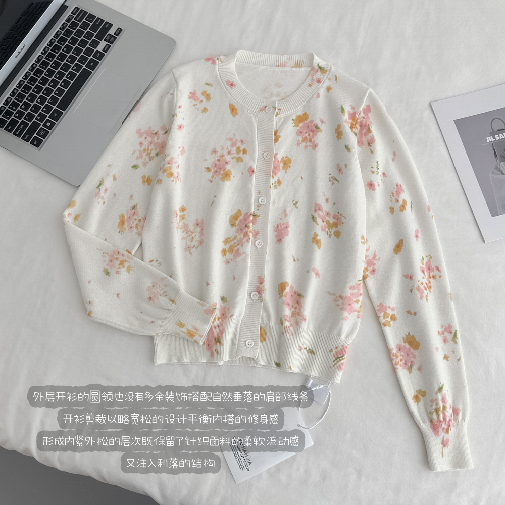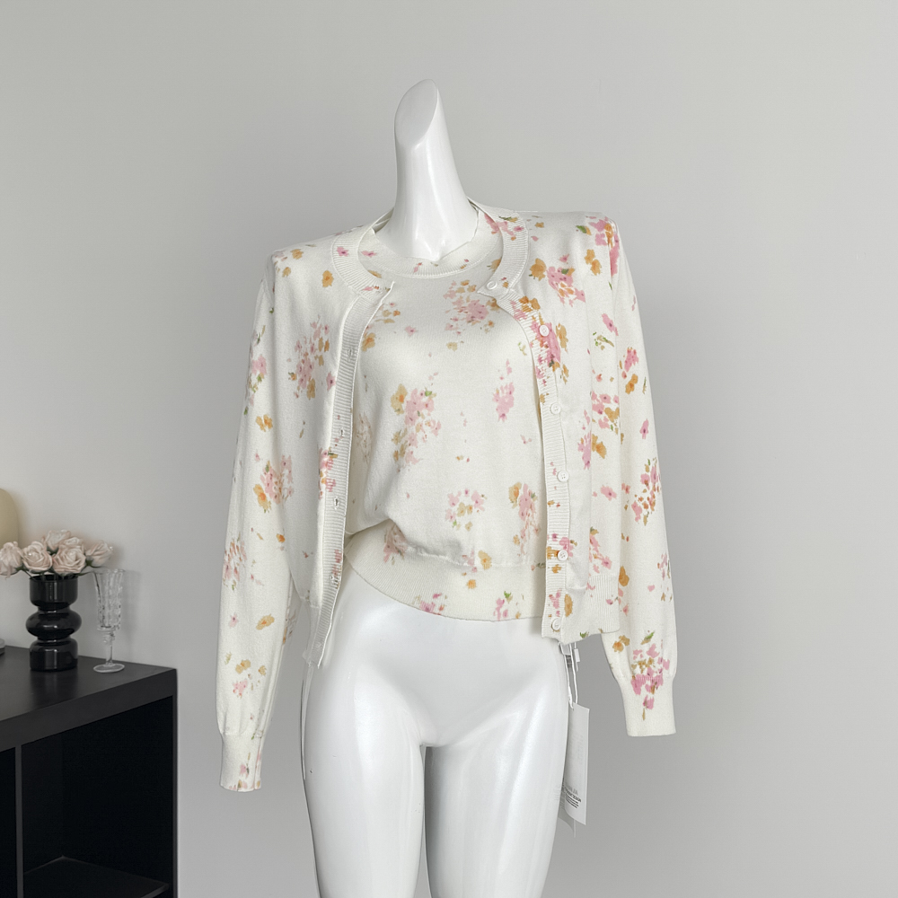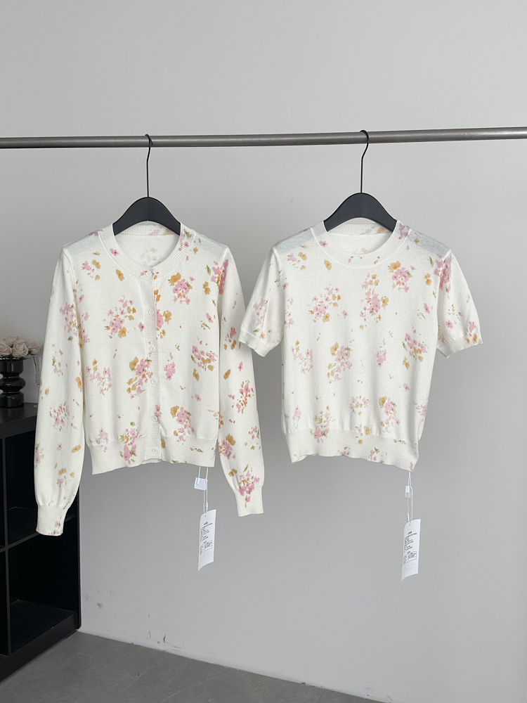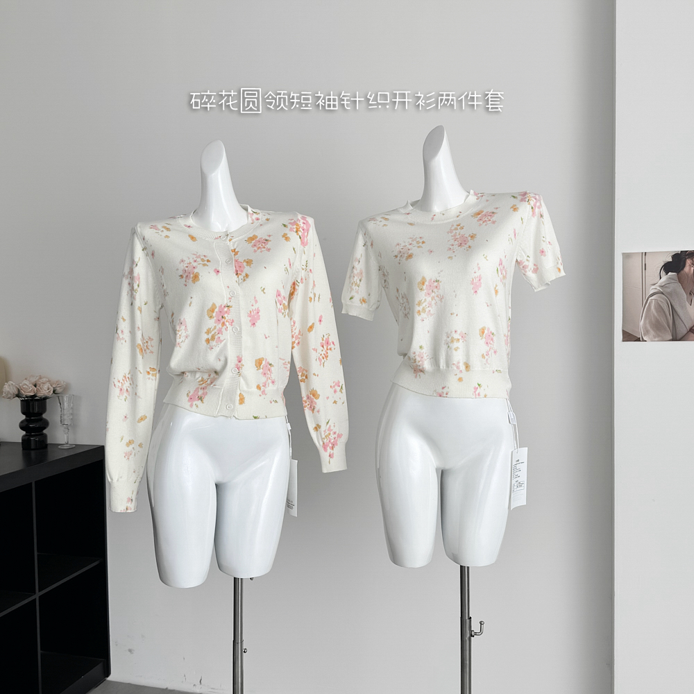 FA56594# 周美美温柔效应粉色碎花羊毛圆领短袖针织开衫两件套 服裝批發女裝批發服飾貨源