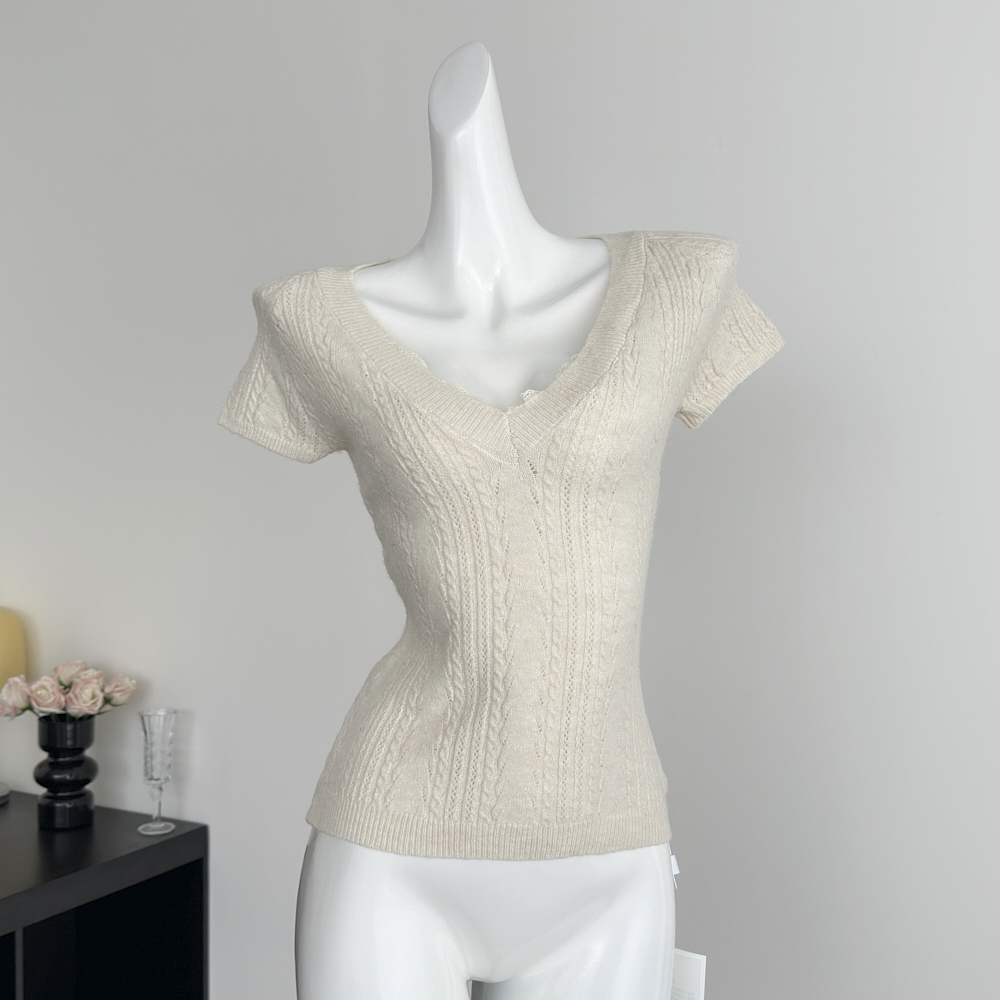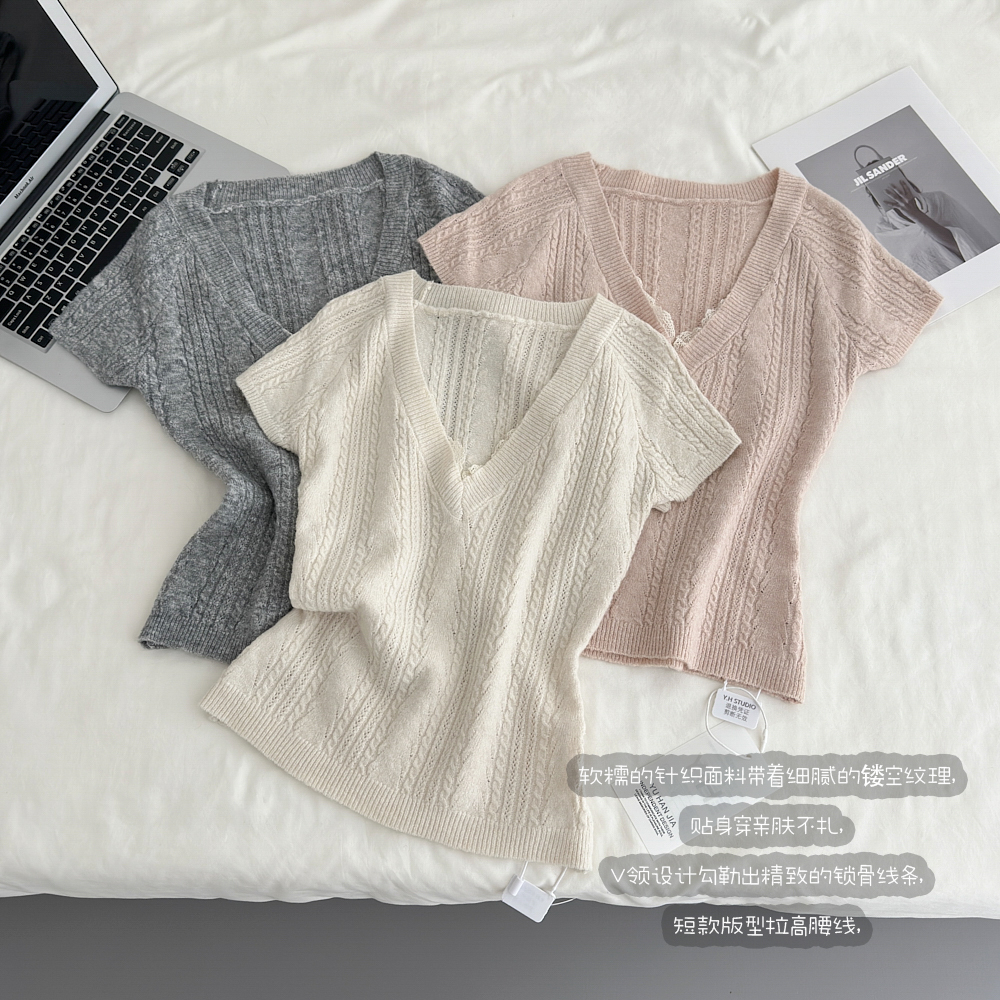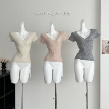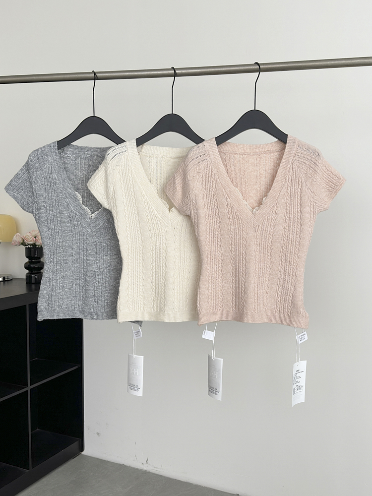 FA56601# 你的懒懒LLan私心柔光丝绸缎面V领针织T+蕾丝女 服裝批發女裝批發服飾貨源