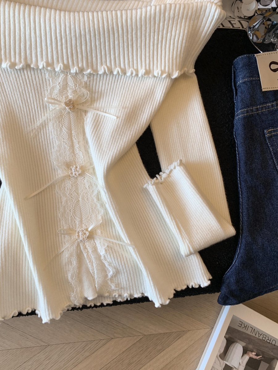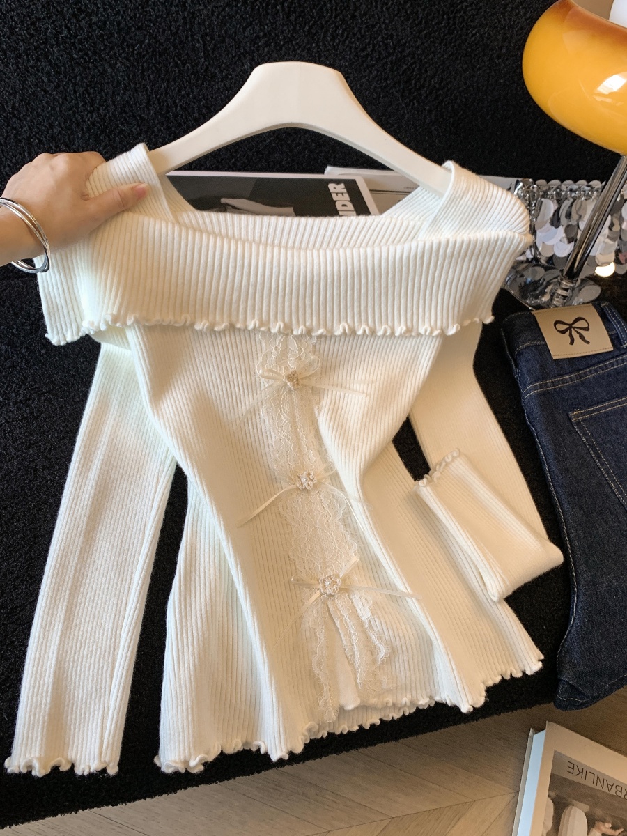 FA56613# 早春季法式温柔风一字肩木耳边针织衫女拼接蕾丝显瘦上衣 服裝批發女裝批發服飾貨源