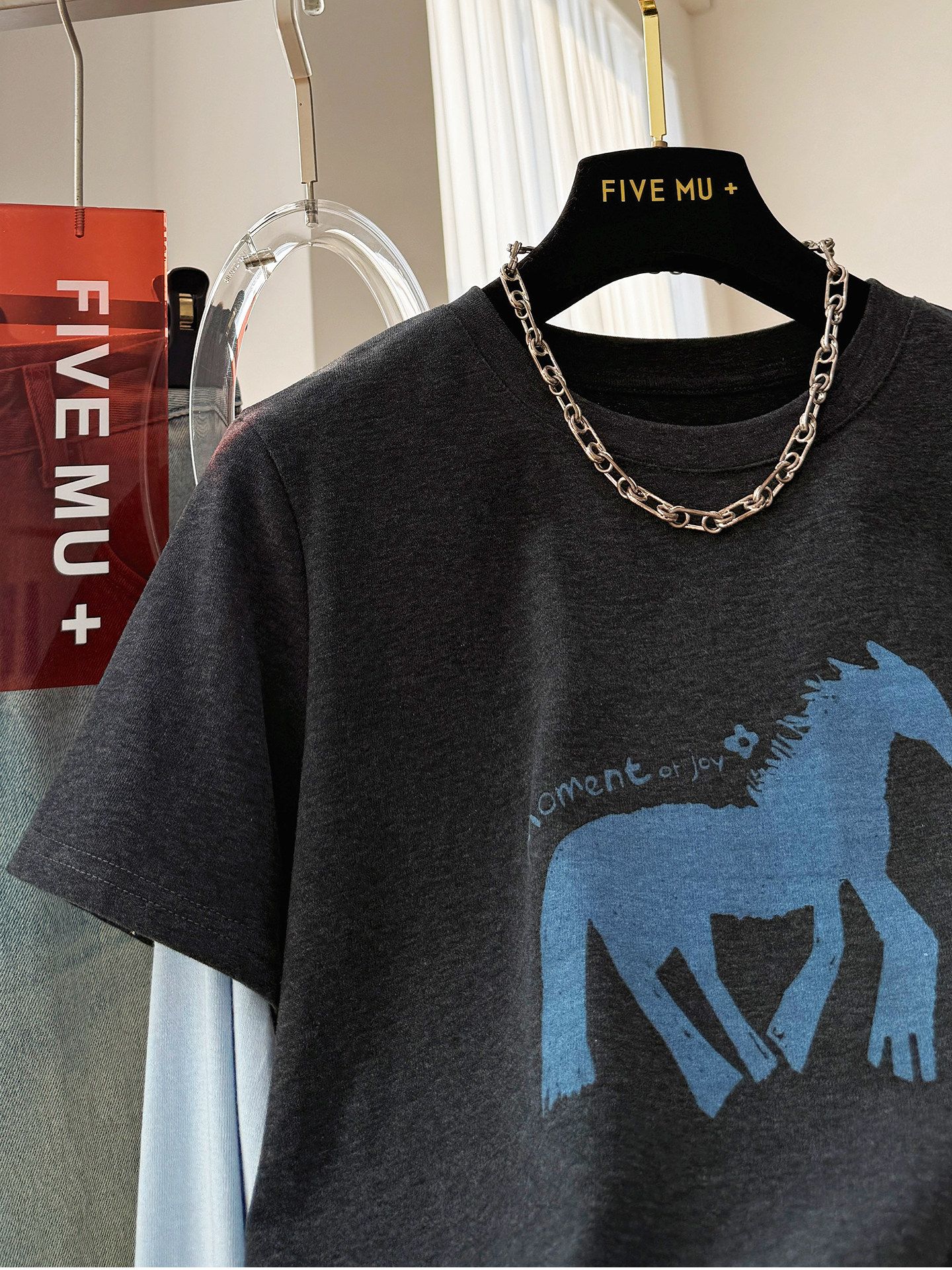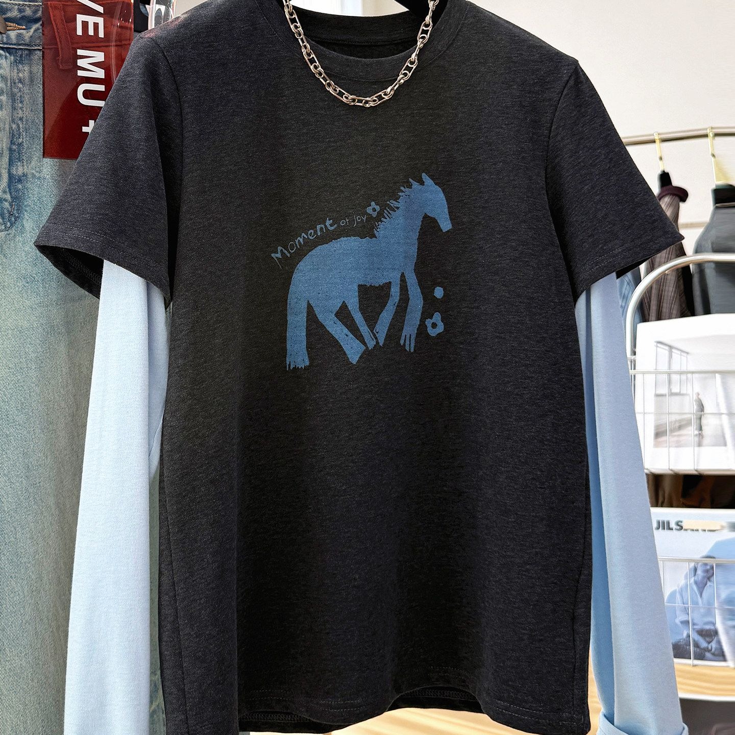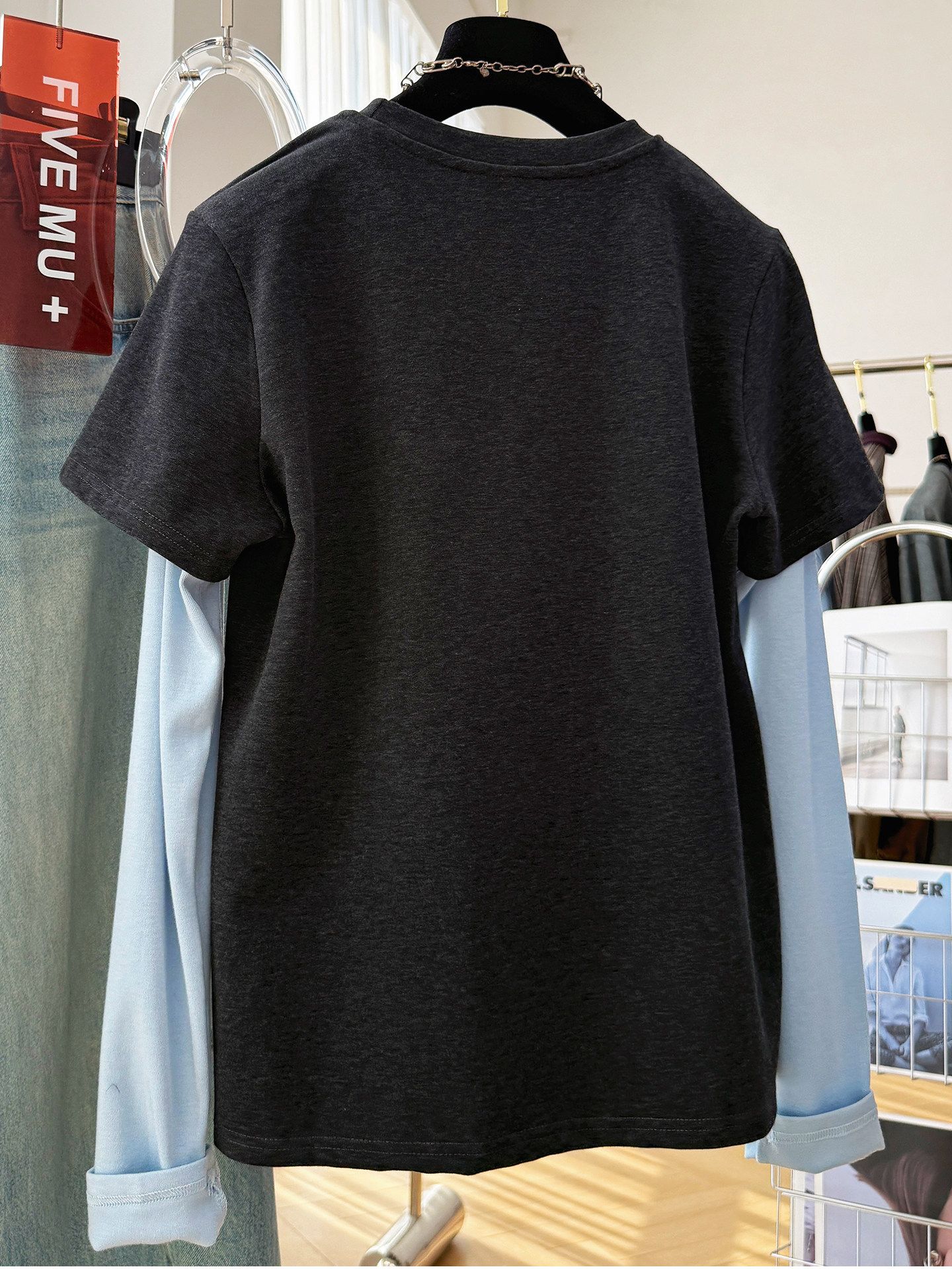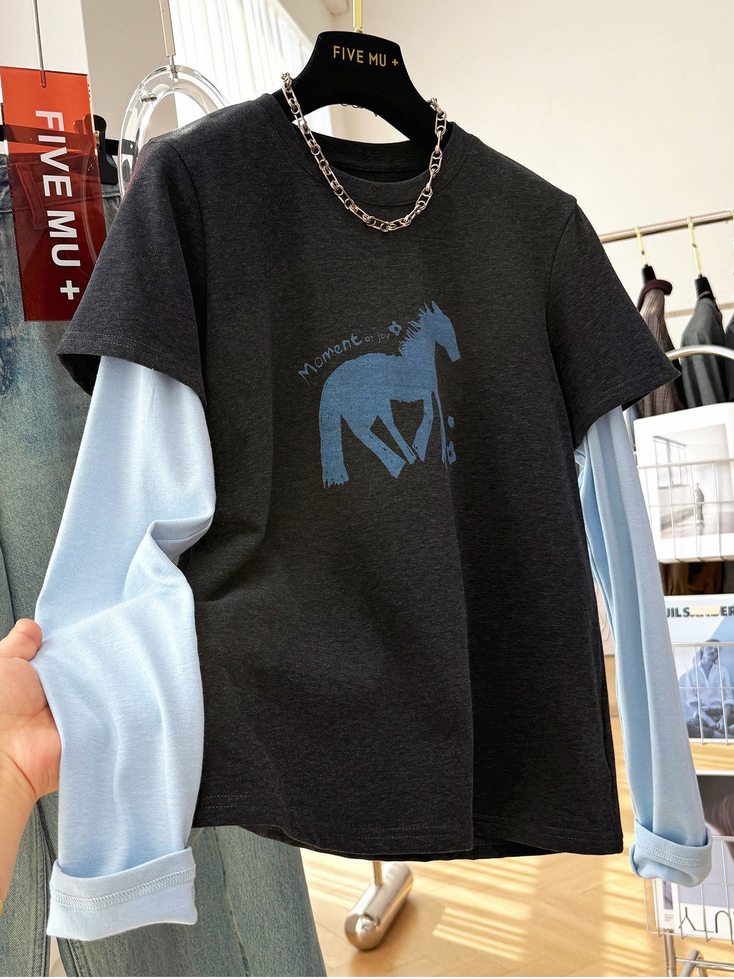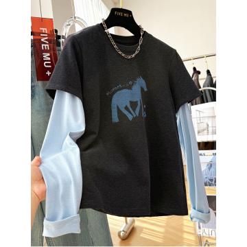 FA56621# 德绒大码300斤春韩系卡通印花拼接假两件长袖T恤女内搭打底衫上衣 服裝批發女裝批發服飾貨源