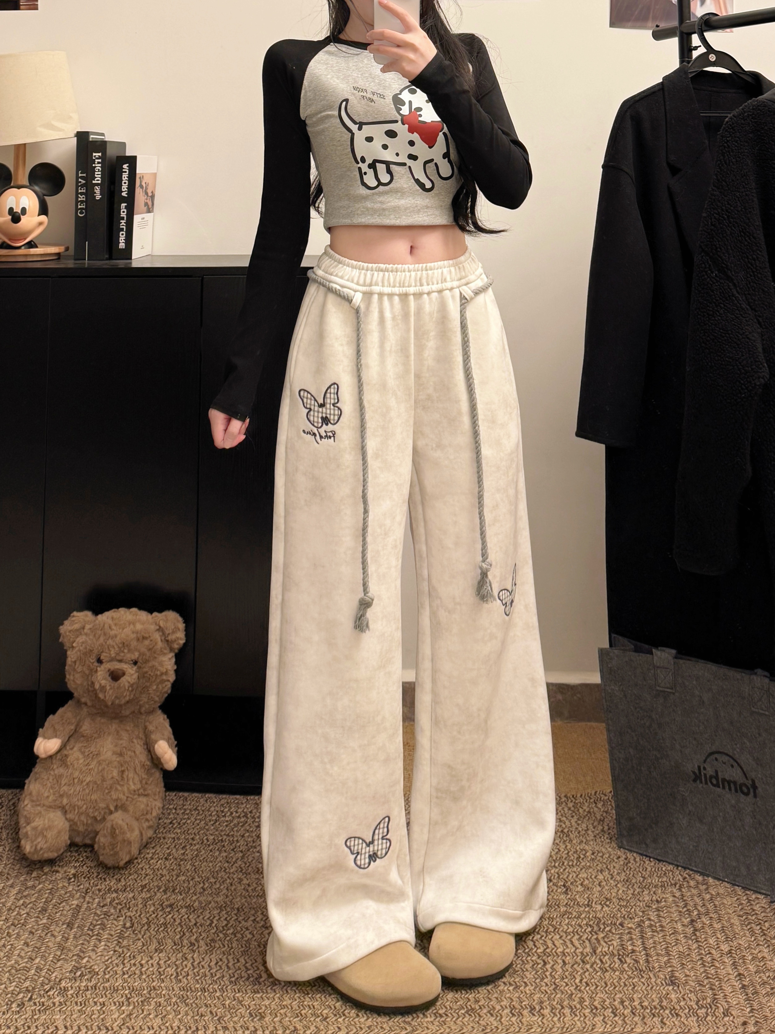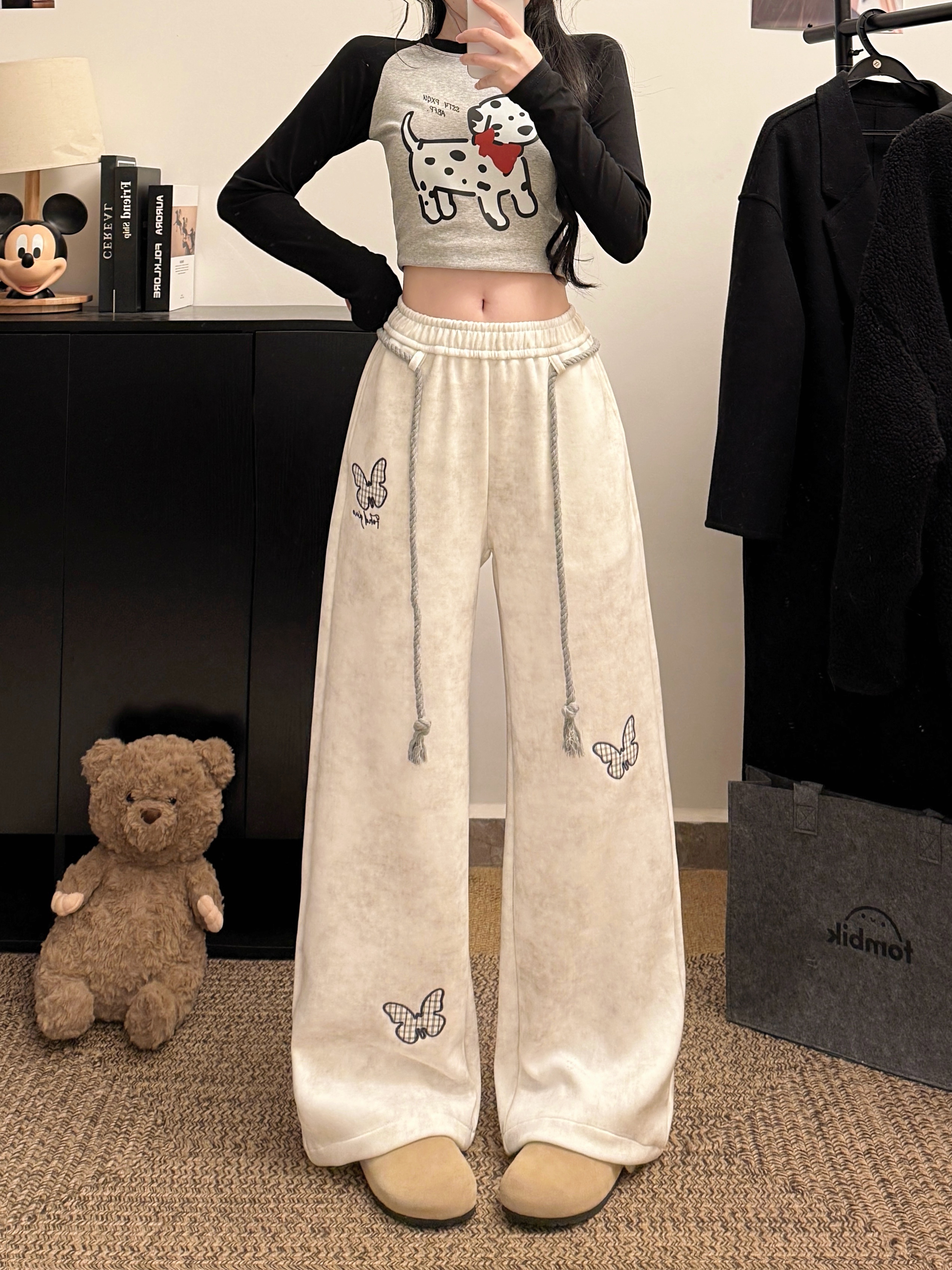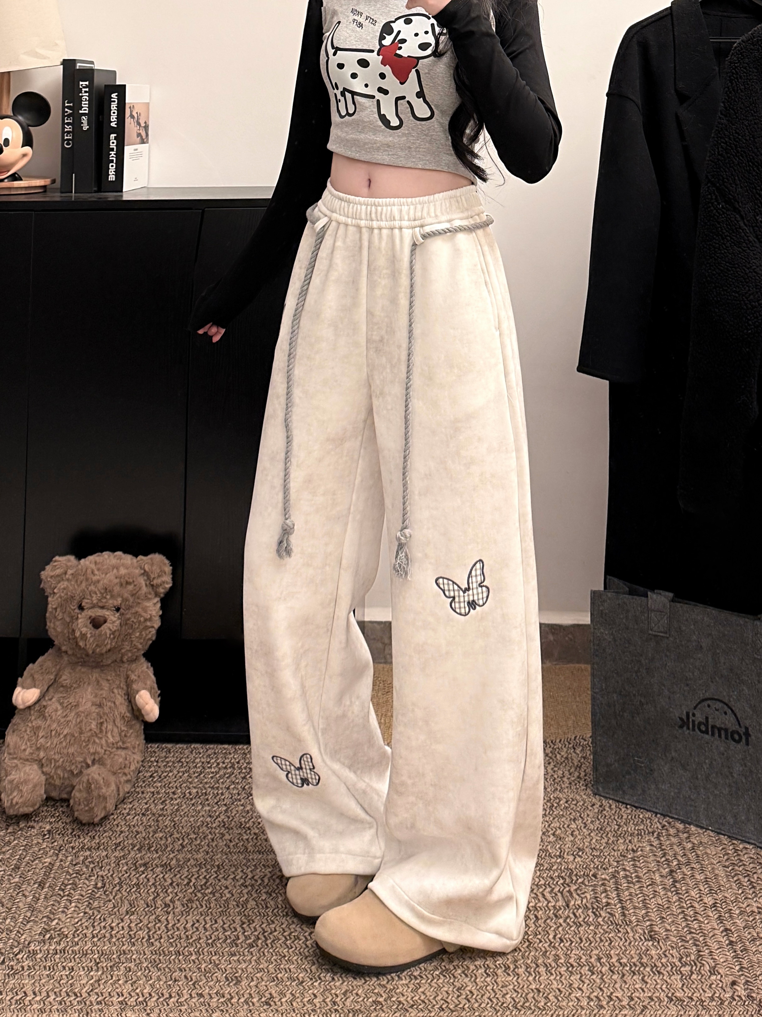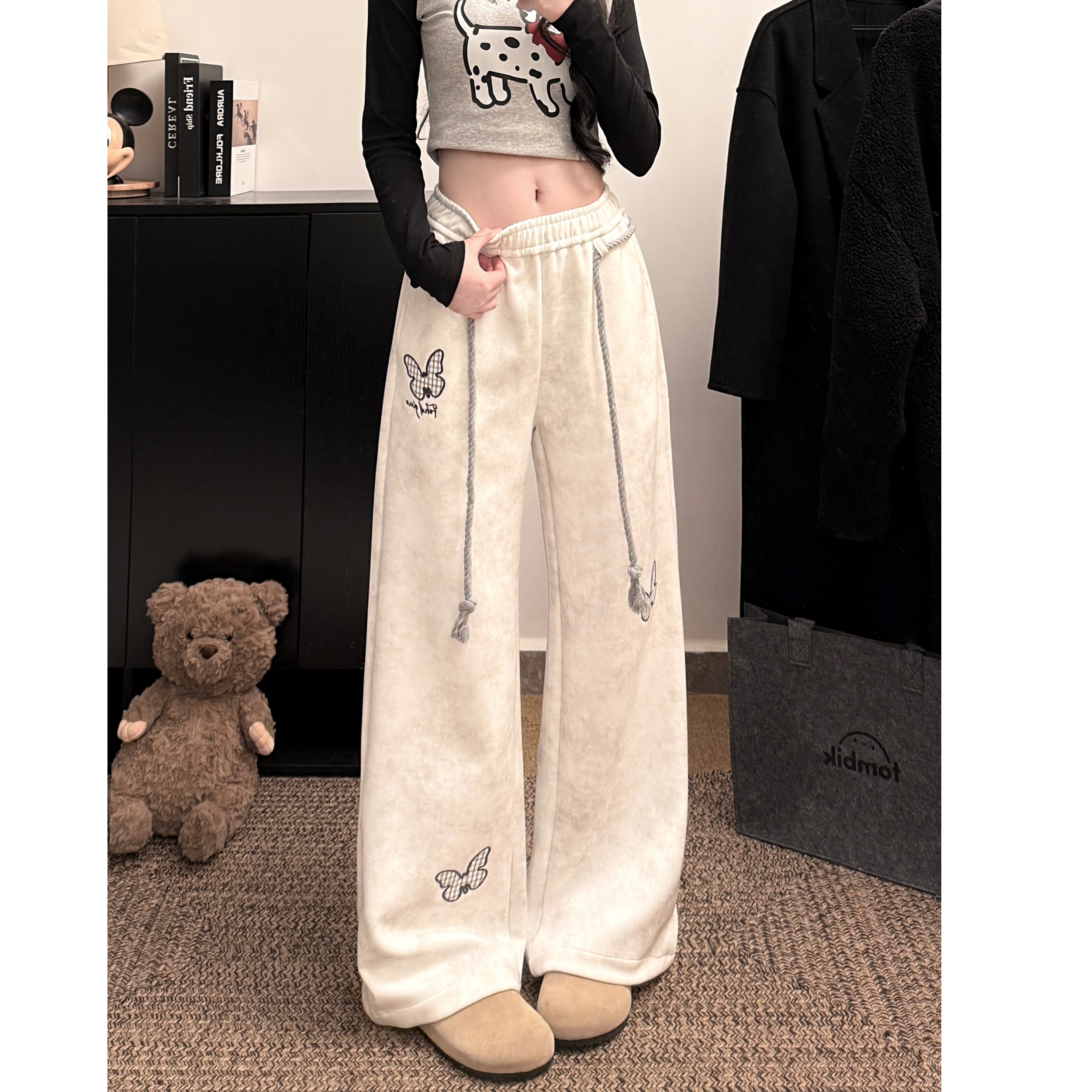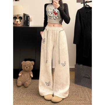 FA56805# 韩系白灰色蝴蝶刺绣运动卫裤女春夏麻花腰绳宽松慵懒休闲长裤 服裝批發女裝批發服飾貨源