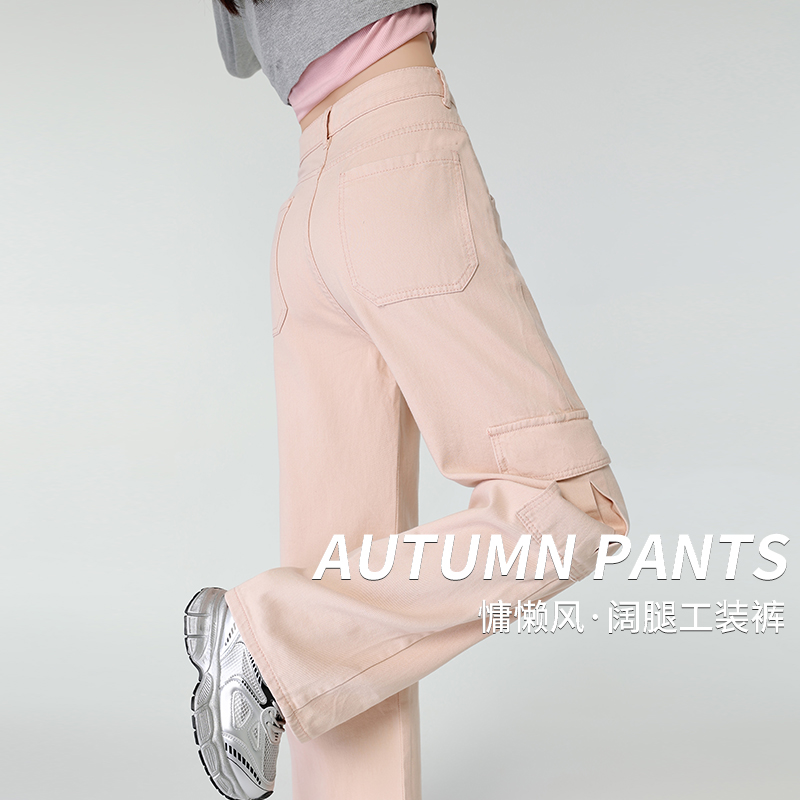 加柔水洗全棉布美式高街粉色工装裤女春秋款小个子阔腿裤 服裝批發女裝批發服飾貨源